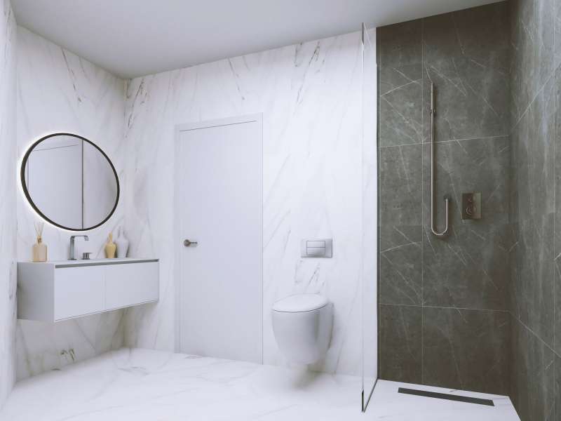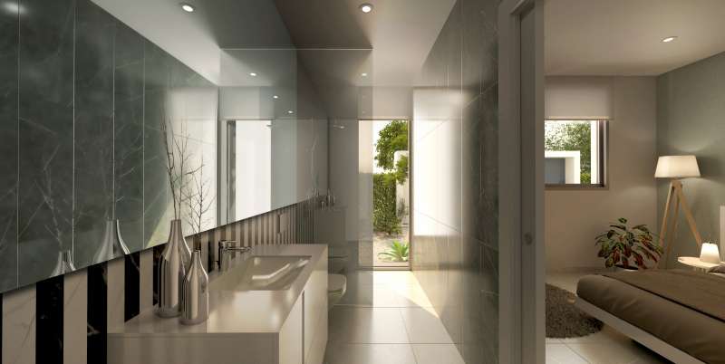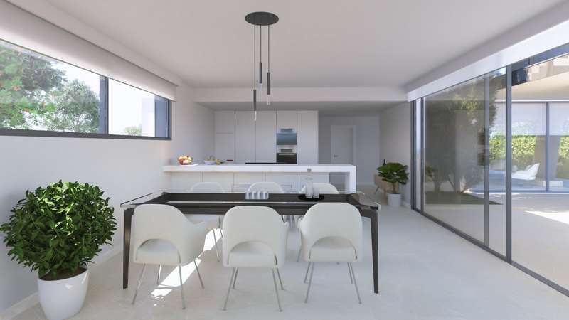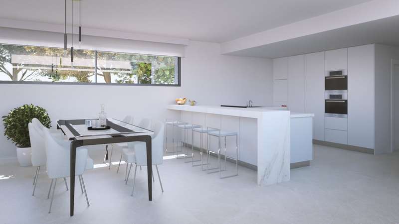 The villas come in various bedroom layouts, each designed to the highest standards, featuring fully equipped kitchens with Bosch appliances and elegant Silestone quartz countertops. The bathrooms are equipped with walk-in showers, modern-design sinks, mirrors, and ambient LED lighting throughout. Additionally, the garden area includes an exterior shower, a generously sized heated swimming pool (depending on style choice), and lush green surroundings. The villas are built upon request, with an estimated delivery time of 16 months.