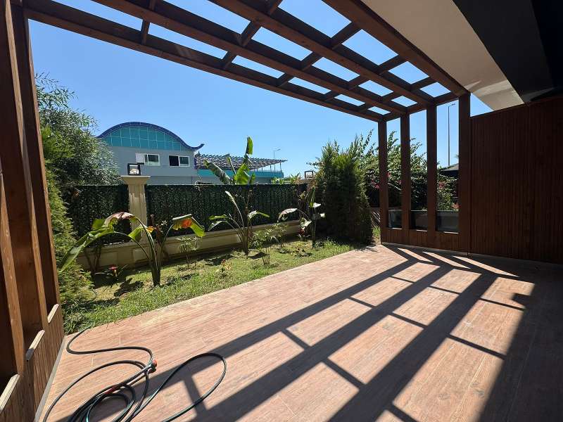 The duplex apartment includes a private garden area. It will be delivered with a steel entrance door, PVC windows, a fitted kitchen, a countertop, and a shower cabin.