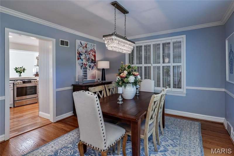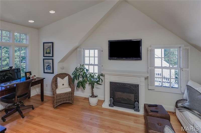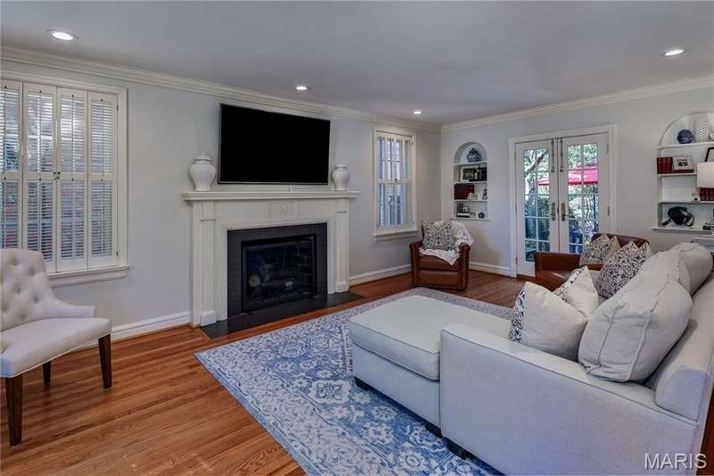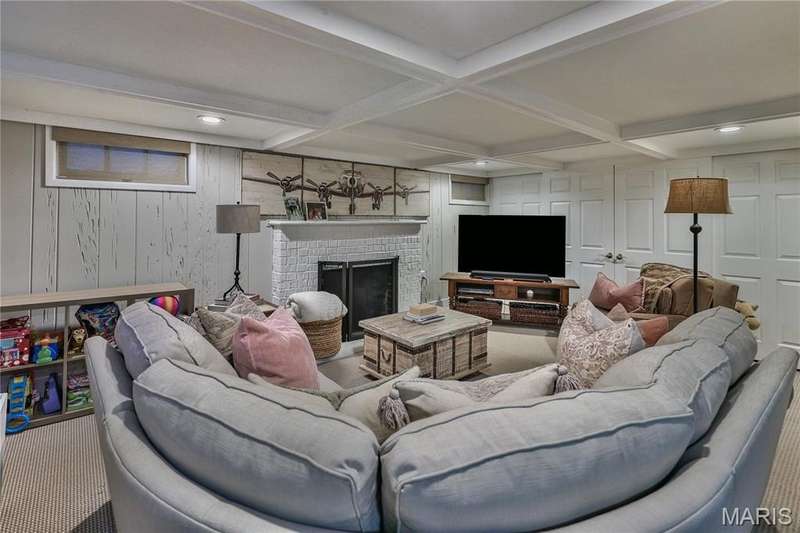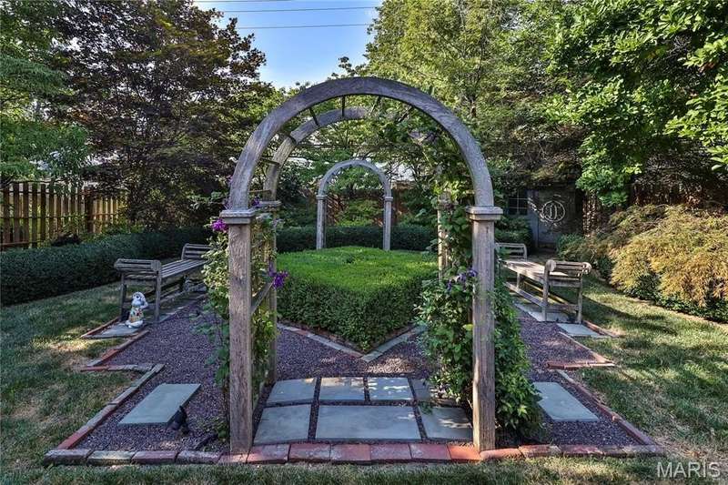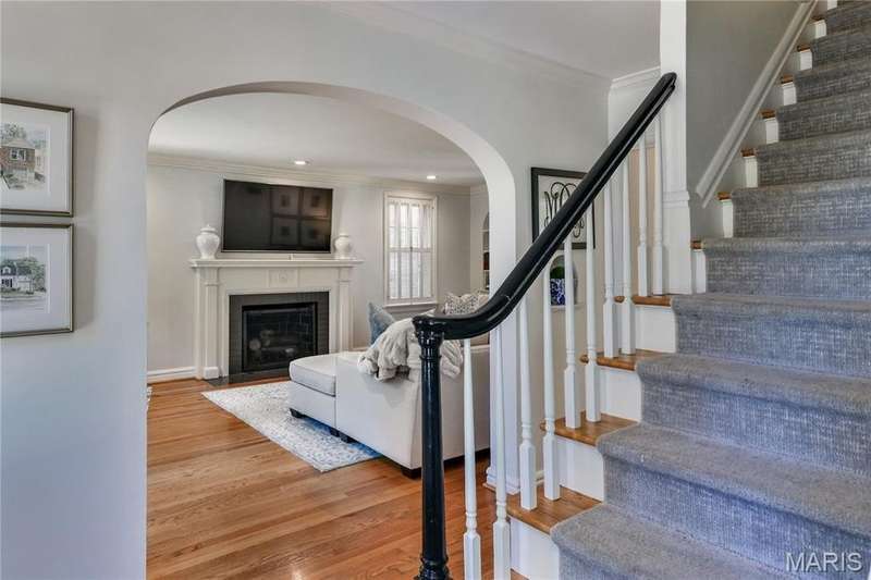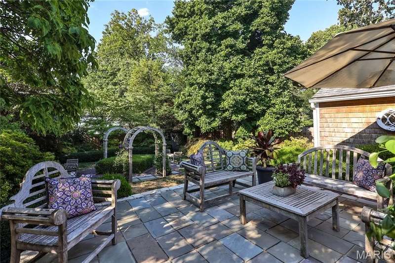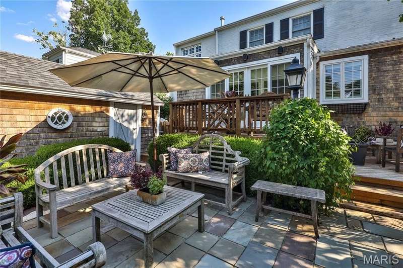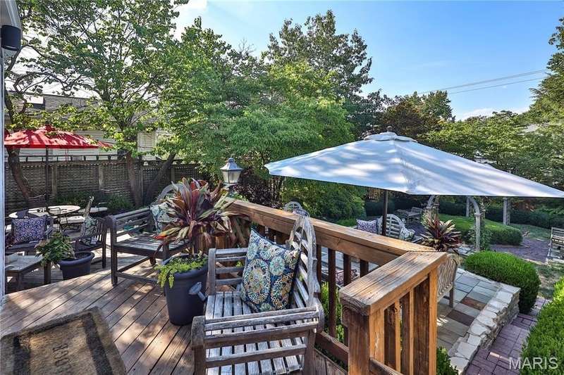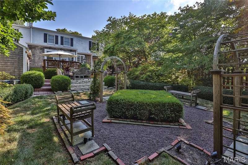 This charming, picturesque home in Warson Woods has been beautifully updated and meticulously maintained, blending timeless elegance with exceptional curb appeal. The inviting brick walk and driveway, custom window boxes, and an attached carriage-style garage, create a warm first impression. The enchanting backyard is a true retreat, featuring an expansive tiered deck, flagstone patio, barn and potting sheds, plus weathered wood arches and benches (all included in the sale) set amidst lush, sculpted gardens ideal for relaxing or entertaining. Inside, hardwood floors, crown and base molding, and graceful archways lend warmth and flow throughout the main level. The spacious, sunlit living room offers built-in bookshelves, a fireplace, and French doors that lead outside. The dining room, highlighted by a Pottery Barn crystal chandelier, opens to the stunning 2020-renovated kitchen/breakfast room with quartz countertops and backsplash, GE Cafe stainless appliances, RH hardware, three skylights, and French doors to the deck. A full bath completes the main level. Upstairs, the primary bedroom includes a serene step-down sitting room with fireplace. Two additional bedrooms and a stylishly updated full bath complete the second floor. The finished lower level offers a cozy family room with fireplace, laundry area, and storage. Fireplaces convey “as-is.”
