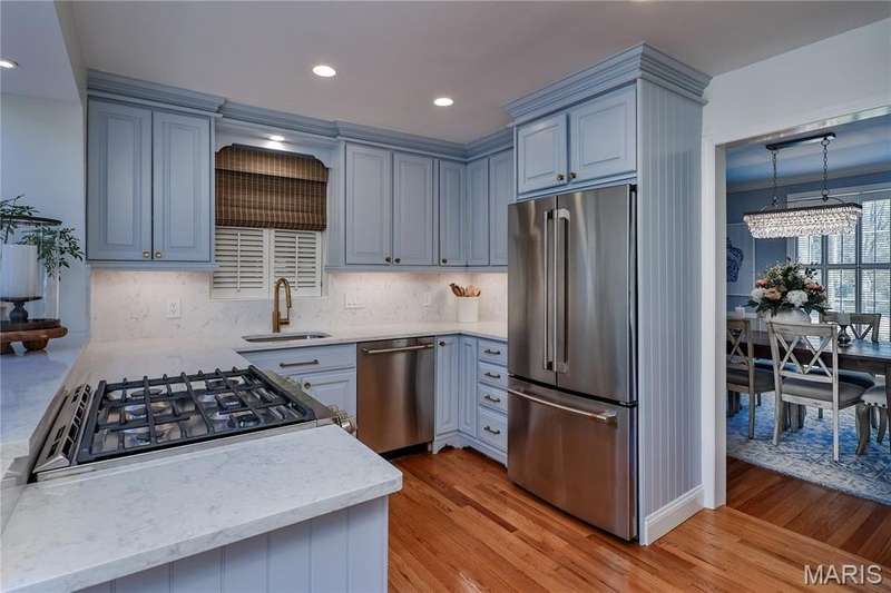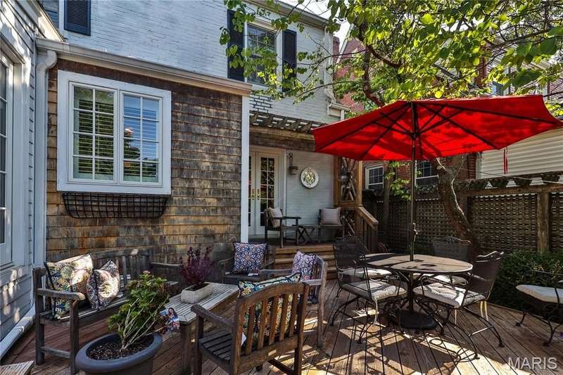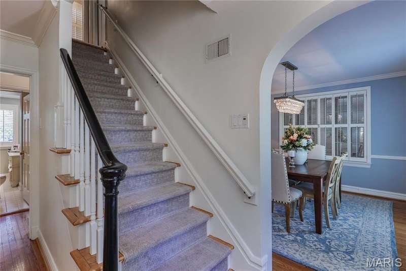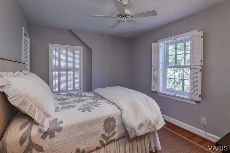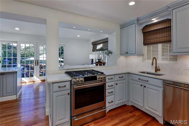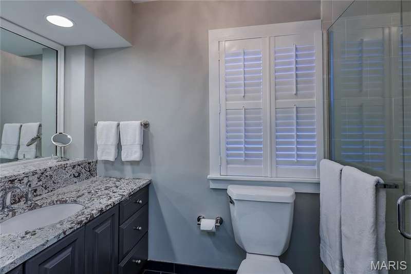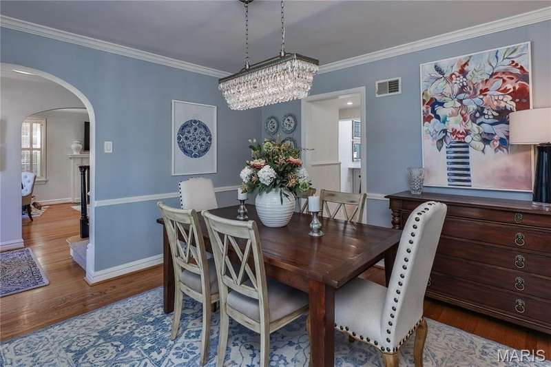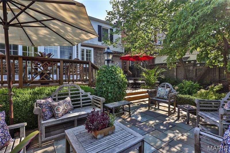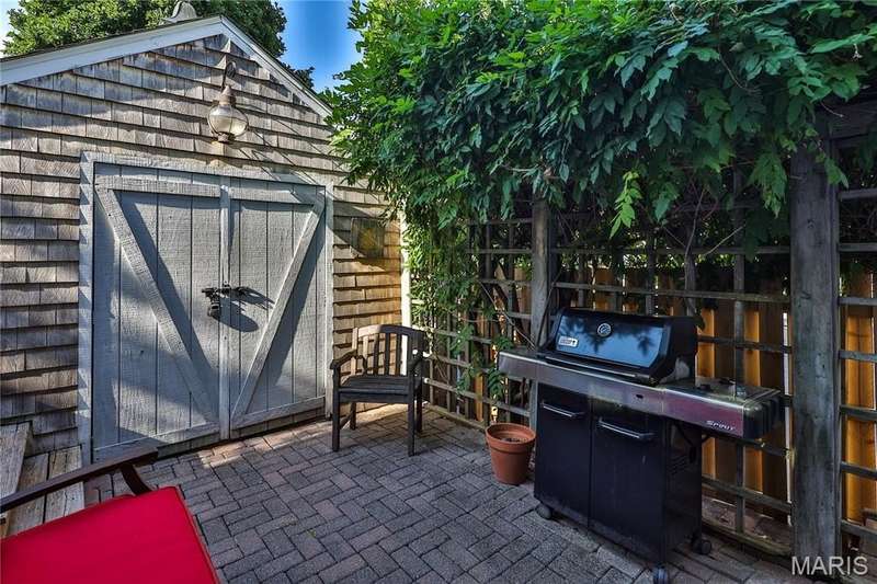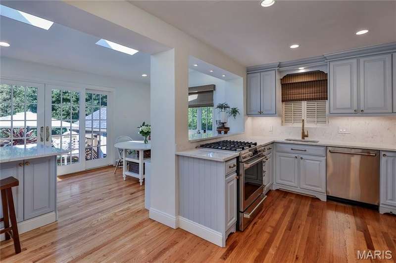 This charming, picturesque home in Warson Woods has been beautifully updated and meticulously maintained, blending timeless elegance with exceptional curb appeal. The inviting brick walk and driveway, custom window boxes, and an attached carriage-style garage, create a warm first impression. The enchanting backyard is a true retreat, featuring an expansive tiered deck, flagstone patio, barn and potting sheds, plus weathered wood arches and benches (all included in the sale) set amidst lush, sculpted gardens ideal for relaxing or entertaining. Inside, hardwood floors, crown and base molding, and graceful archways lend warmth and flow throughout the main level. The spacious, sunlit living room offers built-in bookshelves, a fireplace, and French doors that lead outside. The dining room, highlighted by a Pottery Barn crystal chandelier, opens to the stunning 2020-renovated kitchen/breakfast room with quartz countertops and backsplash, GE Cafe stainless appliances, RH hardware, three skylights, and French doors to the deck. A full bath completes the main level. Upstairs, the primary bedroom includes a serene step-down sitting room with fireplace. Two additional bedrooms and a stylishly updated full bath complete the second floor. The finished lower level offers a cozy family room with fireplace, laundry area, and storage. Fireplaces convey “as-is.”
