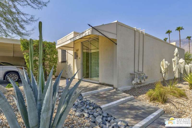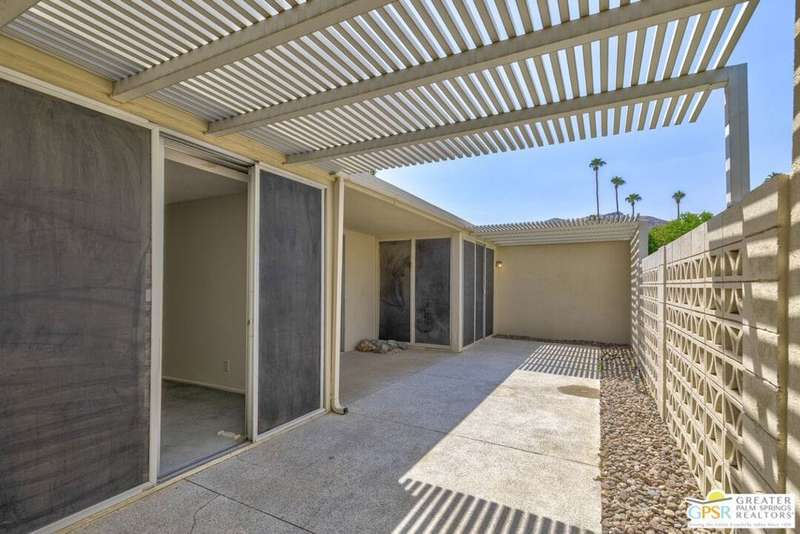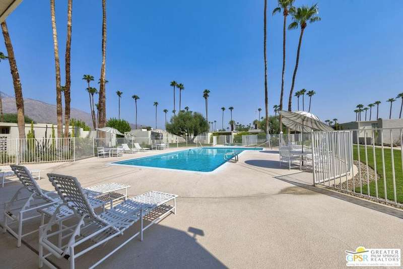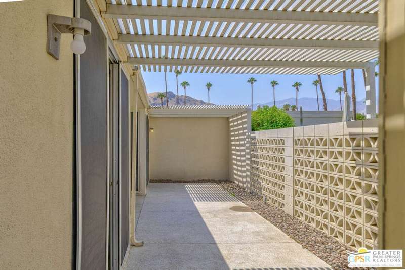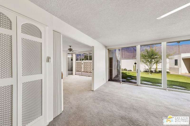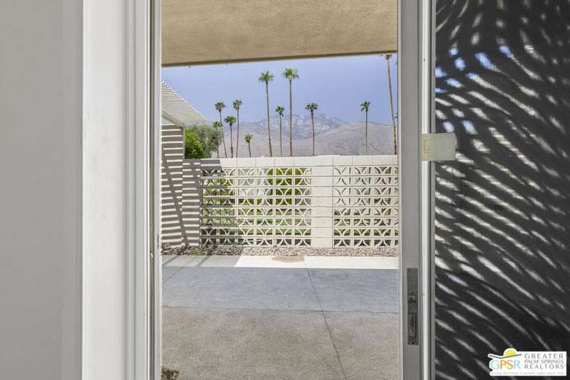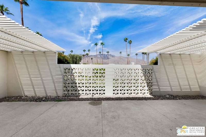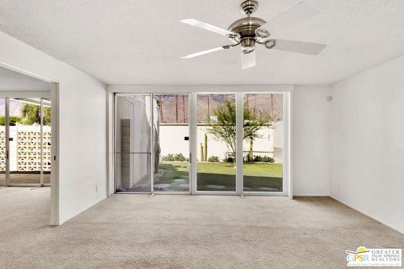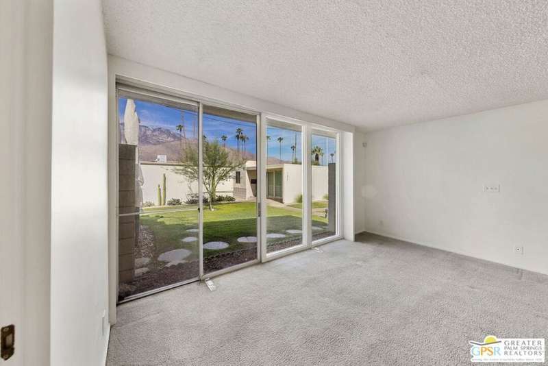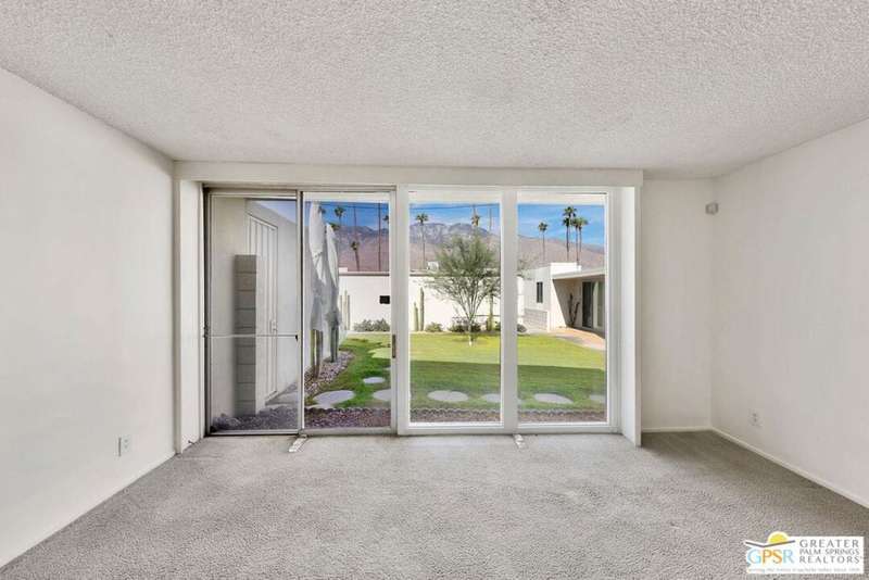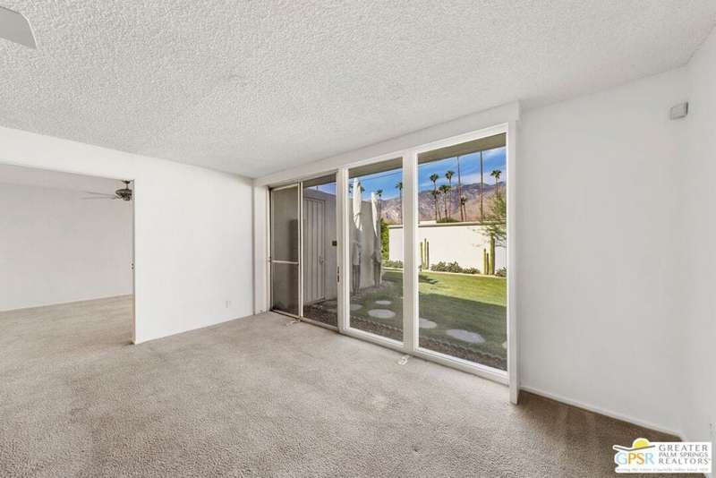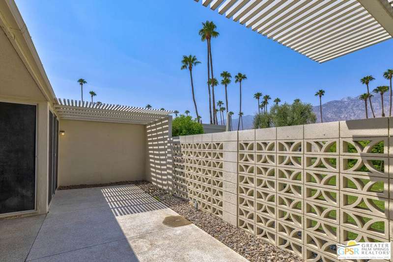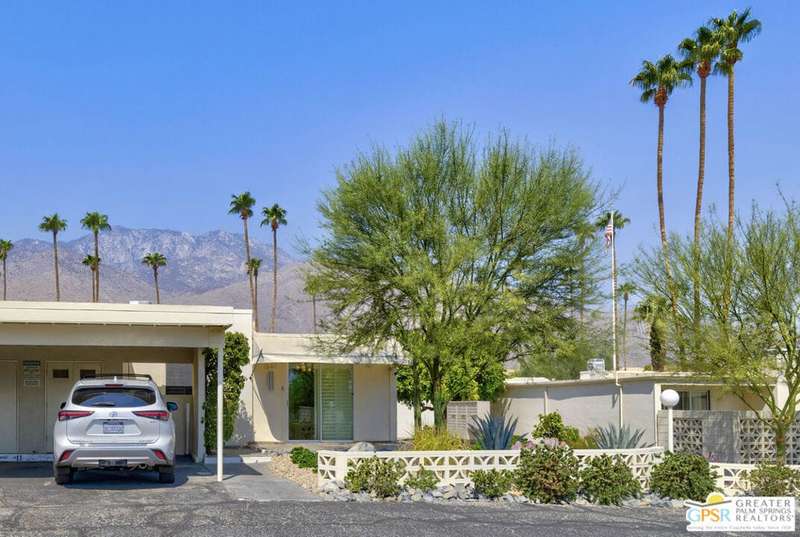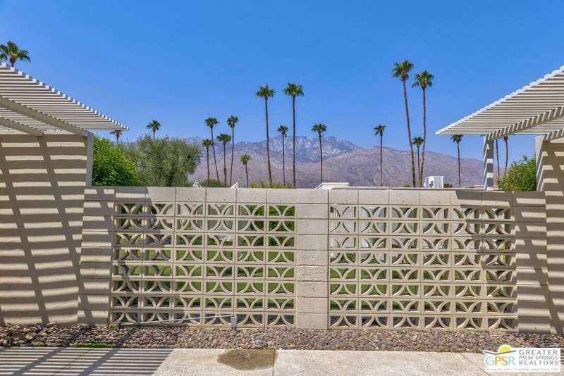 Welcome to Sandcliff, a nationally recognized historic community featuring timeless 1964 Desert Modern architecture by renowned designer Sherwin L. Barton. This 2BR/2BA plus den home offers 1,821 sq ft of single-story living with breathtaking western views of Mount San Jacinto from nearly every room. Enter from your dedicated carport (with two storage spaces) to discover an open-concept layout flowing effortlessly from the kitchen with bar seating through dining area to spacious living room. Sliding glass doors provide easy access to community green space, while the adjacent den and both bedrooms open directly to your expansive private west-facing patio enclosed by classic breeze block walls. The well-appointed kitchen flows naturally into the dining and living areas, perfect for entertaining. A large walk-in pantry and ample storage closets line the main hallway, alongside a bright guest bathroom featuring skylight and walk-in shower. The primary suite showcases a dramatic skylight, updated bathroom with walk-in shower, and convenient in-suite laundry area. Nestled in South Palm Springs, this intimate 40-unit community offers two stunning 40-foot pools with spas and loggias, beautifully landscaped grounds, and the sophisticated desert lifestyle that made Palm Springs famous. HOA fee of $575/month includes maintenance of common grounds, pool and spa, mailbox, and building exterior. At $550K ($302/sqft), this FEE land property presents exceptional value for buyers ready to move in immediately or add their personal touch to this historic gem. The combination of stellar location, historical significance, mountain views, huge private patio, and resort-style amenities creates an unmatched opportunity in today's market. Perfect for those seeking authentic mid-century modern living with room to customize and grow. Don't miss your chance to own a piece of Palm Springs history!
