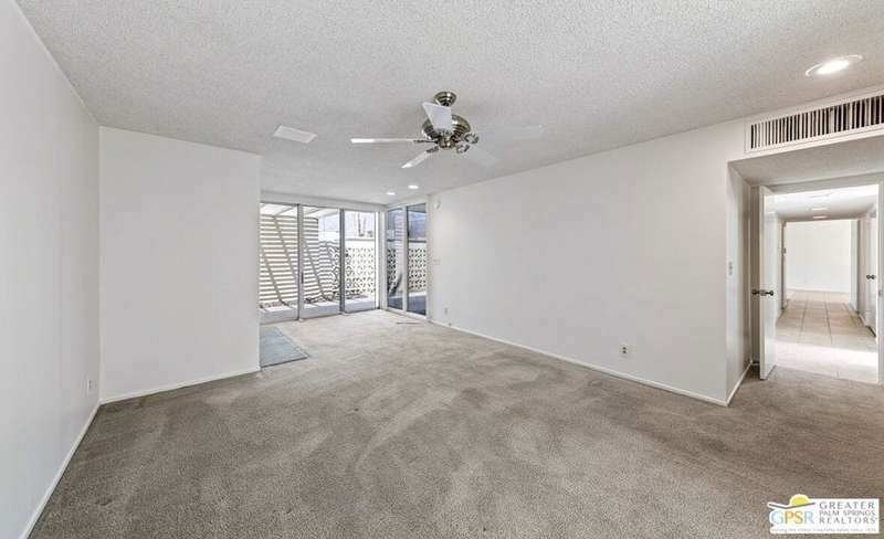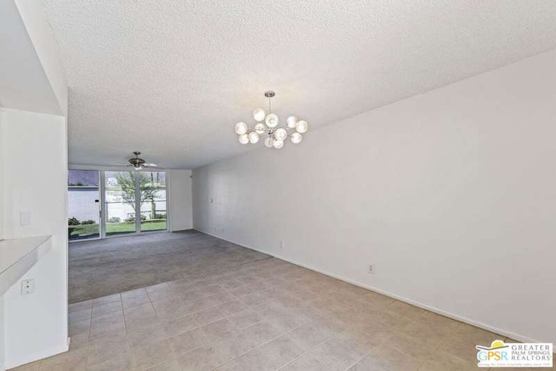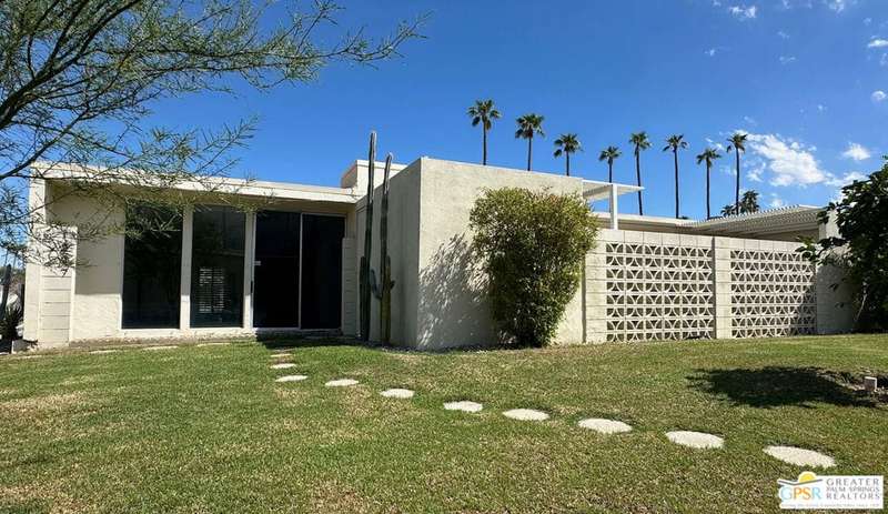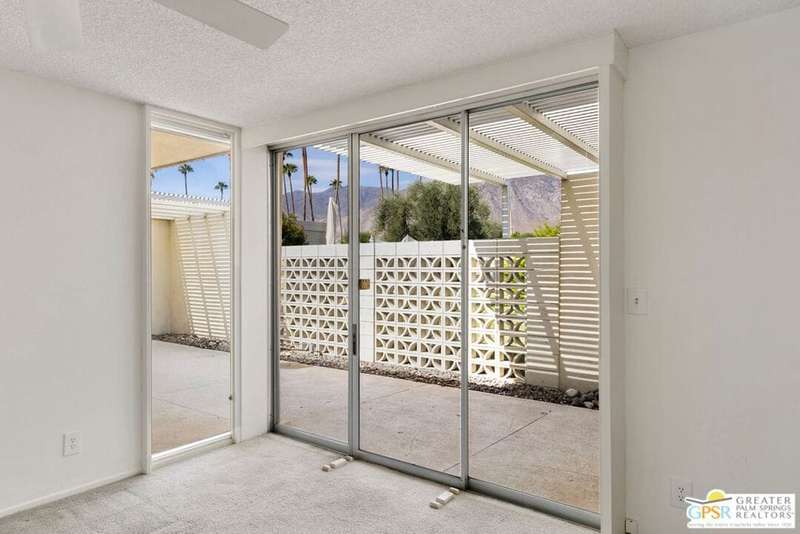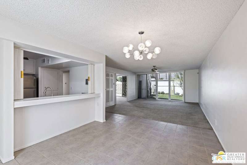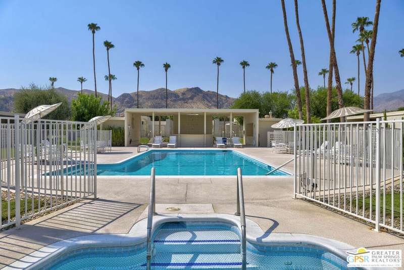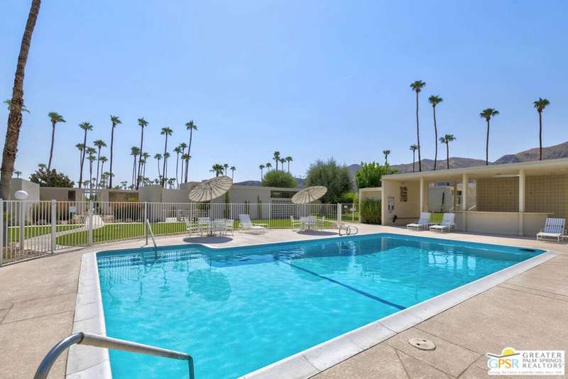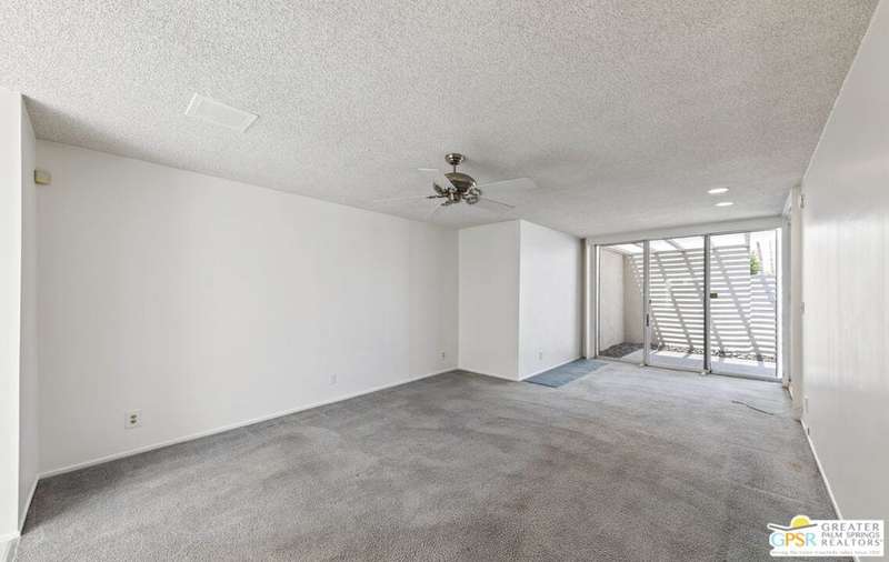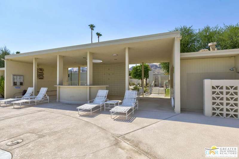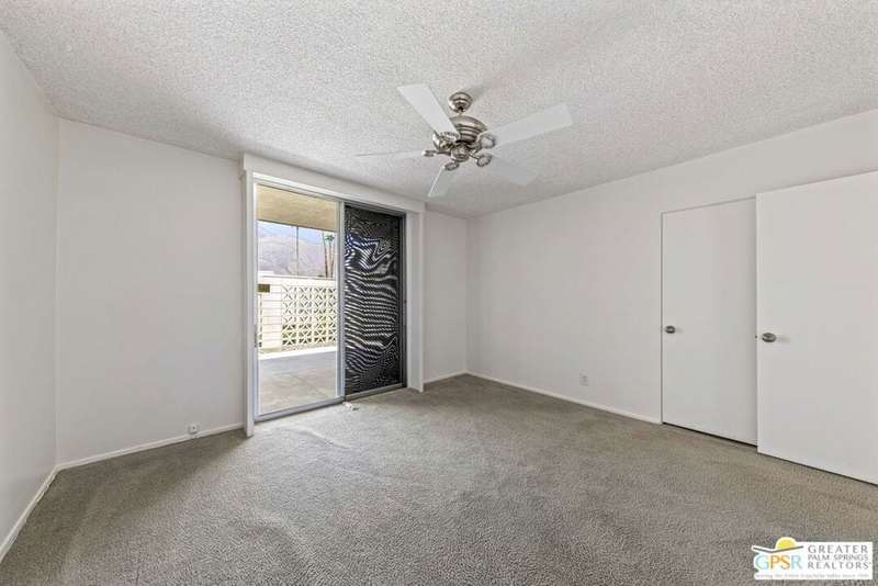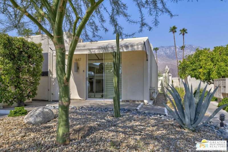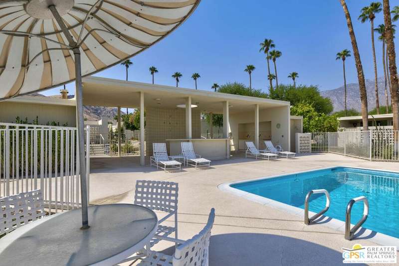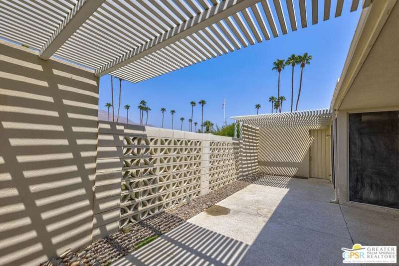 Welcome to Sandcliff, a nationally recognized historic community featuring timeless 1964 Desert Modern architecture by renowned designer Sherwin L. Barton. This 2BR/2BA plus den home offers 1,821 sq ft of single-story living with breathtaking western views of Mount San Jacinto from nearly every room. Enter from your dedicated carport (with two storage spaces) to discover an open-concept layout flowing effortlessly from the kitchen with bar seating through dining area to spacious living room. Sliding glass doors provide easy access to community green space, while the adjacent den and both bedrooms open directly to your expansive private west-facing patio enclosed by classic breeze block walls. The well-appointed kitchen flows naturally into the dining and living areas, perfect for entertaining. A large walk-in pantry and ample storage closets line the main hallway, alongside a bright guest bathroom featuring skylight and walk-in shower. The primary suite showcases a dramatic skylight, updated bathroom with walk-in shower, and convenient in-suite laundry area. Nestled in South Palm Springs, this intimate 40-unit community offers two stunning 40-foot pools with spas and loggias, beautifully landscaped grounds, and the sophisticated desert lifestyle that made Palm Springs famous. HOA fee of $575/month includes maintenance of common grounds, pool and spa, mailbox, and building exterior. At $550K ($302/sqft), this FEE land property presents exceptional value for buyers ready to move in immediately or add their personal touch to this historic gem. The combination of stellar location, historical significance, mountain views, huge private patio, and resort-style amenities creates an unmatched opportunity in today's market. Perfect for those seeking authentic mid-century modern living with room to customize and grow. Don't miss your chance to own a piece of Palm Springs history!