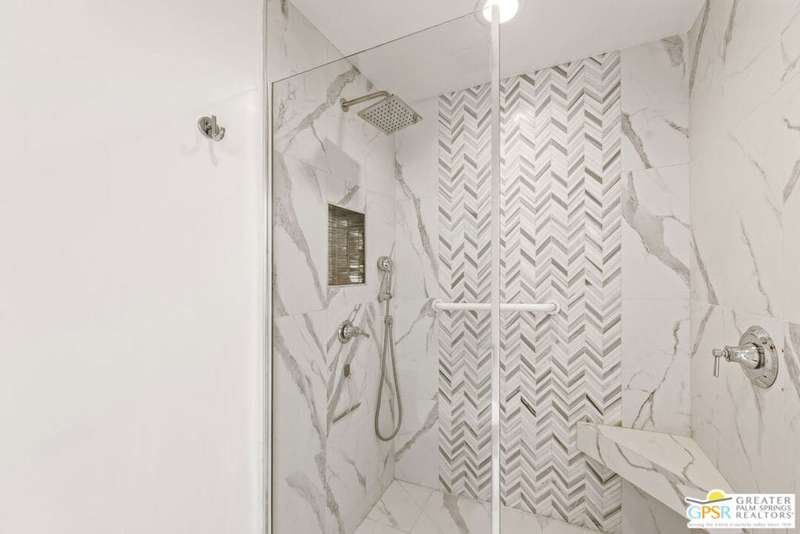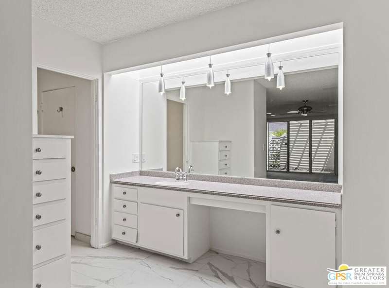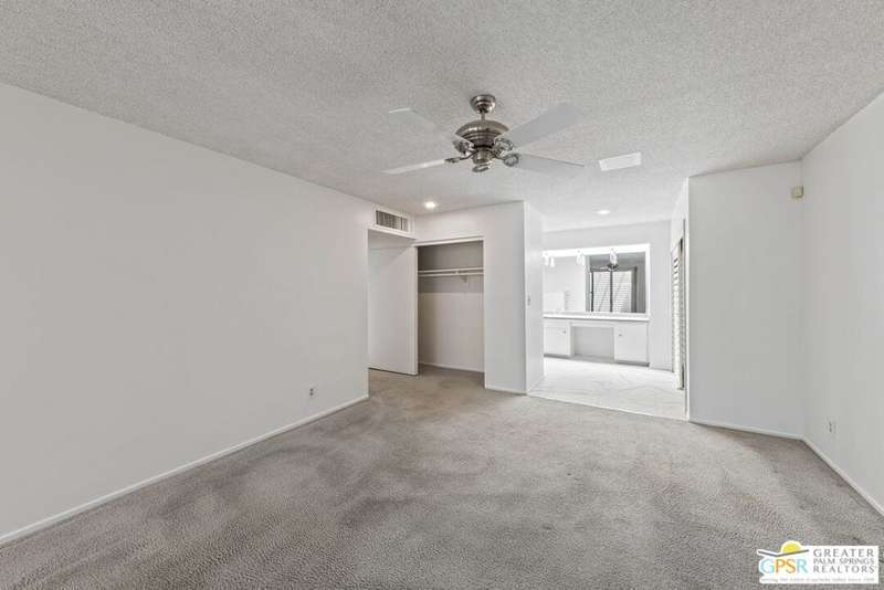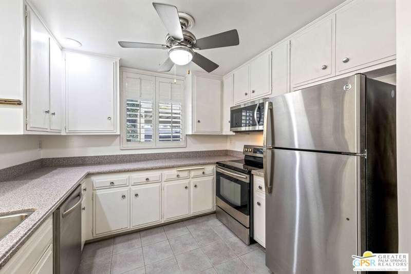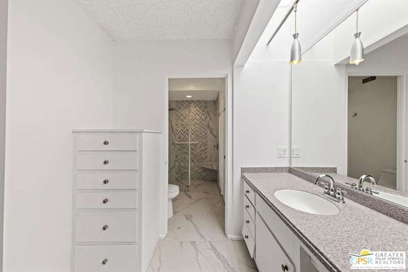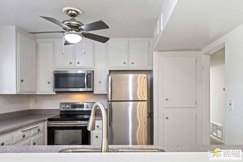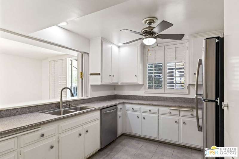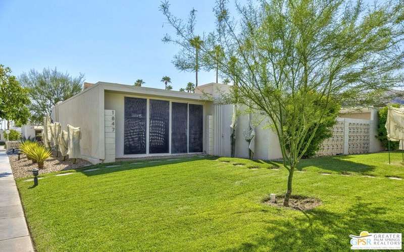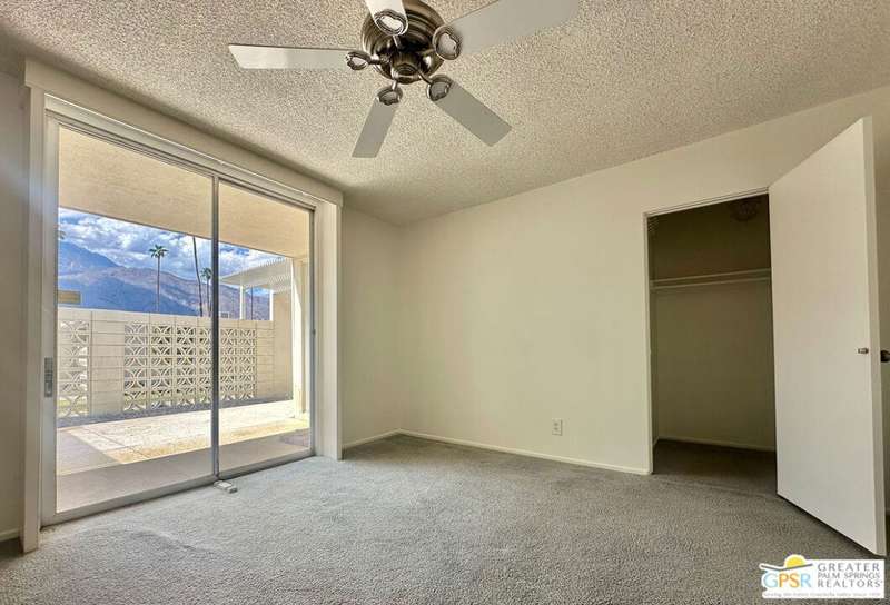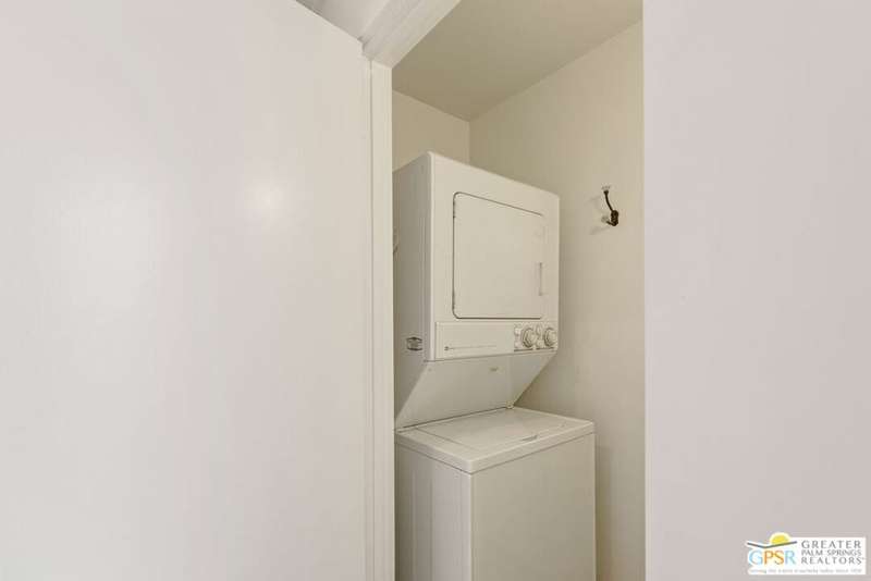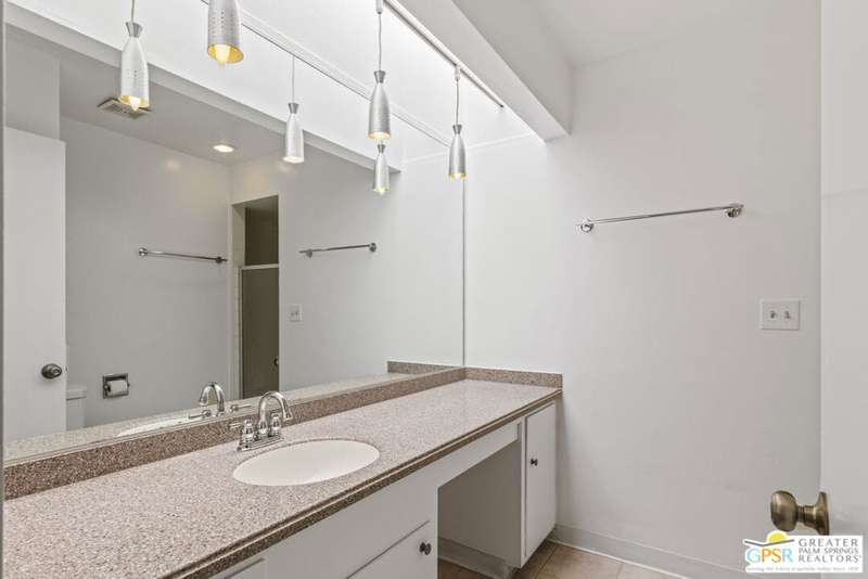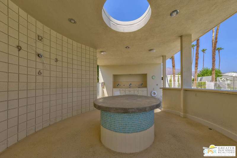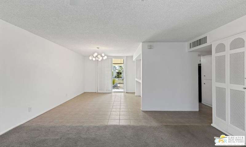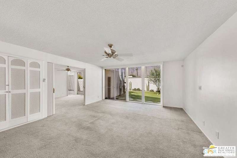Welcome to Sandcliff, a nationally recognized historic community featuring timeless 1964 Desert Modern architecture by renowned designer Sherwin L. Barton. This 2BR/2BA plus den home offers 1,821 sq ft of single-story living with breathtaking western views of Mount San Jacinto from nearly every room. Enter from your dedicated carport (with two storage spaces) to discover an open-concept layout flowing effortlessly from the kitchen with bar seating through dining area to spacious living room. Sliding glass doors provide easy access to community green space, while the adjacent den and both bedrooms open directly to your expansive private west-facing patio enclosed by classic breeze block walls. The well-appointed kitchen flows naturally into the dining and living areas, perfect for entertaining. A large walk-in pantry and ample storage closets line the main hallway, alongside a bright guest bathroom featuring skylight and walk-in shower. The primary suite showcases a dramatic skylight, updated bathroom with walk-in shower, and convenient in-suite laundry area. Nestled in South Palm Springs, this intimate 40-unit community offers two stunning 40-foot pools with spas and loggias, beautifully landscaped grounds, and the sophisticated desert lifestyle that made Palm Springs famous. HOA fee of $575/month includes maintenance of common grounds, pool and spa, mailbox, and building exterior. At $550K ($302/sqft), this FEE land property presents exceptional value for buyers ready to move in immediately or add their personal touch to this historic gem. The combination of stellar location, historical significance, mountain views, huge private patio, and resort-style amenities creates an unmatched opportunity in today's market. Perfect for those seeking authentic mid-century modern living with room to customize and grow. Don't miss your chance to own a piece of Palm Springs history!