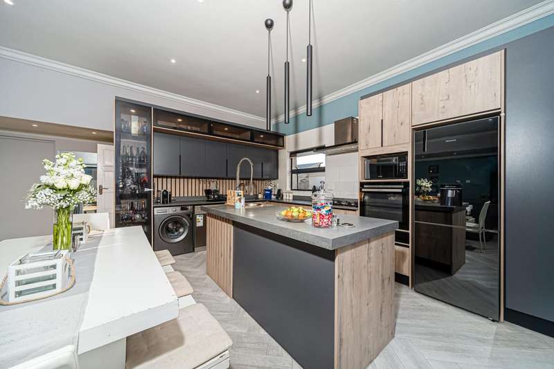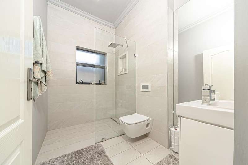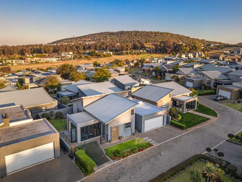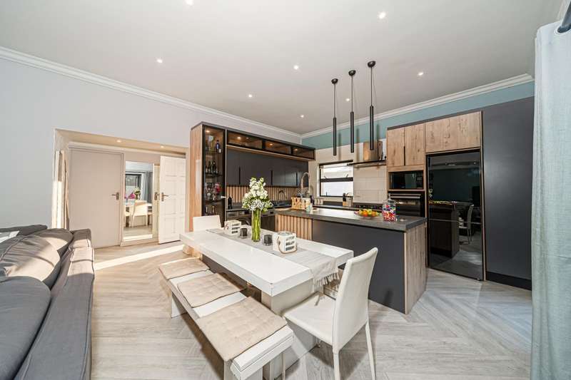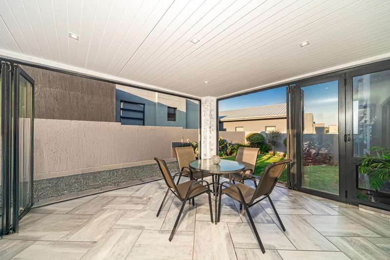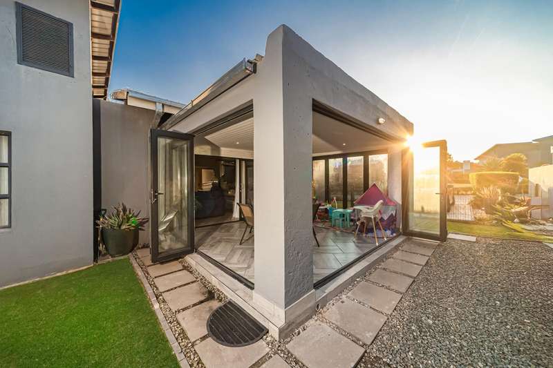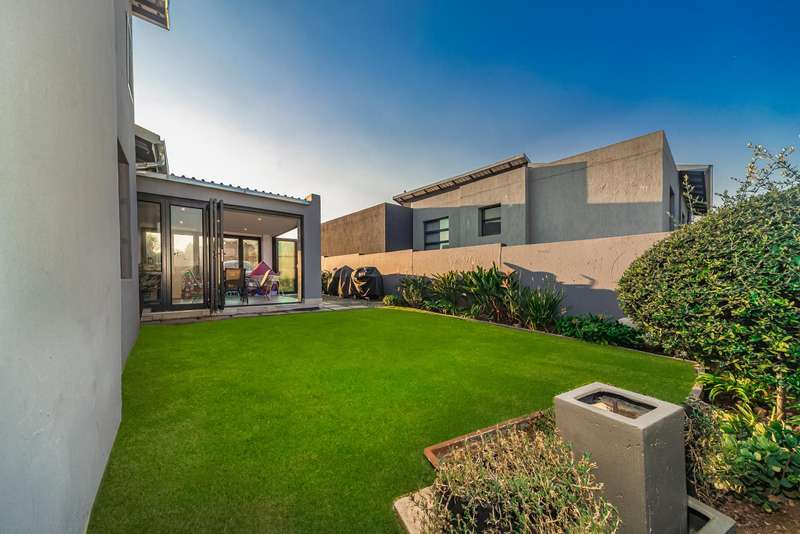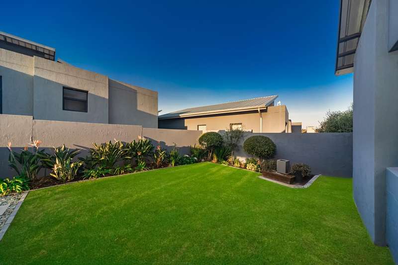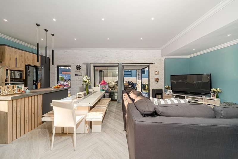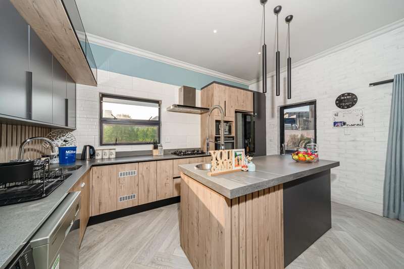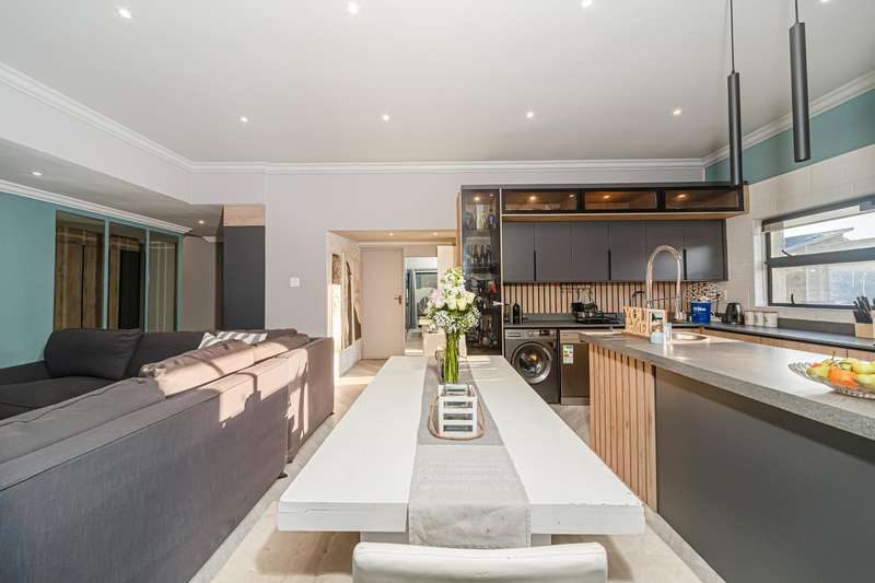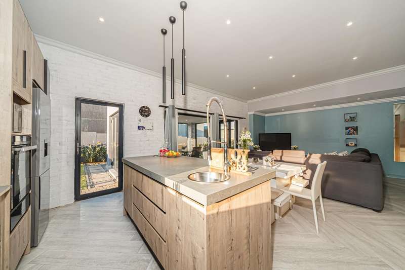 Welcome to a contemporary gem that perfectly blends refined design and family-friendly functionality, nestled in one of the most sought-after secure estates. Spanning 180sqm of internal space on a 367sqm stand, this single-storey masterpiece boasts clean architectural lines, a modern mono-pitch roofline, and a striking street presence. Step inside to a seamless open-plan layout where natural light pours through large aluminium-framed windows and stackable doors. The designer kitchen is the heart of the home?Çöanchored by a bold centre island with pendant lighting, two-tone cabinetry, integrated appliances, and soft wood finishes that exude Scandinavian sophistication. Just off the kitchen lies a built-in study nook, cleverly concealed within custom cabinetry?Çöideal for remote work or quiet focus. The spacious dining and living area flows effortlessly onto a fully enclosed entertainment room, complete with sleek stack-back doors that extend your indoor space into a manicured private garden?Çöperfect for hosting or winding down in style. Accommodation includes three well-appointed bedrooms and two ultra-modern bathrooms. The primary suite is a calming sanctuary, complemented by a walk-in wardrobe and an exquisite en-suite bathroom adorned in crisp marble-look tiling and matte black accents. This home also offers a double garage with direct access, an inverter system for uninterrupted living, and stylish herringbone flooring that enhances its designer edge throughout. Modern, low-maintenance, and meticulously finished?Çöthis is a home that speaks to the discerning buyer looking for security, style, and seamless living in an elite estate setting.