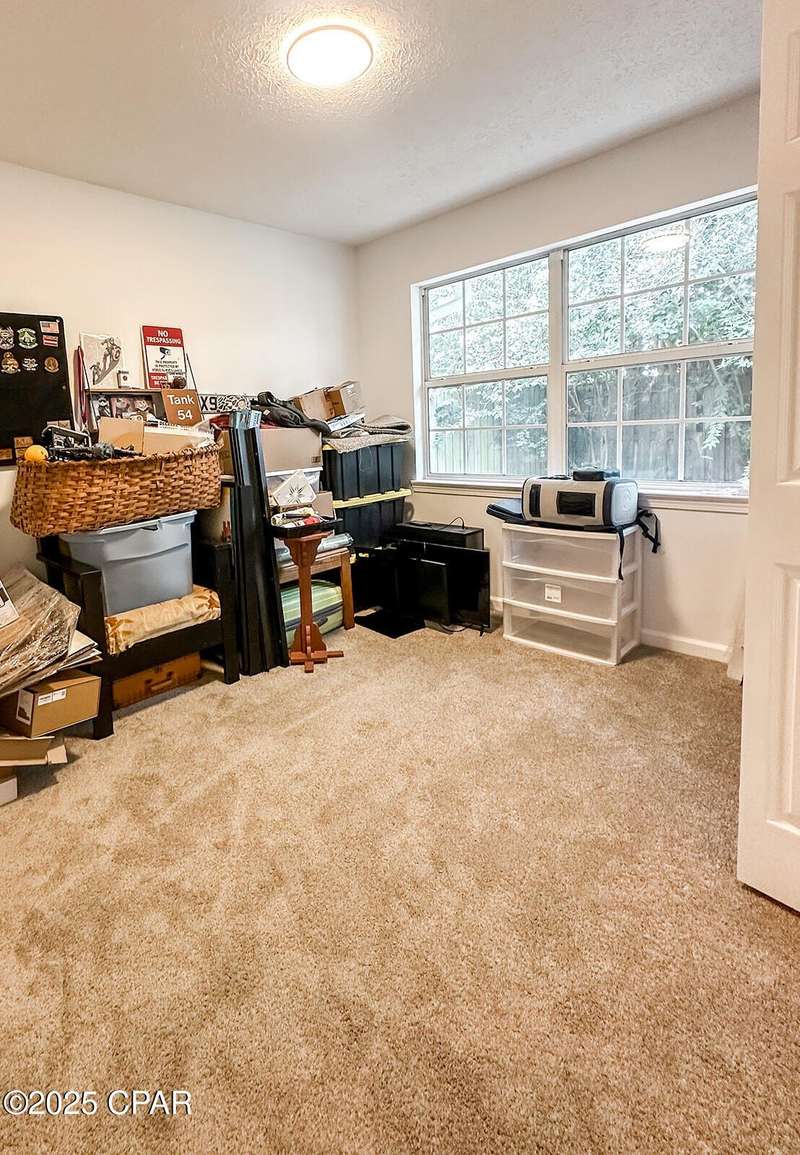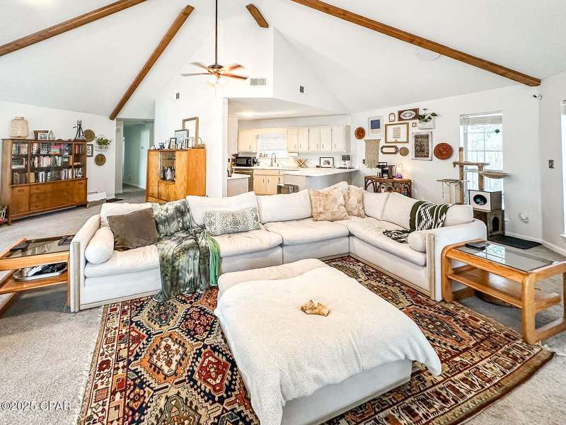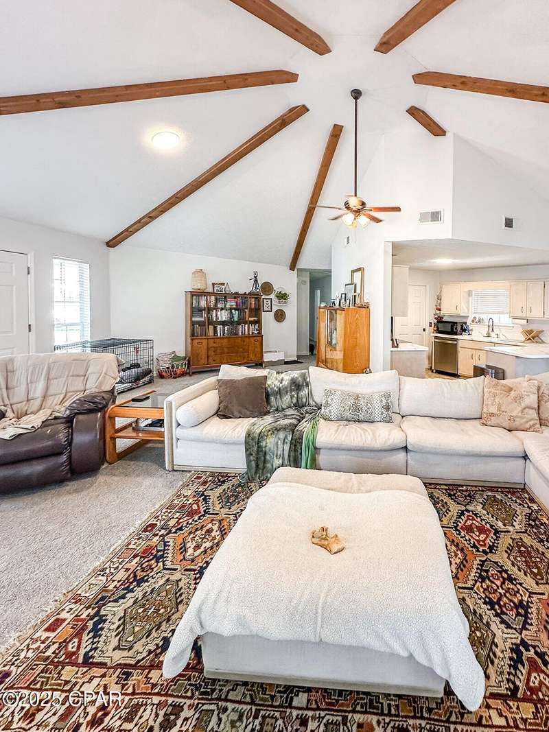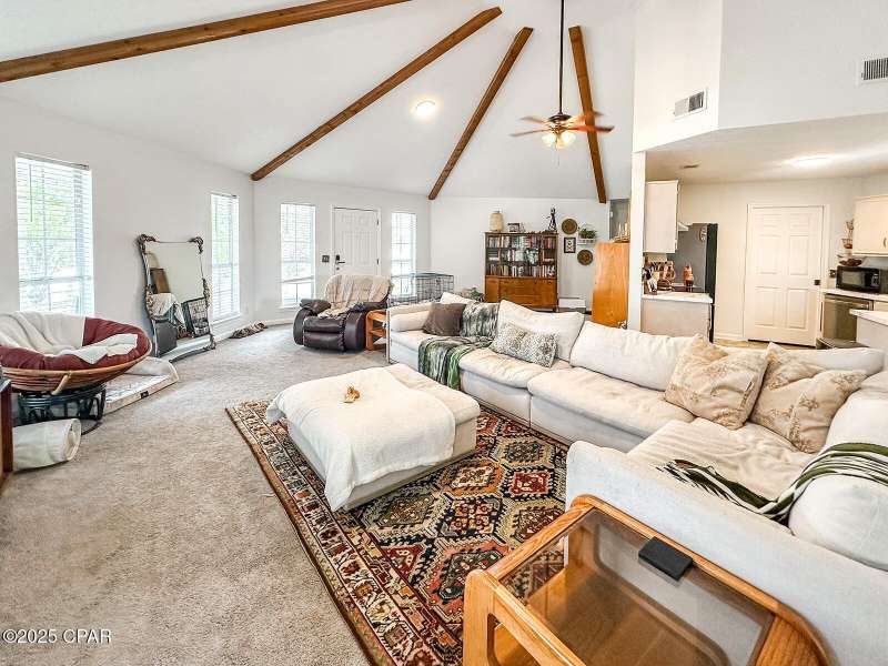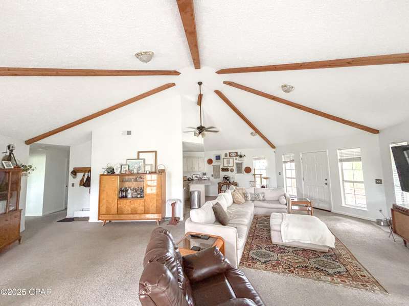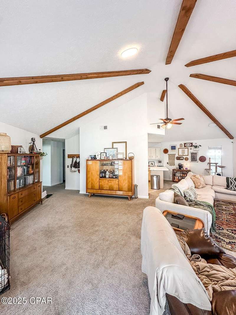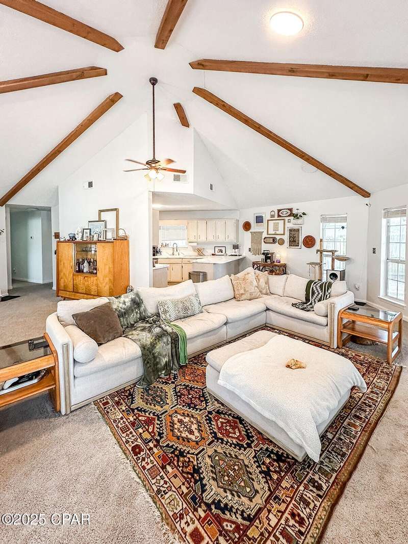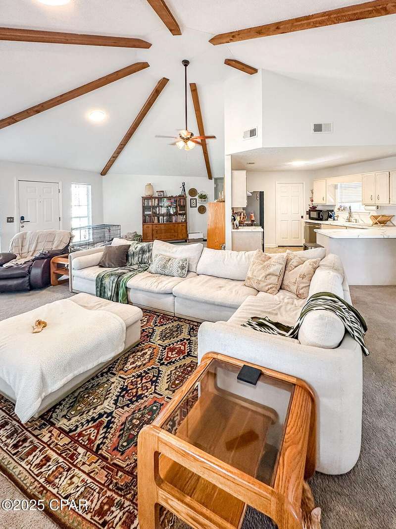 This cozy corner-lot home that is nestled at the junction of Pattho and Lynwood Lanes, offers a wonderful blend of privacy, convenience, and flexible living. The open, spacious living area features a vaulted ceiling with exposed beams. Inside, the home is in great shape with freshly painted interiors and well-maintained finishes. A brand-new heat and air system was installed in 2023 and the roof was replaced in 2018. Outside, you'll find a large driveway with space for multiple vehicles, a boat, or an RV, plus a metal storage building. Tall trees and shrubs offer an abundance of privacy.The location is outstanding: walking distance to Mowat Middle School, just steps from Winn-Dixie shopping, and with easy access to Hwy 77 and Hwy 390.