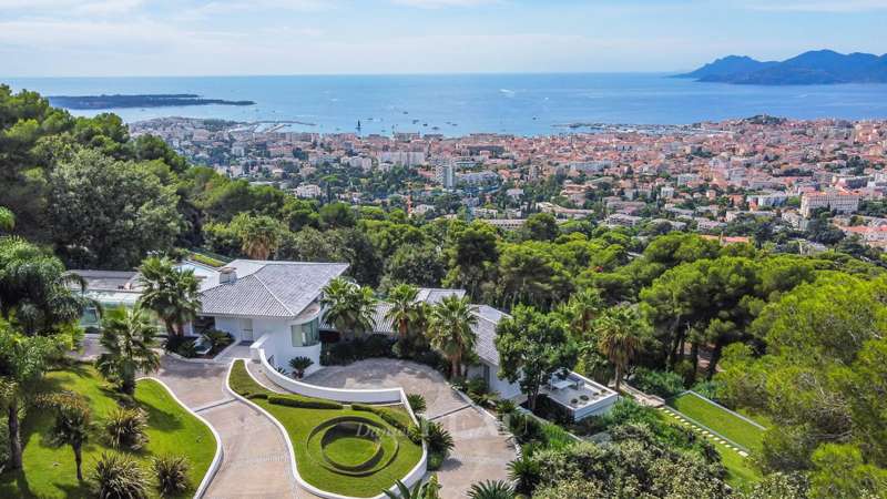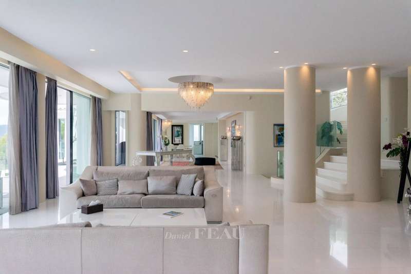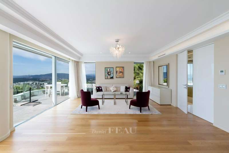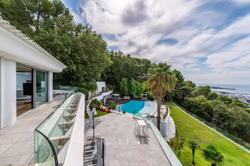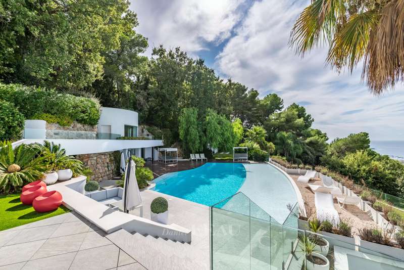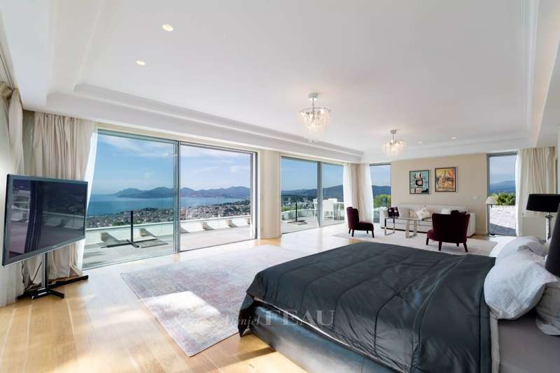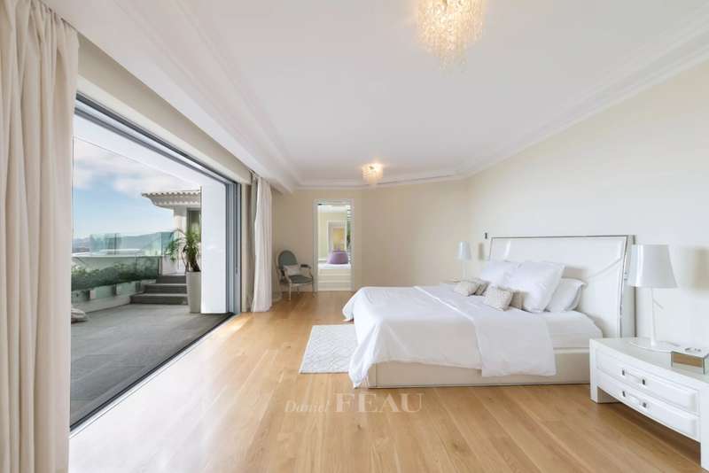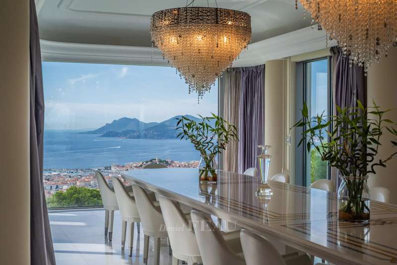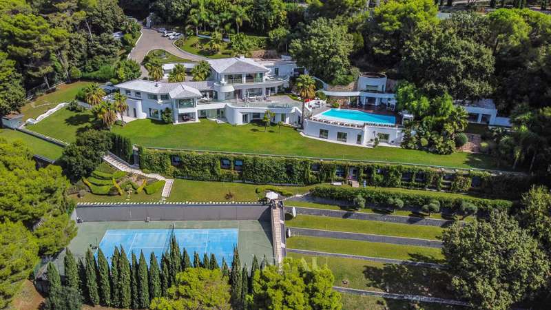 This exceptional property offering 2035 sqm of floor space and 1325 sqm of living space is in a secure residential neighbourhood in an elevated setting commanding a picture-postcard view of Cannes Bay. Bathed in sunshine and benefiting from a unique architectural style blending into its environment, it is set in over 1.3 hectares of landscaped grounds featuring delightful paths, a tennis court bordered by cypress trees, relaxation areas and a swimming pool. Renovated throughout in 2014, featuring contemporary materials and beautifully appointed, it includes a very spacious entrance hall, a double living/reception room, a dining room, an equipped semi-professional kitchen with a pantry, and an immense terrace. The upper floor comprises two master suites opening onto terraces commanding sea views. Seven further suites enjoying sea views, a home cinema, a fitness area, a billiard room and a wine cellar are on the garden level. With a guest house including a living room, a kitchen, two suites and wide terraces, a 5-bed staff annex and a 12-car garage. A truly exceptional property.
