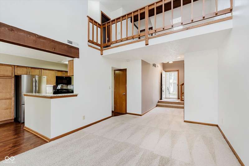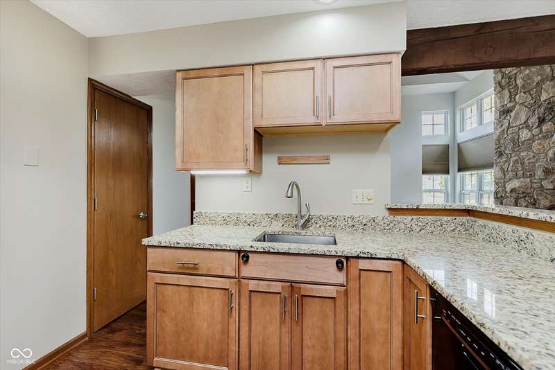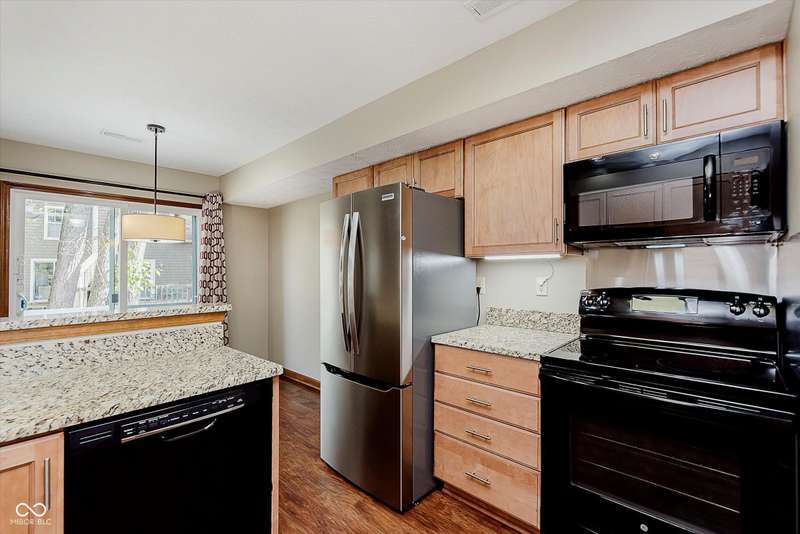 Fall in love with this end unit condo at Cobblestone. This waterfront gem overlooks a serene pond, along with mature trees and lush greens. Featuring two bedrooms, a two story great room, floor to ceiling stone, gas fireplace, open loft and the following updates - Deck, less than five years old, furnace and A/C unit - new in 2025, refrigerator, washer and dryer also new in 2025. Kitchen and bathroom(s) remodeled in 2015. Gutter guards added in 2024. The kitchen remodel boasts stylish cabinets, wood laminate flooring, granite counter tops and trending appliances. Bathroom remodels also include new cabinetry, wood laminate flooring, granite tops and a spacious walk in, ceramic tile shower.