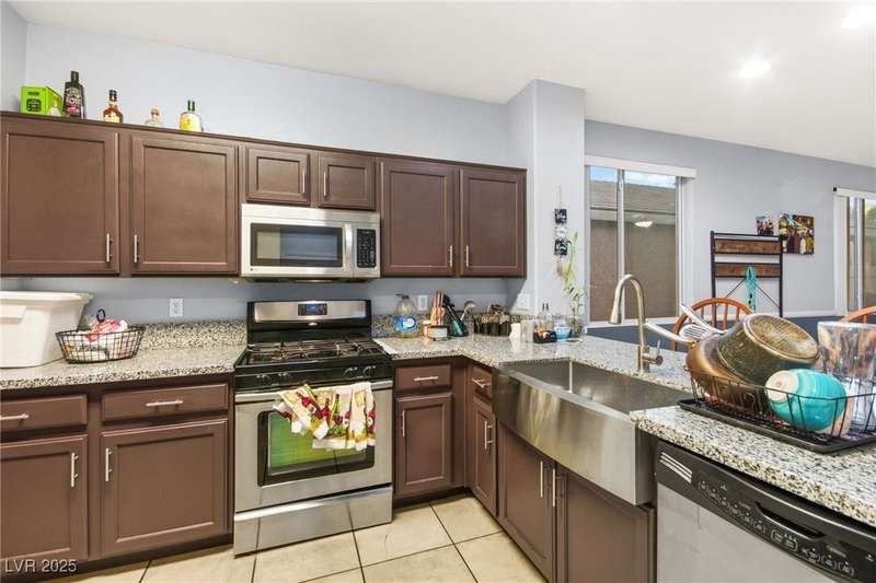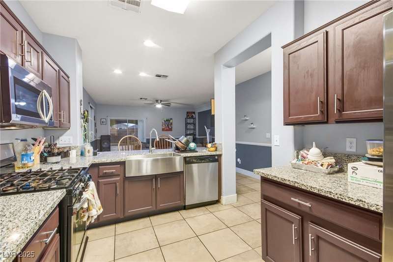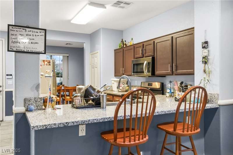 Charming residence offers 1,648 square feet of spacious, open-concept living designed for comfort and functionality. The inviting kitchen features energy-efficient appliances, rich dark wood cabinetry, and stunning granite countertops, perfect for everyday living and entertaining. The primary bedroom boasts a generous walk-in closet and an ensuite master bathroom, creating a relaxing private retreat. Additional highlights include a two-car garage and a covered backyard patio, ideal for enjoying shaded outdoor living. Situated on a generously sized lot, there’s ample space to create your dream pool and transform the yard into a private oasis — all while soaking in gorgeous mountain views. Located in the highly desirable Marion Lake Mead community, this home offers convenient access to shopping, dining, parks, restaurants, and so much more!
