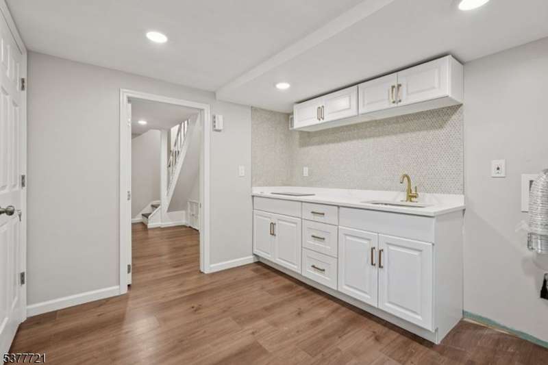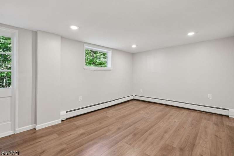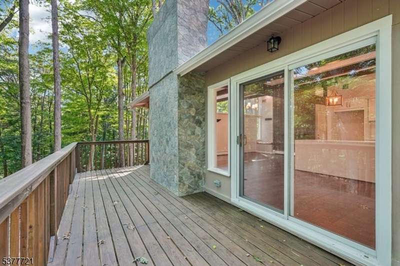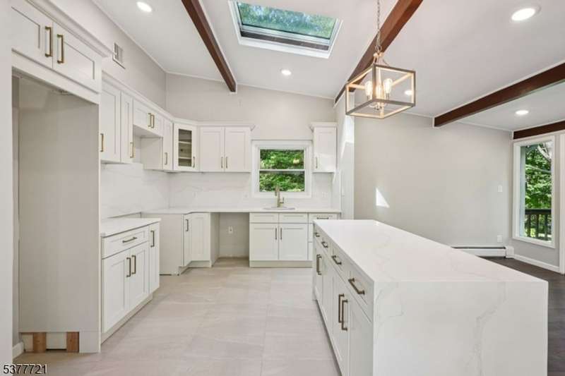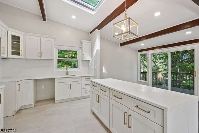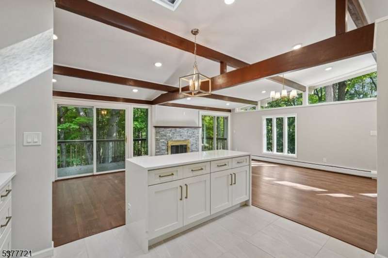 Welcome home to this beautifully renovated 4 bedroom, 3 bathroom Raised Ranch, perfectly nestled on a private wooded lot in the heart of Wayne. Step into the inviting entry foyer that opens to a bright, open-concept main living area. The living room boasts large windows, exposed wood beams, and a charming wood-burning fireplace, creating a warm and welcoming space for conversation and relaxation. Seamlessly flowing into the dining room, you'll find an elegant setting for intimate meals or lively gatherings, with sliding glass doors leading to a spacious rear deck ideal for outdoor entertaining, al fresco dining, and taking in stunning wooded views. The chef's kitchen is a showstopper, featuring custom cabinetry, marble countertops, wood beams, center island and a skylight that bathes the space in natural light. The first floor also offers a serene primary suite with ample closet space and a private bath, plus and 2 additional bedrooms and full bath. Downstairs, enjoy a versatile living area with a den, fourth bedroom, kitchenette, full bath, garage entrance, and walkout to the backyard. Gorgeous hardwood floors and rustic beams run throughout. The expansive yard provides endless opportunities for outdoor activities in a peaceful, natural setting. With a 2-car garage, ample parking, and a location close to NYC transportation, shopping, and dining, this home offers the perfect blend of modern comfort and tranquil retreat living.