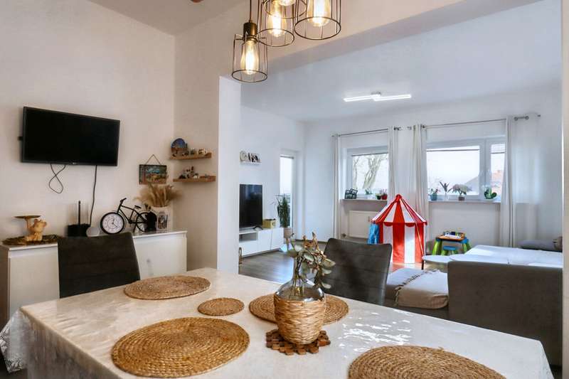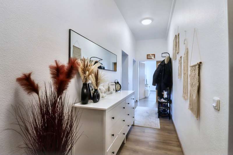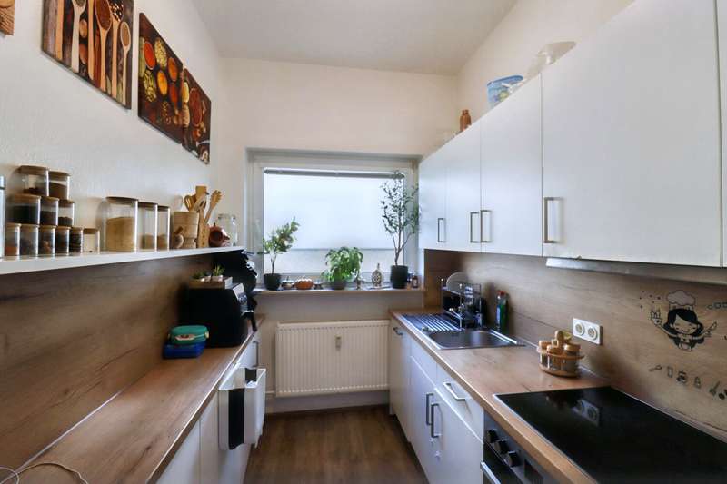 This well-kept condominium on the first floor is an attractive opportunity for anyone who wants to live close to the city center yet in a quiet location. The building, which was completed in 1972, impresses with its solid construction and has been regularly maintained. Particularly noteworthy is the comprehensive modernization from 2020, which included the installation of a high-quality vinyl floor and a modern fitted kitchen. With a generous living space of approx. 115 m² and a total of four rooms, the apartment offers enough space for different living situations - whether as a couple, family or shared flat. The well thought-out floor plan allows for an optimal layout of the rooms and a comfortable living experience. The heart of the apartment is the spacious living room with open-plan dining area, which offers plenty of space for spending time together. From here, you have access to the balcony, which, like the bedroom, offers a beautiful view of the greenery and creates additional outdoor space. The modern fitted kitchen, which was only installed in 2020, is equipped with all the necessary electrical appliances and offers plenty of storage space and work surfaces. The apartment has a total of three well-designed bedrooms. The daylight bathroom is equipped with a bathtub and a separate shower and invites you to relax. A separate guest WC completes the comfortable space. The uniformly laid, high-quality vinyl flooring ensures an appealing look and a pleasant atmosphere in all living spaces. Another practical feature is the covered parking space belonging to the apartment right next to the house, which provides convenient parking regardless of the weather. Additional storage space is provided by a cellar room, which can be used in a variety of ways. Shopping facilities are within walking distance, and other infrastructural facilities such as schools, kindergartens and medical care are in the immediate vicinity. The connection to the city center is ideal thanks to public transport and the nearby roads. These are just some of the special features of this bright apartment. See the possibilities for yourself during a personal viewing on site. We will be happy to provide you with further information and look forward to hearing from you.