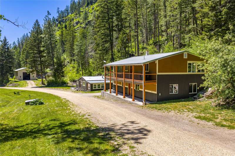 Tucked away on 10 private acres, this versatile property offers 3,012 total finished square feet of living space, plus a spacious 30x40 shop-ideal for hobbies, storage, or business use. The 5-bedroom, 2-bathroom main residence and separate 900-square-foot guest house sit just steps from your own stretch of O'Keefe Creek, creating a peaceful setting rich with wildlife and natural beauty. Thoughtfully updated, the main home includes generous storage throughout, while the guest house is fully equipped with its own kitchen and washer/dryer hookups- making it perfect for extended family, rental income, or a home office. Both homes feature durable metal roofs, and the guest house has recently received a fresh coat of exterior paint. Additional upgrades include a new septic system and designated RV access and storage. Whether you're looking to accommodate multiple generations under one roof, create a vacation rental retreat, or establish a home-based business, this property offers flexibility to fit a variety of lifestyles and needs. Enjoy the tranquility of your own private mountain, along with the seasonal bounty of rhubarb, juneberries, elderberries, and chokecherries. And with Missoula just a short 8-minute drive to the airport and a quick commute into town, convenience meets privacy in this truly unique offering.
