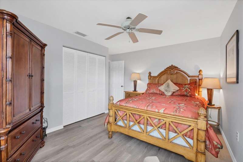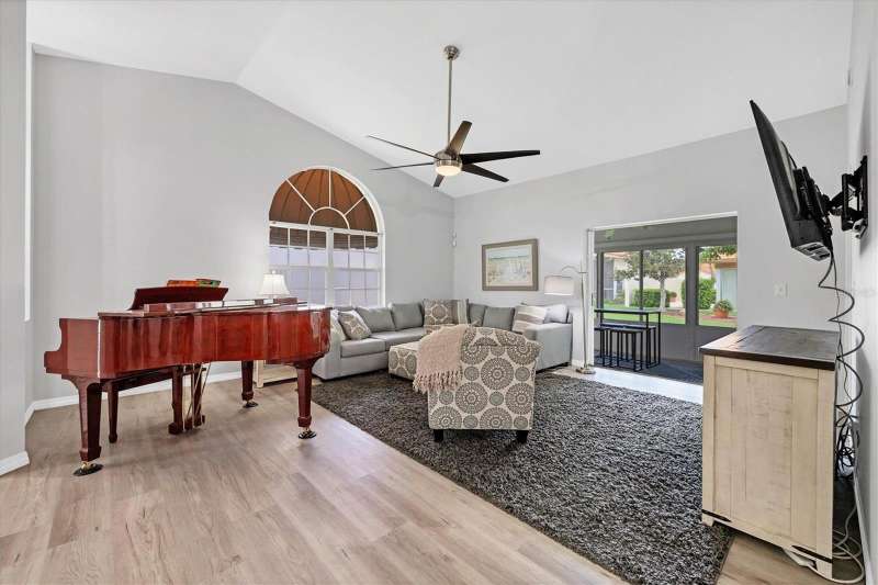 Discover this spacious 1,866 sq ft residence nestled within the highly desirable Peridia Golf & Country Club community. This 2-bedroom, 2-bathroom home features a versatile den/bonus room and an open floor plan designed for comfortable living and effortless entertaining. The dining area seamlessly connects to the living room and bonus space, perfect for hosting gatherings. Bright and inviting, the unit boasts new window treatments and abundant natural light. Expand your living space by opening the sliding glass door to the enclosed patio, or enjoy outdoor grilling on the second patio. Additional highlights include a two-car garage, an eat-in kitchen with ample cabinetry, and convenient access to cable, internet, and lawn maintenance—all included in the HOA fees. Importantly, there are no CDD fees. As part of the community, residents enjoy a golf membership that grants access to tennis, pickleball, a clubhouse for social events, a heated pool, and a tiki bar. The location offers easy proximity to shopping, dining, beautiful sandy beaches, and airports, making this an ideal place to call home.