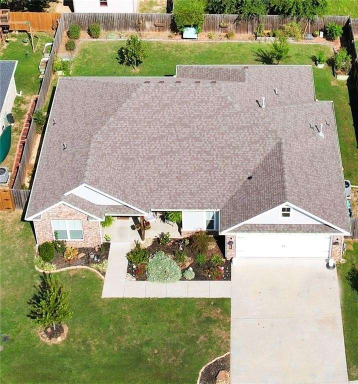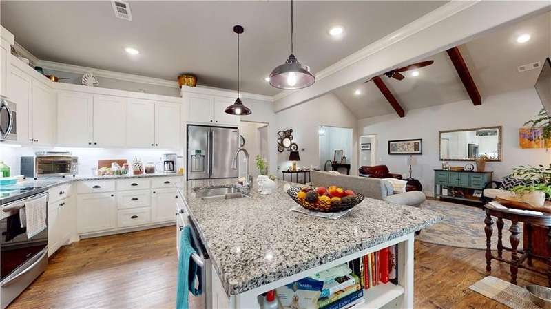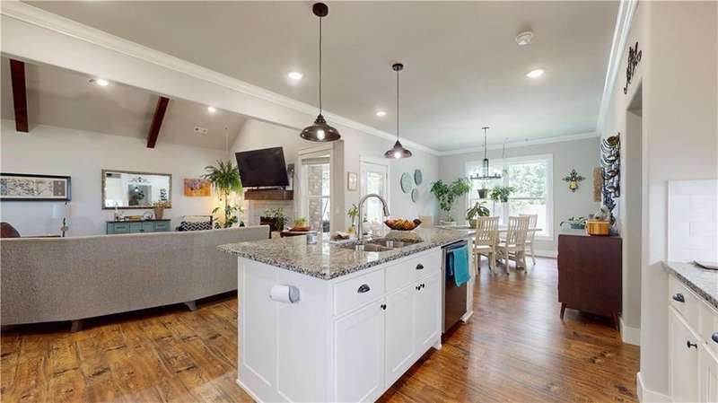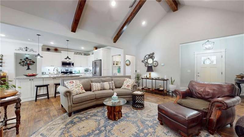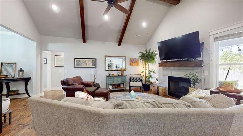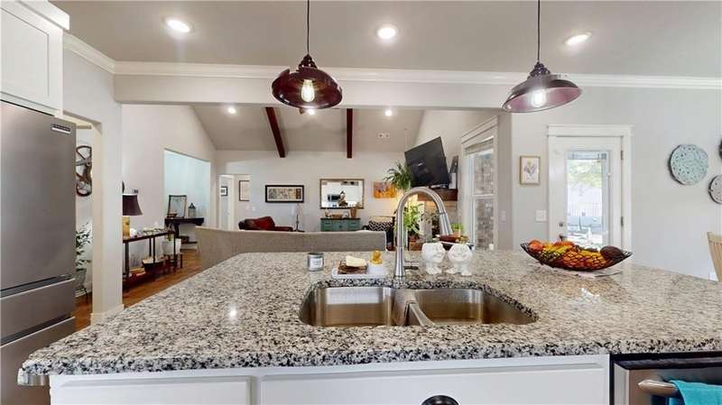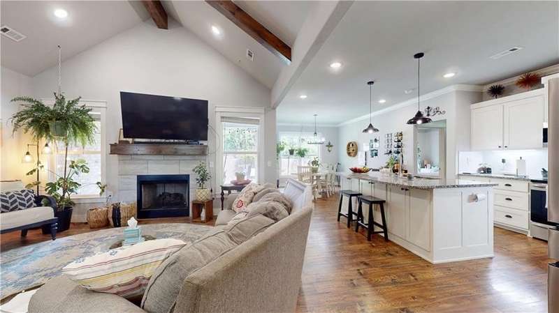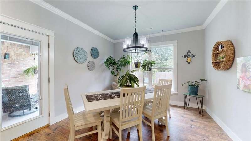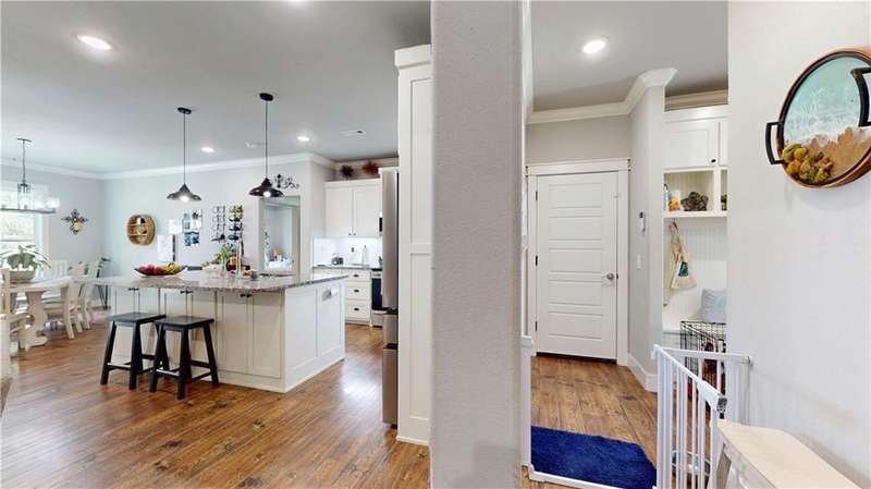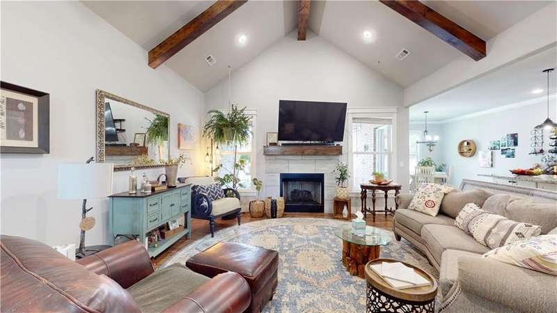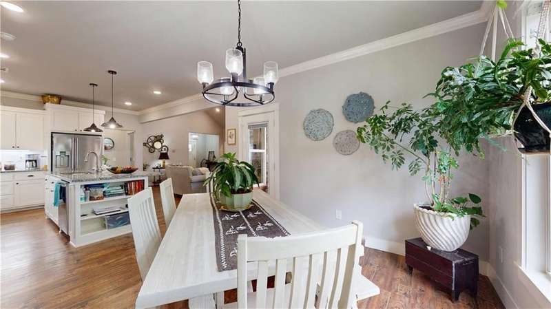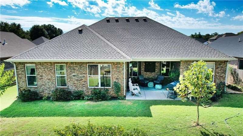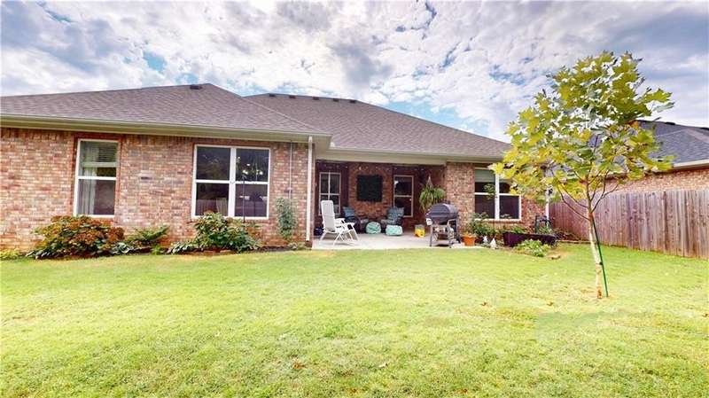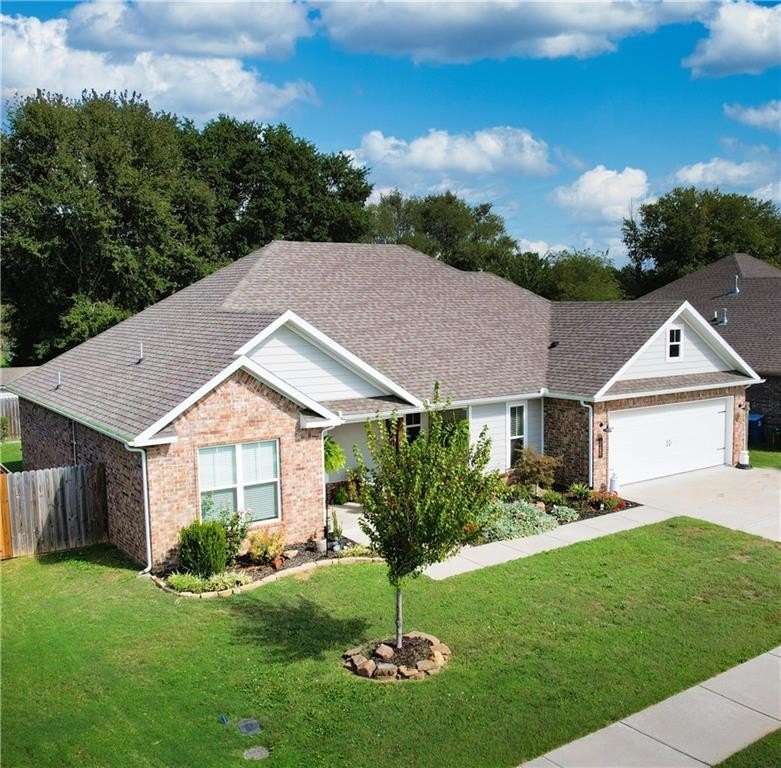 Welcome to Woodbridge Subdivision in Pea Ridge. This Craftsman-style home features 3 bedrooms & 2 bathrooms and has lots of cabinetry and storage. The open floor plan has a large kitchen island and a spacious dining area, providing an ideal setting for gatherings and entertaining guests. The primary bathroom is equipped with a large walk-in shower, a soaking tub, and a roomy walk-in closet, while the guest bathroom offers a double vanity for added convenience. Durable wood-look vinyl flooring extends throughout the home, except in wet areas which are finished with tile. Additional amenities include a privacy fence, blinds, gutters and a retractable front door screen. The covered patio is perfect for outdoor enjoyment. The exterior is brick combined with maintenance-free hardy board siding to ensure lasting appeal and minimal upkeep.