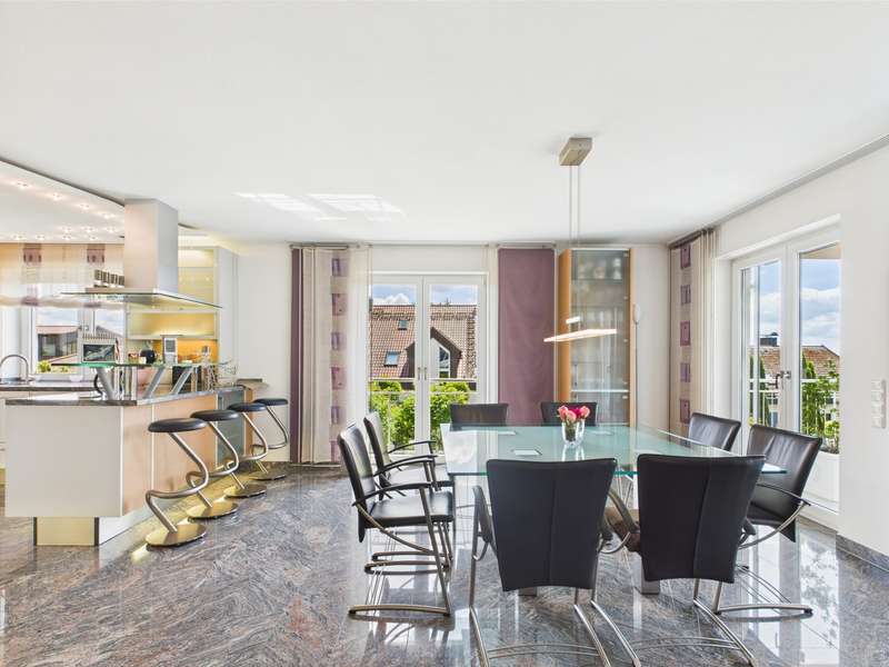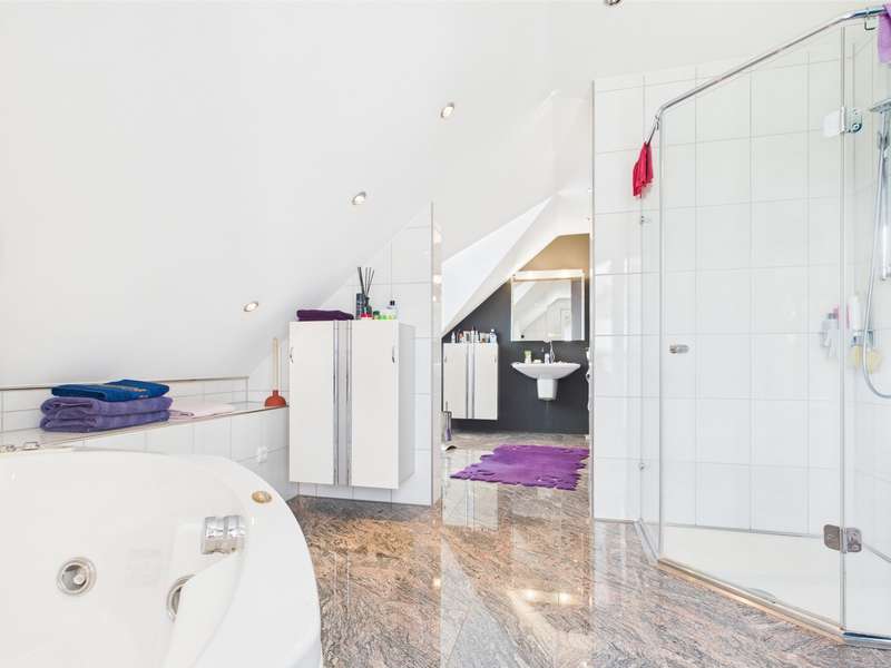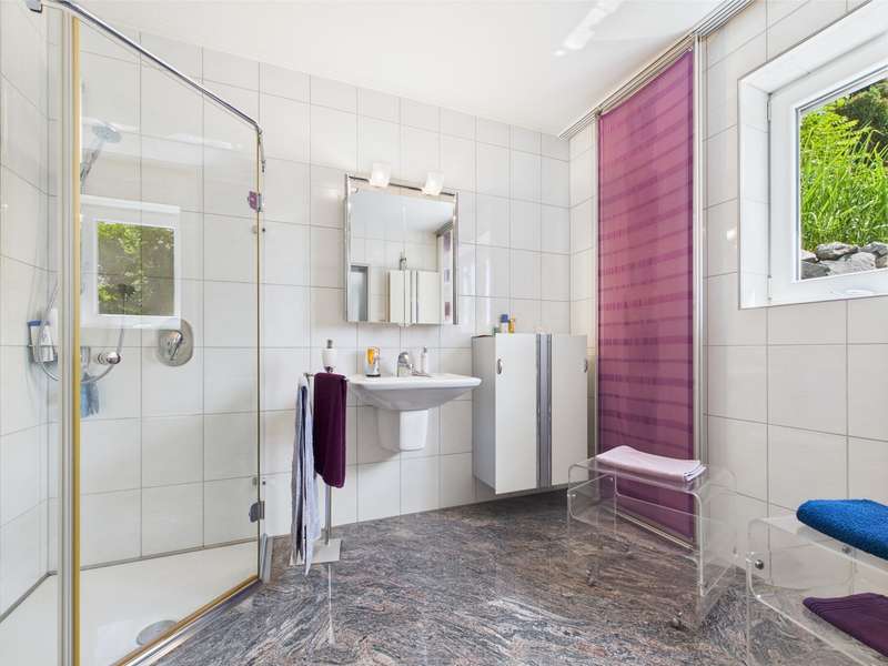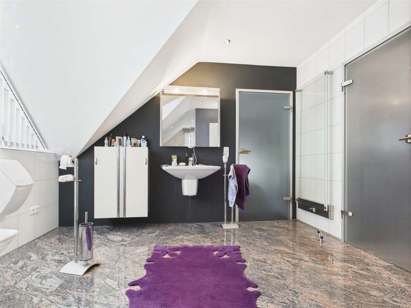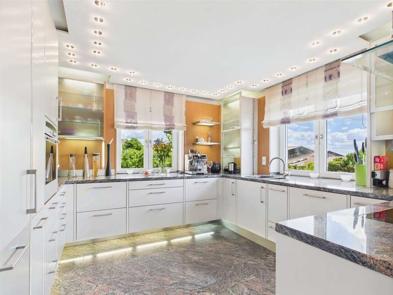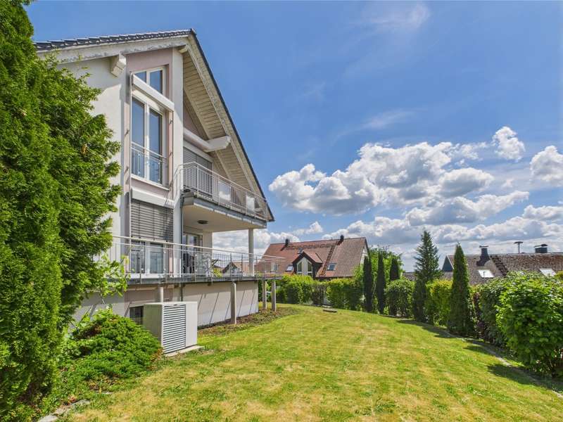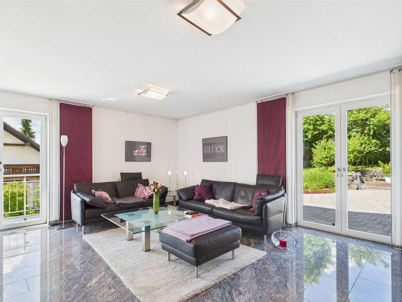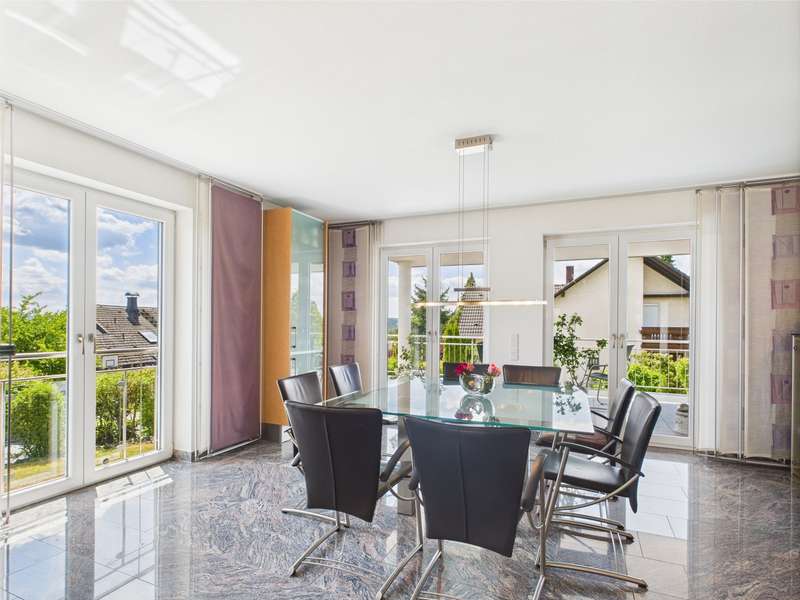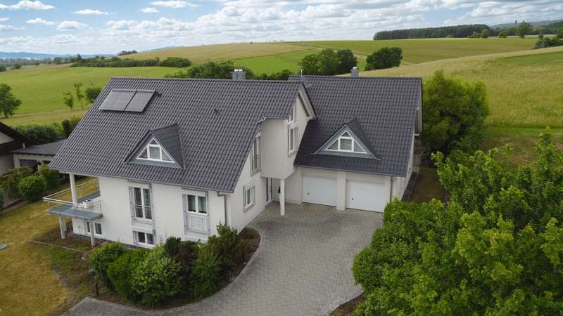 Exclusive villa in the countryside. This very well-kept, impressive and perfectly built property is situated in a quiet location in a residential area and offers enough space for sophisticated living requirements on approx. 340 m² of living and utility space. The house has a total of 10 rooms, including 2/3 bedrooms and 3 bathrooms as well as a very spacious office area that can be used for multiple purposes. The quality of the fittings is luxurious, the bathrooms with whirlpool, stepless showers, high-quality fittings and extremely high-quality floor coverings. The underfloor heating provides cozy warmth in all rooms. Two balconies and a very spacious, secluded terrace allow residents to enjoy the wonderful surroundings and spend relaxing hours outdoors. The house was modernized in 2022 and a state-of-the-art heat pump was installed to ensure efficient heating. The spacious villa with a plot area of approx. 1400 m² was built in 2003 and is located on the outskirts of the village with wonderful unobstructed views of the countryside. Overall, this property impresses with its spacious, luxurious and modern furnishings, its well-kept condition and its quiet location. A viewing is well worthwhile to see the advantages of this charming villa for yourself. Let yourself be surprised by this extraordinary property, a dream home with a view.