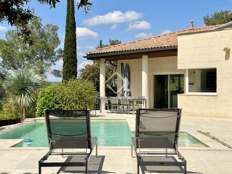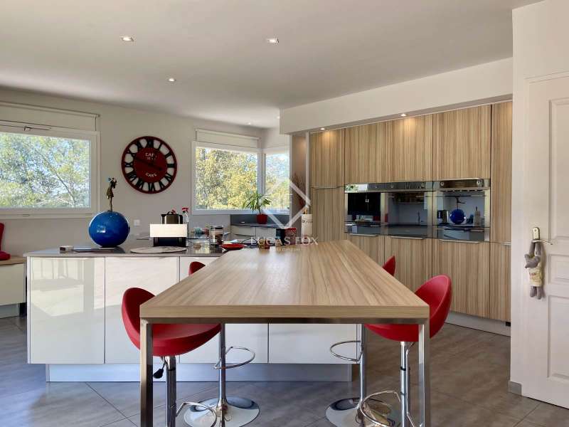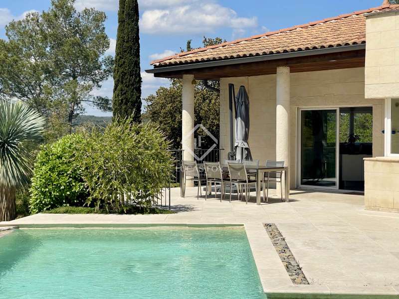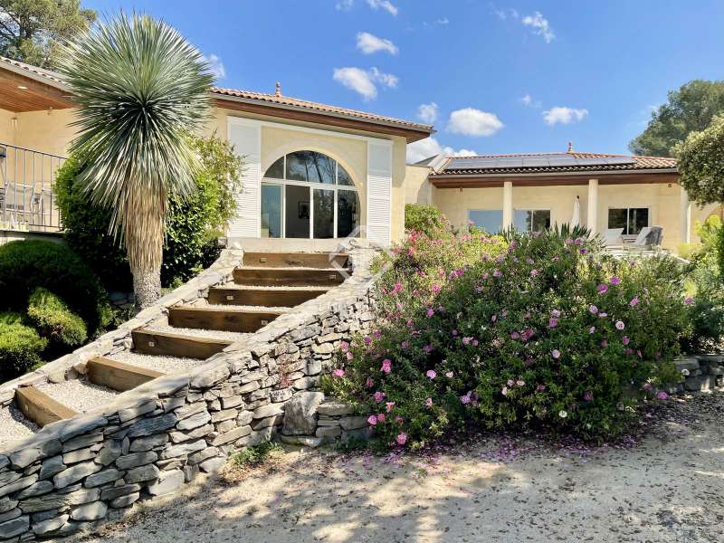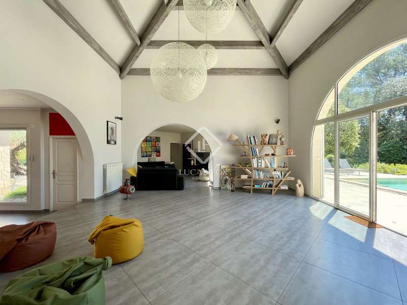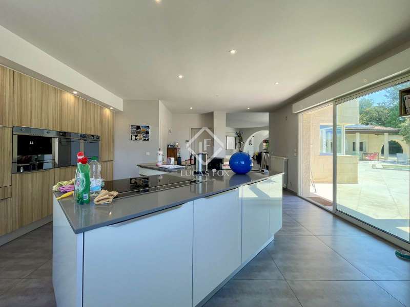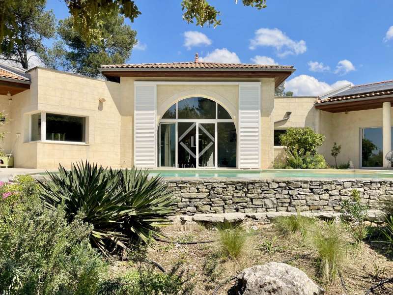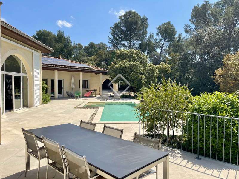 Lucas Fox International Properties, located at the end of a quiet cul-de-sac and on the heights of Montferrier-sur-Lez, this charming single-story house of 260 m² on a plot of 1,965 m² is in excellent condition. Its assets are numerous: well-designed layout with spacious rooms, high-end materials tastefully chosen, magnificent volumes, multiple openings, exceptional exposure and brightness, particularly on the large terrace where the infinity pool is located. The house was completely renovated around ten years ago. Upon arrival, you enter directly from the entrance hall into a vast cathedral-style living room. There are also large open spaces in a row: living rooms, dining room, and kitchen. The Arthur Bonnet kitchen and Smeg appliances contribute to the comfort and elegance of the space. The main rooms are arranged around the terrace and offer a most peaceful view. Enjoy the privacy of an infinity pool, which occupies an easily accessible central space. On the night side, there is a master suite with a Carré d'O shower room, toilet and a large dressing room as well as two spacious bedrooms opening onto the garden. A shower room with two sinks and a toilet complete the ensemble. On the entrance side, a spacious office with a view of the garden allows you to work in peace and quiet and can be transformed into a bedroom or a suite with a shower room if necessary. The landscaped garden allows you to move around the house, including a vegetable garden, a garden shed, several compost bins and a chicken coop. The house is equipped with a recent heat pump and 12 photovoltaic panels as well as an alarm system and fiber. The crawl space construction is perfectly sound and the property has been exceptionally well maintained. The numerous storage spaces and additional rooms are an additional asset: laundry room, garage with a large storeroom, pool technical room allowing storage of bicycles... Get the complete file and more information from your dedicated agent, Elodie SALA Commercial Agent - RSAC n° 899 543 151 Montpellier. Information on the risks to which this property is exposed is available on the Géorisques website: www.georisques.gouv.fr.
