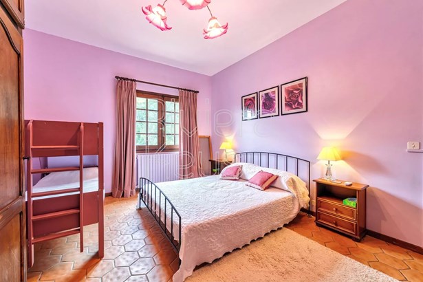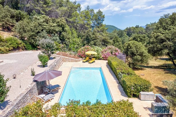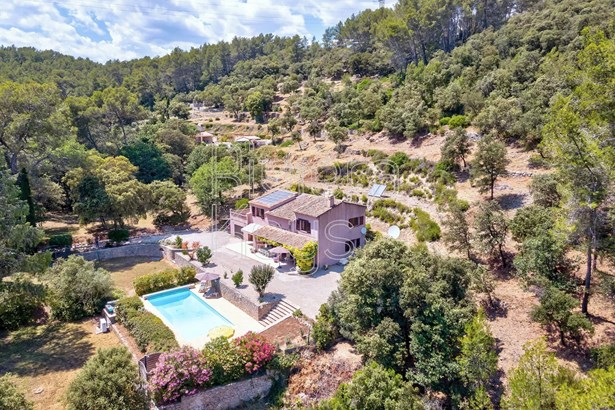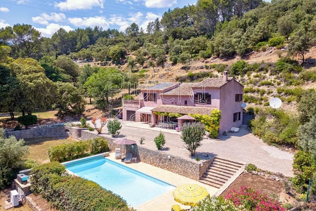 Lovely, spacious country villa nestled in the tranquil hills just 1.4 km from the medieval village centre of Les Arcs. It offers 184 m² of comfortable living space, featuring a well-equipped kitchen, a cosy living/dining room with a fireplace, and a covered terrace overlooking the pool and landscaped garden.The ground floor includes a bedroom with an ensuite shower room, a convenient guest WC, a laundry room, a boiler room, and a cellar, providing ample storage and utility space. Upstairs, a mezzanine serves as a study, alongside a master bedroom with a walk-in dressing room and ensuite bathroom, separate wc and 2 additional bedrooms sharing a shower room and separate WC. Enjoy beautiful hill views from the solarium!Outside, the 1.36-hectare terraced grounds include a heated 11 x 5 pool and an attached garage. Recent upgrades such as new roof insulation, solar panels, and bedroom air-conditioning enhance comfort and efficiency.Experience the peaceful charm of this well-appointed country retreat, ideal for relaxed living in a picturesque setting.