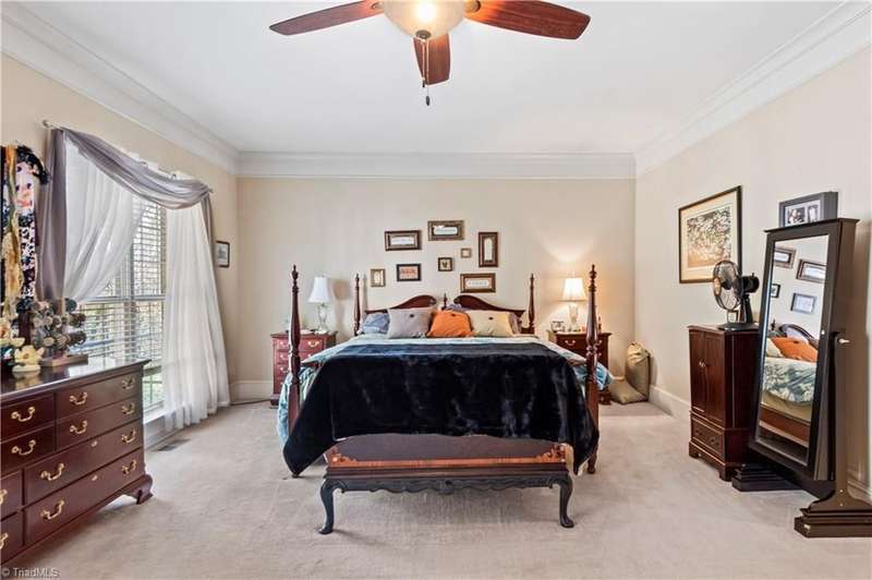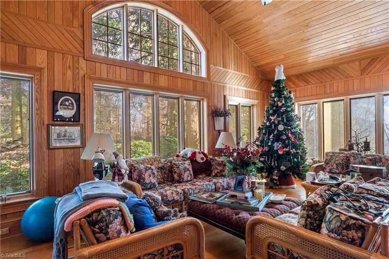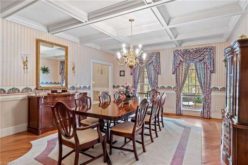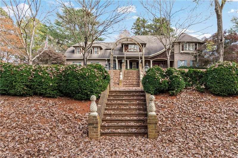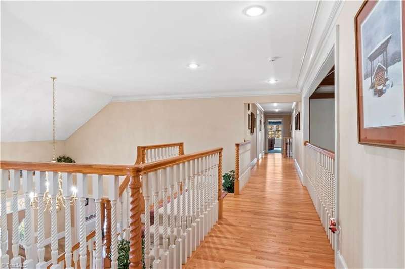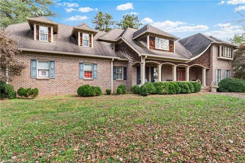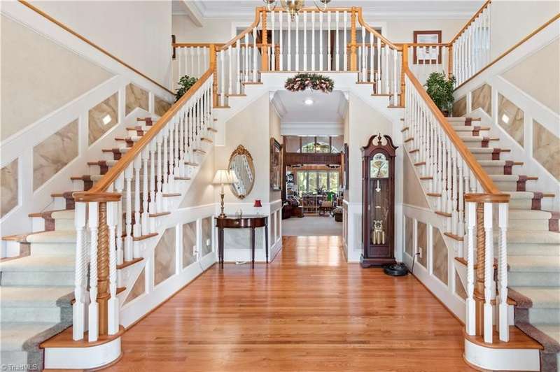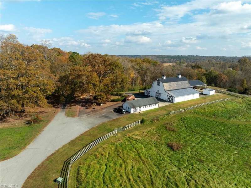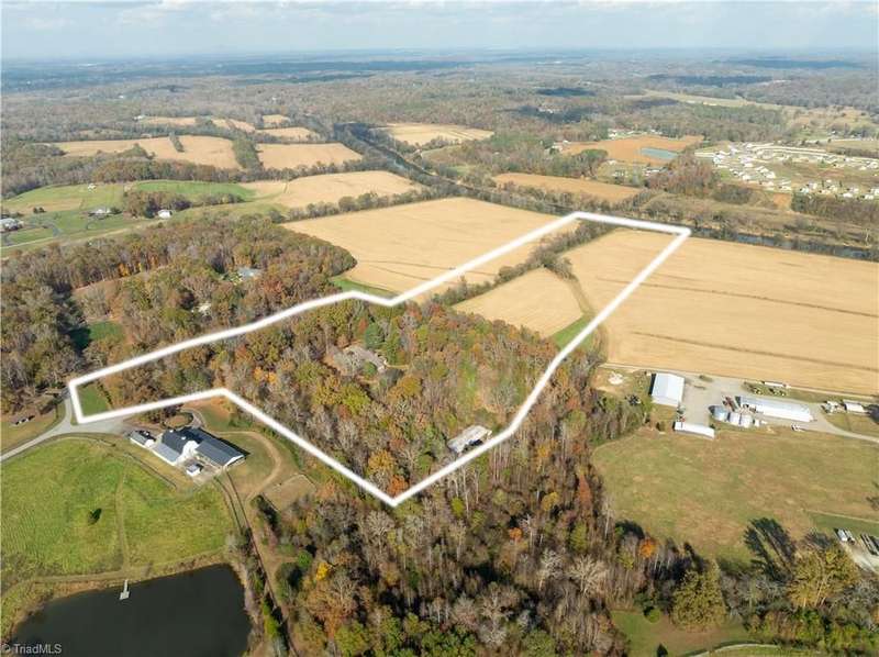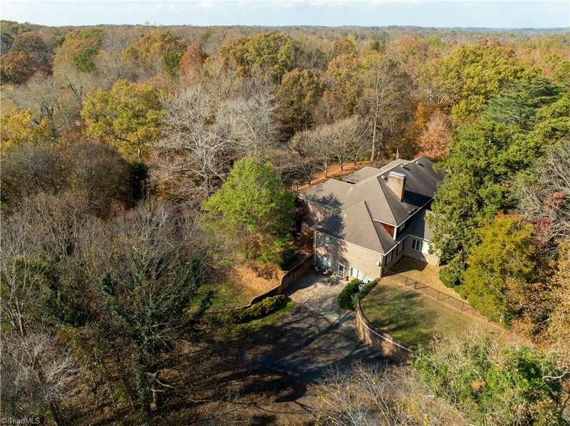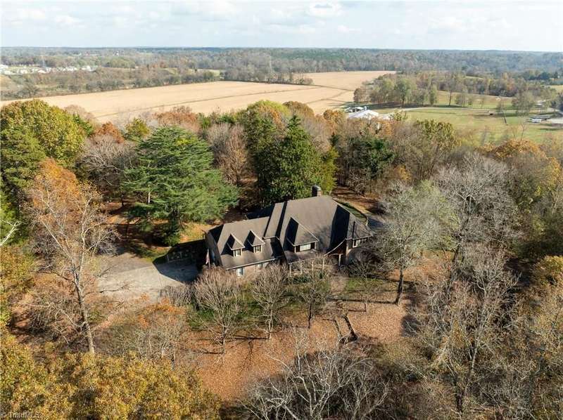 This grand estate is nestled in a highly sought-after, gated estate community that is accommodating to horses, with each property boasting its own expanse of land. This property is 33+/- acres adjacent to the Yadkin River & features a robustly constructed home spanning 5800SF+/- w/5BR & 4.5BA, exquisite sunroom, huge pantry, & beautiful setting. For those requiring additional space, there is an unfin bsmt ready for customization. Welcome guests in the expansive foyer, which is highlighted by an elegant dbl staircase. The residence showcases exquisite hardwood floors, a beautifully coffered dining rm ceiling, a large ML primary bedroom en suite, & a spacious second-floor bonus room that can be the 6th BR(has closet & windows). Surrounded by beautiful wooded and cultivated land that extends to the Yadkin River. This property offers unparallel privacy. There is also a 2800+/-storage building w/a garage. Property Offered at a price below its recent appraisal. Come see before it's sold.