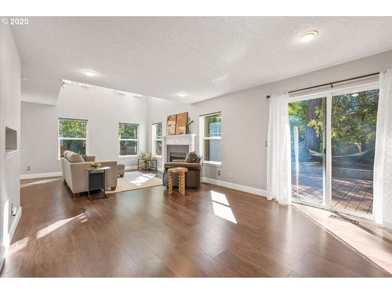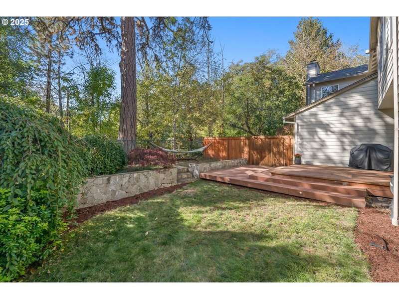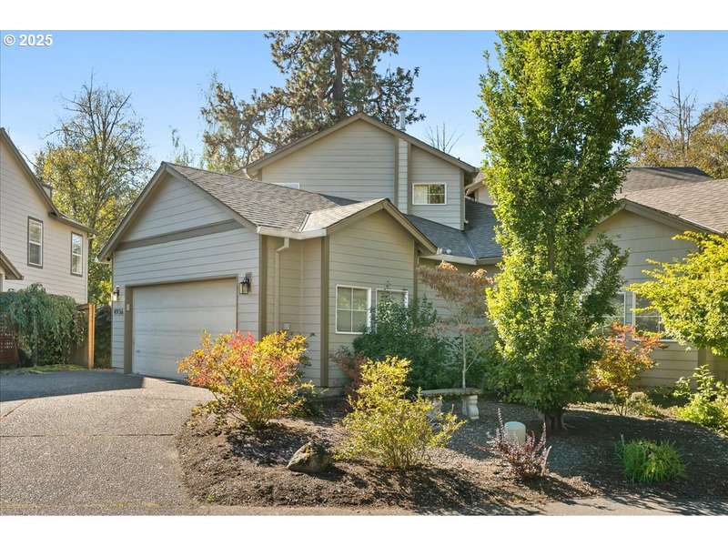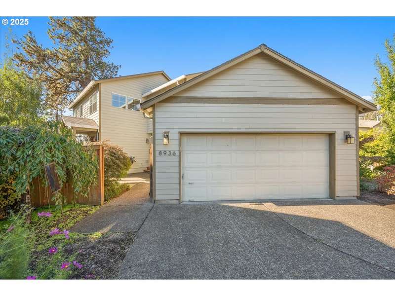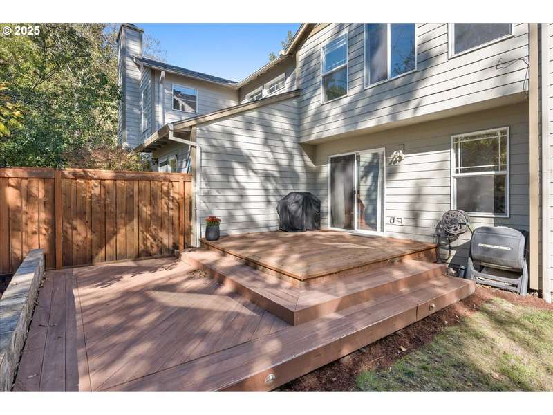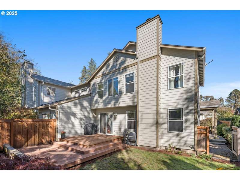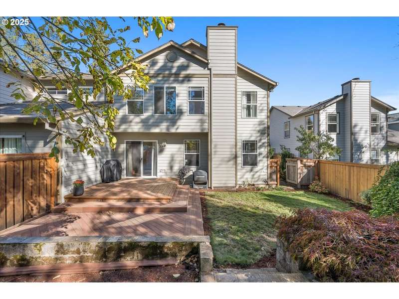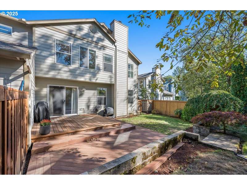 Tucked away in a close-in SW Portland/Tigard neighborhood, this light-filled townhome has sophisticated style, and is incredibly spacious. The fantastic floorplan, huge yard and excellent privacy rivals most single-family homes! When you first come inside, the living room with a vaulted ceiling will exceed all expectations - it's a fantastic living area with two stories of windows that frame the trees & sky, and let in SO MUCH natural light. Such a bright, open atmosphere that lives much larger than you'd expect. The living and dining areas are wide open, great for entertaining, with a slider onto the deck and huge backyard. A rare and coveted wood-burning fireplace for cozy evenings with a crackling fire. Nearly every window provides a view of the nature and mature landscape that surrounds this home. Crisp white kitchen with granite counters, induction stove, stainless appliances (all appliances included!) plus a pass-through to the living room, and great storage with pantry and broom closet. Each of the two excellent primary suites includes its own full bath and walk-in closets with organizers; ideal for guests, roommates, or a home office setup. This may be the most impressive backyard you've seen in a townhome; a generous deck, plenty of sun & space for gardening, fully fenced, deck for summer BBQ's, enjoy private mornings & evenings surrounded by trees. Generous two-car garage. Laundry room on main floor (washer & dryer included!) New roof, new carpet and new paint done in 2020. New water heater in 2023. A location that feels like a park, but very central to all things Portland - just moments from trails, restaurants, and golf course. A perfect blend of space, light, affordability, livability — an absolutely ideal, move-in ready home for the buyer looking for both privacy and community. HOA Dues just $40/month. Open Sat and Sun 1-3