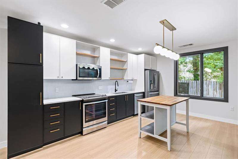 Welcome to 1364 Rietveld Row, a beautifully updated 2-bedroom, 2-bath townhome in the gated M West community in West Midtown. Partial furnishings (2tvs, guest bed, sofa and loveseat, two patio chairs) included if desired. With modern finishes, great natural light, and a private fenced yard, this home offers stylish, low-maintenance living in one of Atlanta's most convenient locations. Fiber internet available. Enjoy direct access to the Atlanta BeltLine's Westside Connector Trail, just steps from your door, and unbeatable proximity to The Works, Westside Provisions District, Westside Park, and some of Atlanta's best dining, breweries, shopping, and everyday essentials. The main level features an open layout with soaring two-story windows, wide-plank wood floors, and a sleek kitchen with two-tone cabinetry, quartz countertops, stainless appliances, and a butcher block island. The living and dining areas feel bright, open, and comfortable, ideal for both everyday living and entertaining. Upstairs, the spacious primary suite includes a fully renovated bath with large-format tile, a deep soaking tub, walk-in shower, warm brass fixtures, and excellent closet space. A second bedroom and full bath provide privacy for guests or a home office. Washer and dryer are conveniently located upstairs and included with the home. Out back, enjoy a private fenced yard and easy access to M West amenities including a pool, fitness center, dog park, and green space-perfect for a balanced, active lifestyle. Move-in ready, thoughtfully updated, and close to everything that makes West Midtown one of Atlanta's most dynamic and desirable neighborhoods. This property is available semi furnished and includes high speed internet.