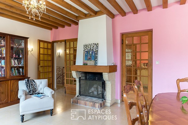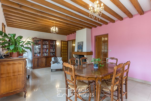 The vast living room with its authentic fireplace opens onto a large terrace overlooking the lush garden. An ideal setting for enjoying long summer evenings or entertaining family and friends.
