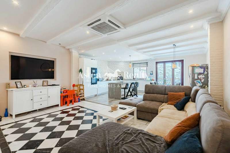 The upper level boasts a bright and airy living room with an open-plan kitchen, two bedrooms, and two bathrooms. Step outside onto the expansive terrace, where you can enjoy panoramic views of the mountains and ocean, relax by the private pool, or entertain in the cozy barbecue lounge area.