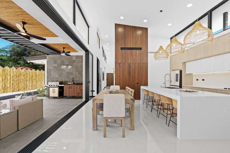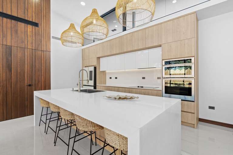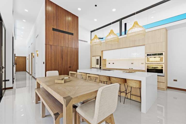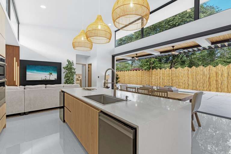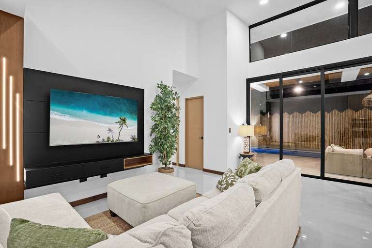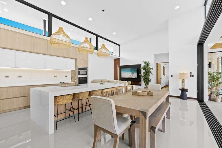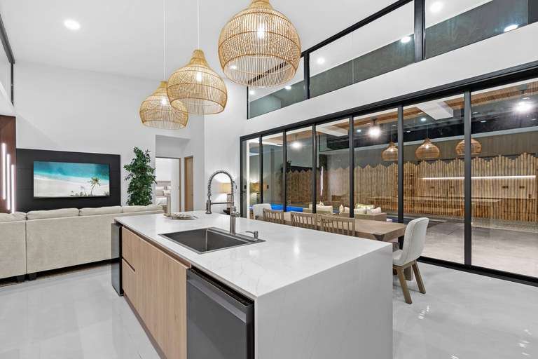 As you enter the home, you'll be greeted by beautiful decor and high vaulted ceilings. This floor plan seamlessly connects the bedrooms, living, dining, and kitchen areas. The hall and living room feature 5 meter (16') high ceilings and large windows that allow natural light to flood in, creating a warm and inviting atmosphere. The kitchen is a chef's delight, equipped with modern appliances such as a smart fridge, ceramic cooktop, wall mount oven, dishwasher and wine fridge. The large island creates ample counter space, and additional seating while entertaining. The kitchen flows into the open living and dining room area complete with warm accent lighting, large flat screen tv, and plush seating area. The living space seamlessly melds into the outside pool deck through large sliding doors that fold away. Doubling your overall entertaining area and giving you an outdoor experience where your living space meets nature.