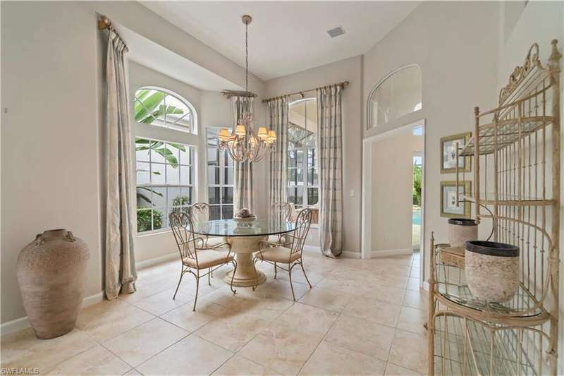 Beautifully maintained home with spectacular golf course & water views offered in North Naples' coveted "Audubon Golf & Country Club!" Enjoy highly sought-after Southwest exposure-perfect for soaking in breathtaking sunsets. This light and bright home has soaring ceilings, wood and tile flooring, a convenient wet bar. The expansive outdoor living area is an entertainer's dream, featuring a pool and spa, generous lounging space, and uninterrupted views of the lush golf course and Lake. Inside, the spacious kitchen offers granite countertops, stainless steel appliances, and a convenient breakfast bar for casual dining. Located in the Devon Green subdivision, the HOA services include landscaping, front lawn water irrigation, house painting and biannual roof cleaning for effortless maintenance. "Audubon Country Club" is perfectly located 5-min from Mercato & SWFL's world-class beaches, with gated/guarded entry, an 18-hole championship Golf Course, tennis, pickleball, Bayside boardwalk, fabulous fitness facilities, clubhouse with dining & 2nd spectacular poolside club/cafe.