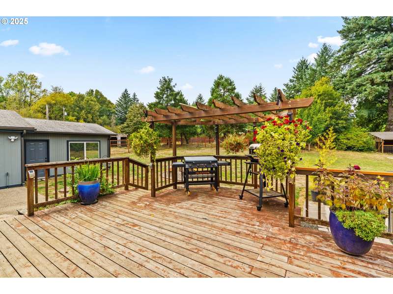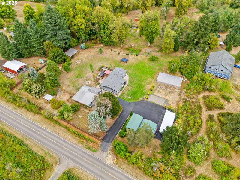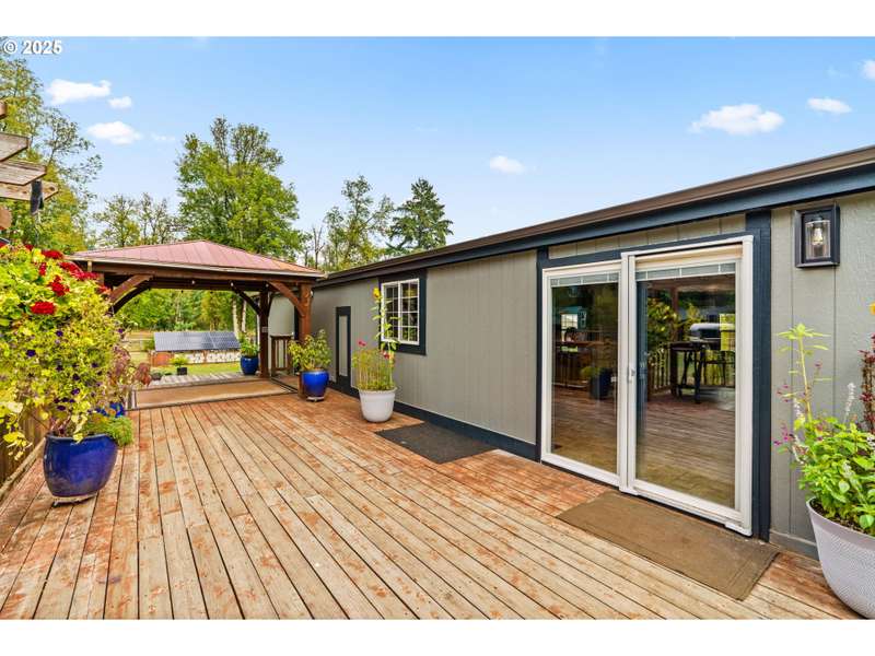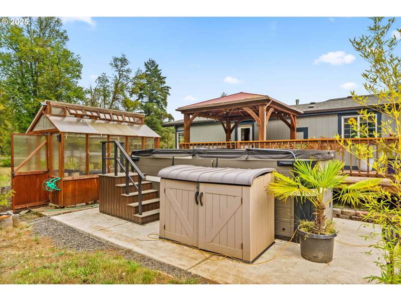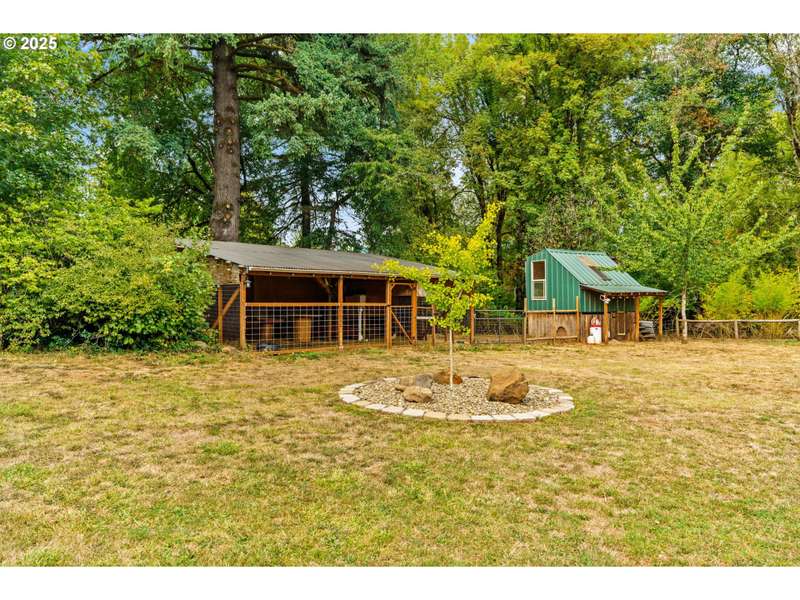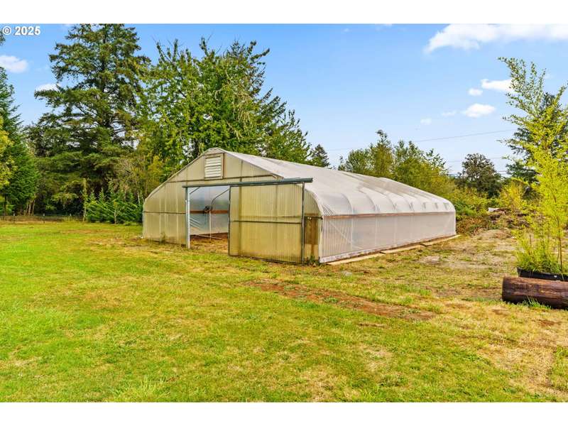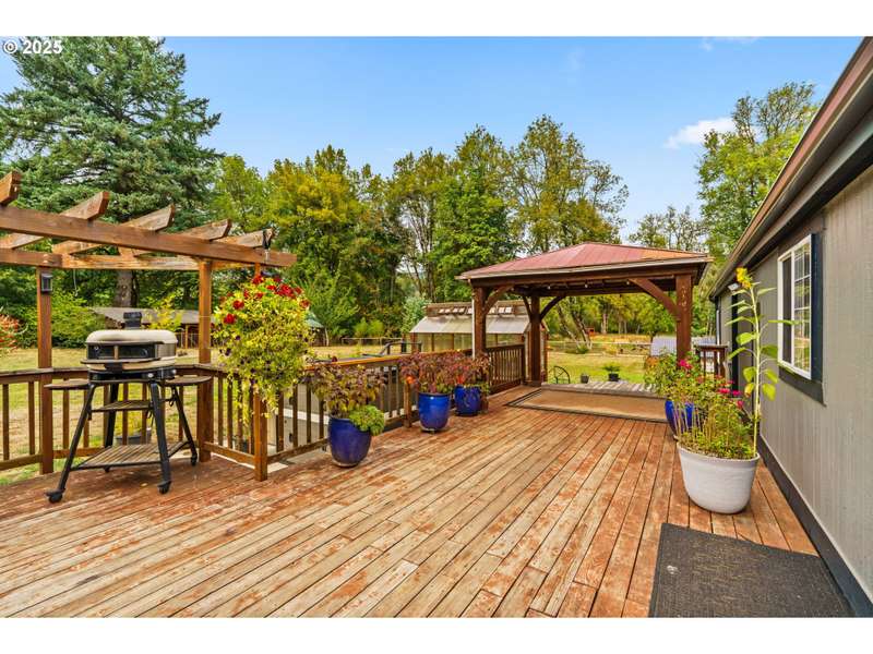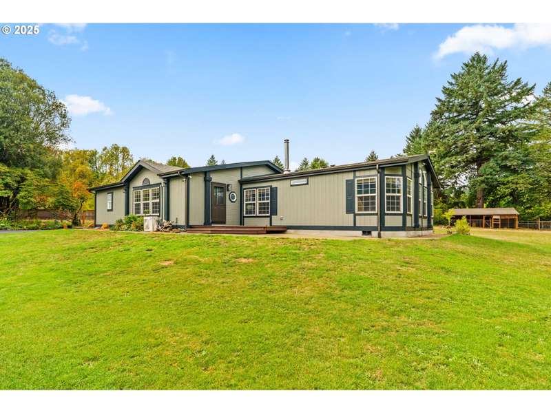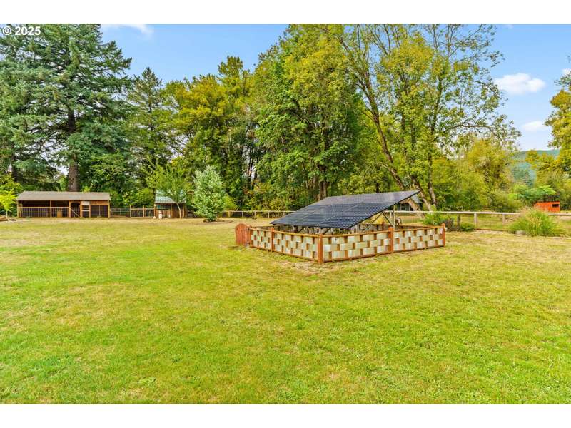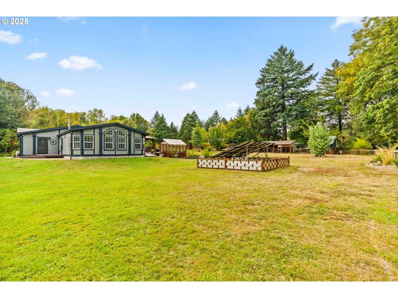 Country property only 10-15 minutes from the town of Springfield, this fully fenced 5-acre property offers privacy, space, and endless possibilities—perfect for a hobby farm! The acreage is well-maintained, providing a beautiful and functional setting for all your outdoor needs. The 2,199sqft., 3 bedroom 2 bath manufactured home is beautifully updated with a kitchen featuring granite countertops, an eat bar, stainless steel appliances, and led panels that fill the space with natural light. The open great room is bright and welcoming, and the large primary suite includes a roomy, well-designed bath, with a large tile walk-in shower and double sinks with lots of counter space. Cozy up with the wood stove in the office space., enjoy an automatic gate, a detached garage with separate living space, a covered carport, multiple outbuildings including greenhouses 8'x12' and the larger greenhouse 30'x60' and a shop, a deck, and a year-round creek. Enhance your home’s energy independence and resilience with an owned, grid-tied solar system featuring battery backup for seamless power to essential loads during outages, included in the sale for immediate eco-friendly savings. This property blends comfort, functionality, and tranquility in a truly peaceful setting.