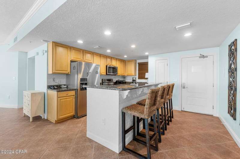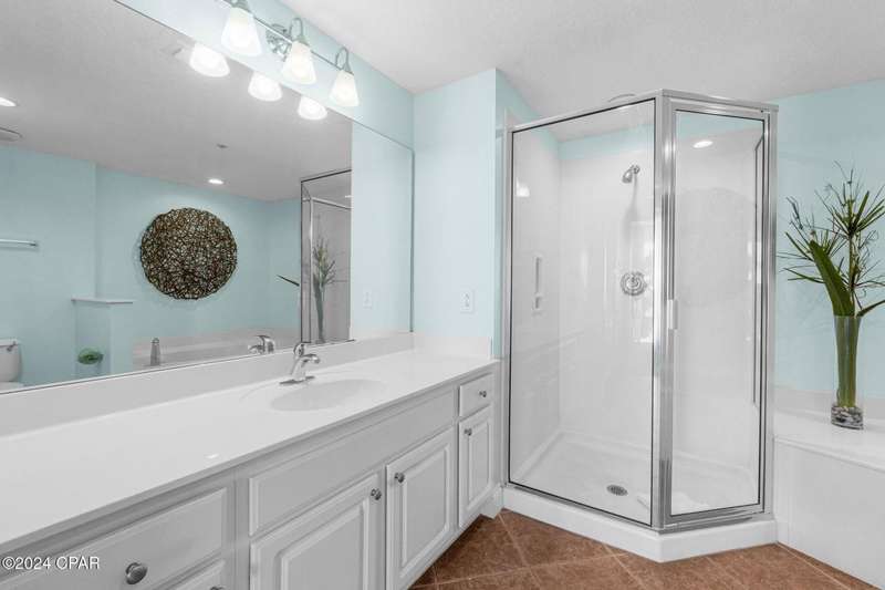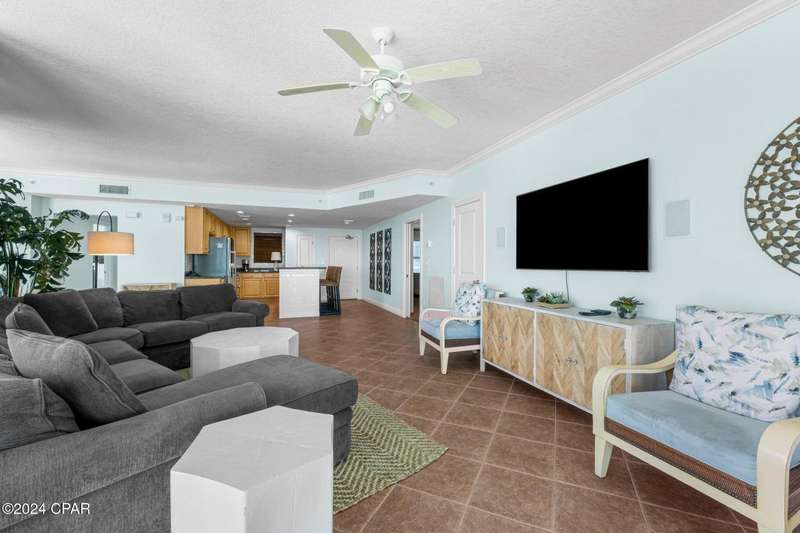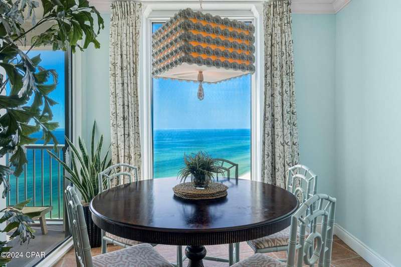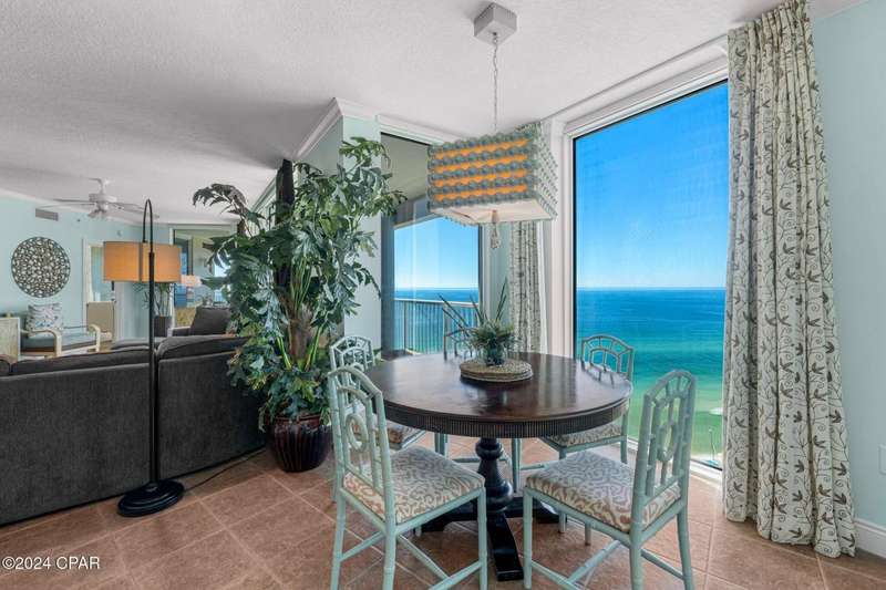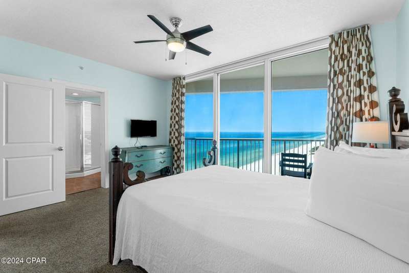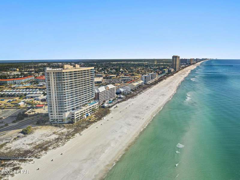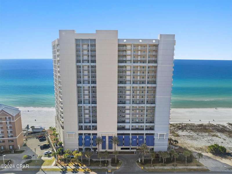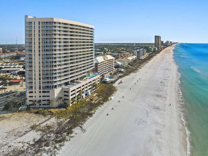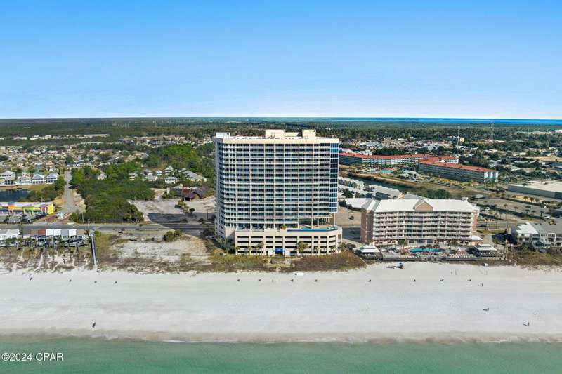 The Palazzo Resort is the premiere condominium complex on the much sought after West End of Panama City Beach, FL. It is located a mile west of Pier Park, which means there is much less traffic congestion and is only a15-minute drive to Rosemary Beach and 30A. You can also quickly get to your favorite PCB attractions like the Sky Wheel, Aaron Bessant Park's open air amphitheater, Pier Park Dog Beach, Gulf World, and the coming Top Golf + Dolly Parton Dinner Theater. It is also easy to get to your favorite dining establishments like Runaway Island, Sharky's, Thomas Donuts and the new McGuire's Irish Pub being built right across the street. Palazzo is a ''low density'' resort with only 142 condos and has one of the highest ratios of owner ''non-rental'' units. What this means is that even during the prime summer rental season, it is less crowded on the beach and is much more quiet inside the resort. The amenities include a BBQ/grill and picnic area, dog walk, swimming pool, hot tub and a fitness center with ceiling to floor views of the Gulf! This 3 bedroom + 3 full bath corner unit is incredible with its westward facing 9th floor wraparound balcony showing off the most amazing, unobstructed sunset views through the floor to ceiling windows. As you walk into the foyer, you are mesmerized by the floor to ceiling views of the emerald green waters of the Gulf of Mexico. Then, you see the modern, fully equipped kitchen that features all stainless, high-end Kitchen Aid appliances, a custom backsplash, oversized island, lots of cabinetry, and recessed lighting. The wide-open living area welcomes you with a large sectional sofa, 2 coastal chairs, modern accessories, and a large wall-mounted TV. The quaint dining room has its own alcove with floor to ceiling views of the Gulf to the South and the beaches to the West. The Master en suite is Gulf front with floor to ceiling windows and also with South and West views. A large, comfy king size bed and bright, tasteful beach inspired furniture and d�©cor make this space a relaxing oasis. It has 2 vanity areas with tasteful hardware, gorgeous mirrors and glass walk-in shower. The second master en suite is perfectly located on the opposite side of the unit. The bedroom is spacious and has Westward looking floor to ceiling windows with its own private balcony. The en suite boasts a glass enclosed shower, a single vanity, with its own floor to ceiling Westward facing window with shade. The guest bath also boasts a tub/shower combo with a single vanity. The guest bedroom is large enough for 2 full size beds and has it's own closet. Don't miss out on this rare opportunity to own a Palazzo 3BR West facing condo.