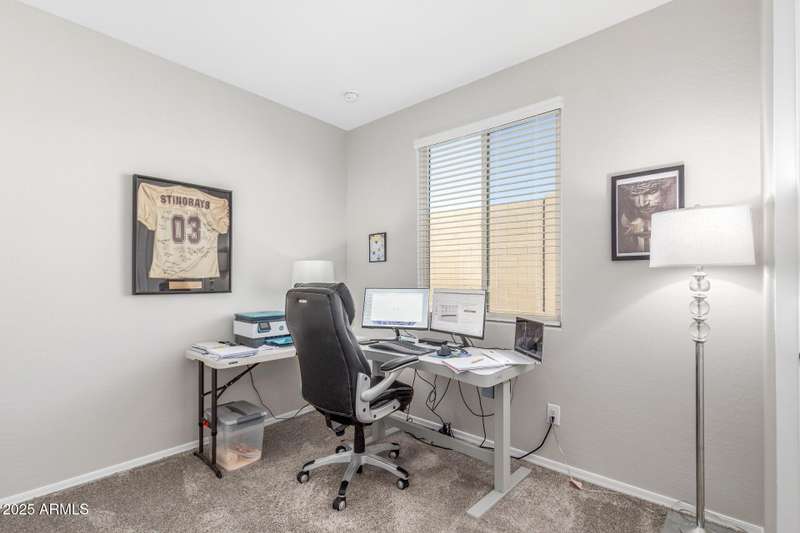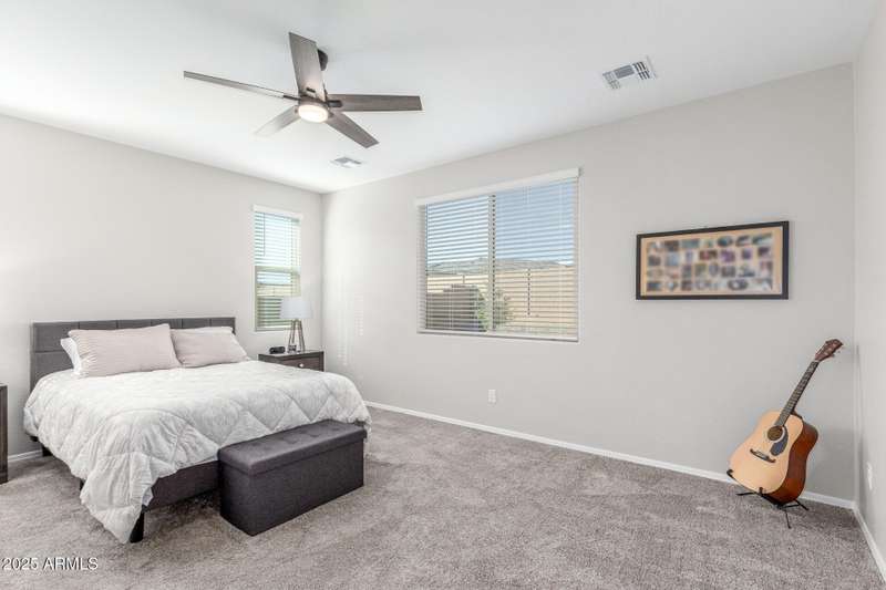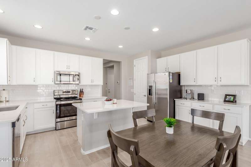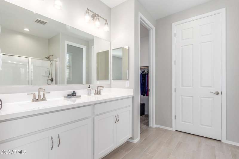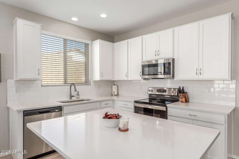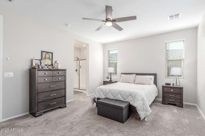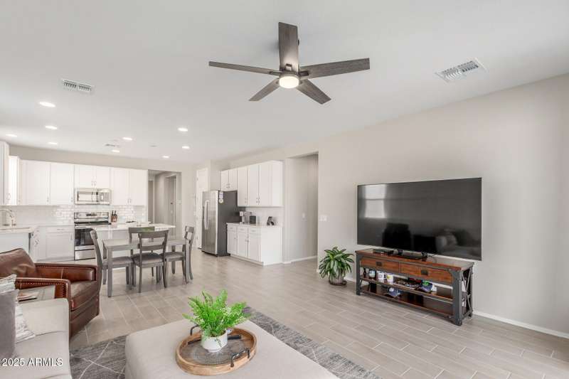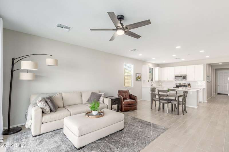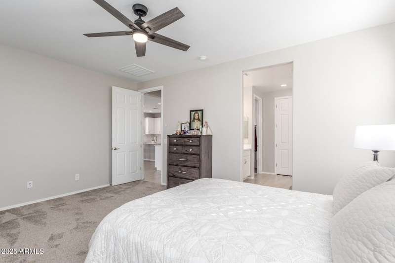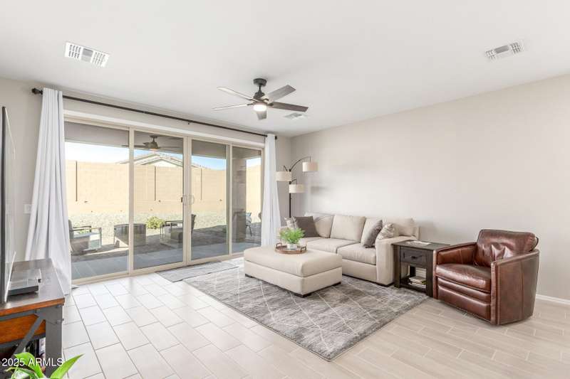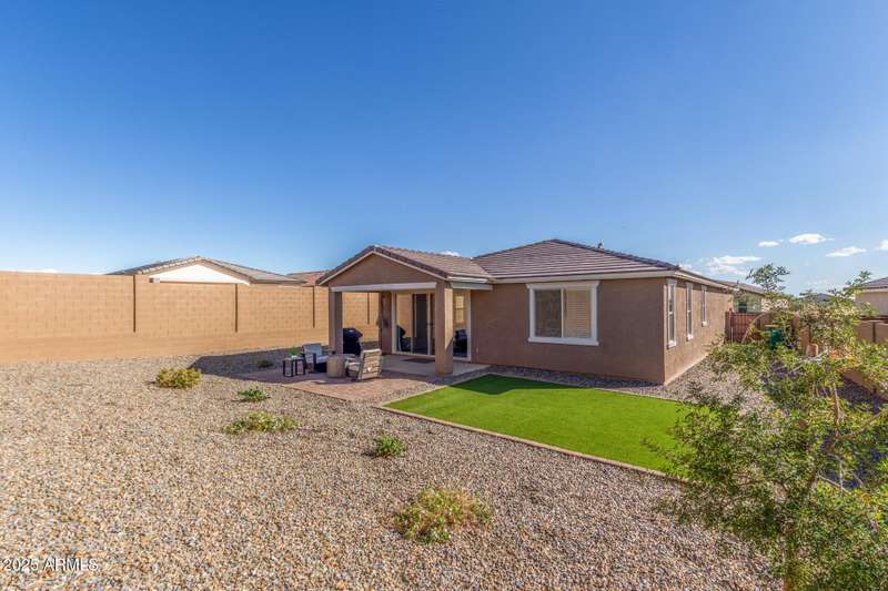 Welcome to this beautiful single-level home in Entrada Del Oro! Offering 3 beds, 2 baths, a low-care landscape, and a 2-car tandem garage w/paver driveway. The inviting interior features neutral paint, abundant natural light, wood-look tile flooring in common areas, and plush carpet in bedrooms. You'll love the desirable open layout paired with multi-sliding doors that merge the inside & outside activities! The spotless kitchen boasts SS appliances, quartz counters, a pantry, recessed lighting, subway tile backsplash, white shaker cabinetry, and an island w/breakfast bar. Enter the large main bedroom to find an ensuite with dual sinks and a walk-in closet. Enjoy the spacious backyard, providing a covered patio, extended pavers, artificial turf! Premier lot, don't miss this opportunity! Upgraded lot for privacy.