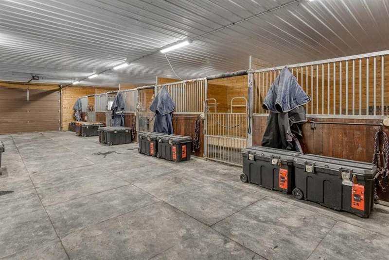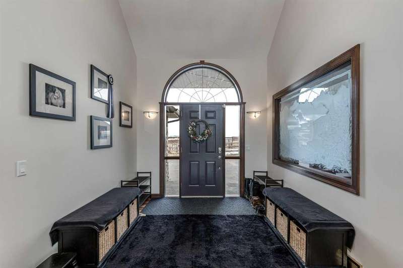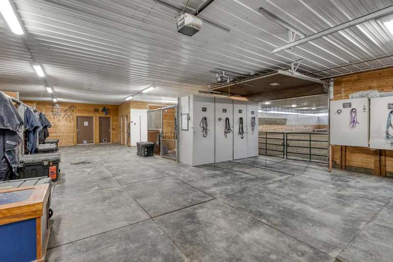 Heated Indoor Riding Arena/Barn, Luxury Walkout Bungalow with Stunning Mountain View | Minutes to Cochrane & Hwy 22 For the equestrian enthusiast, this property is truly exceptional. It is just so amazing and wonderful to be able to walk out to your own private in-door heated riding arena (70’ x 142’) that provides year-round training and riding opportunities. The attached heated barn includes 6 box stalls, a tack room with viewing window and cupboards and a sink to make a coffee or a snack. Along with a washroom and wash bay, and garage for equipment and storage. There are many pens and paddocks, shelters, auto waterers, and a 100 x 200 outdoor riding arena. Exceptional custom-built walkout bungalow offering over 5,055 sq. ft. of quality living space. The home showcases superior craftsmanship with air conditioning, hardwood and slate flooring, vaulted ceilings, and solid cherry woodwork throughout. The gourmet kitchen features granite counters, custom cabinetry, high-end appliances, and a bright breakfast nook with fabulous mountain views. The spacious living room centers around a stunning stone gas fireplace, while the formal dining room is perfect for entertaining. The primary suite includes a sitting area, dual walk-in closets, and a luxurious ensuite. Two additional bedrooms share a Jack-and-Jill bath. The fully finished walkout basement with in-floor heat offers a family room, games area, den/hobby room, 4th bedroom, bath, and ample storage. A heated triple attached garage (40’x22’) provides room for vehicles and workspace. A rare opportunity—luxury living and equestrian excellence just minutes from town! Truly a gorgeous property! Act fast!!!! Checkout the virtual tour.