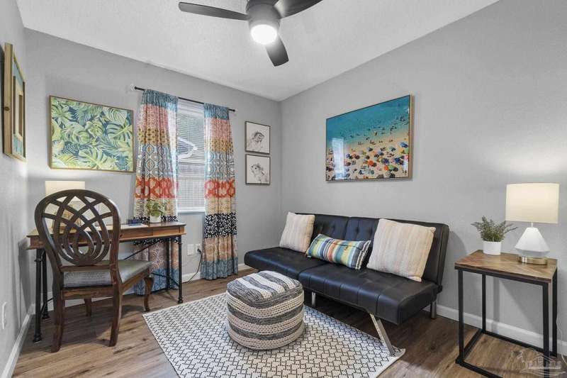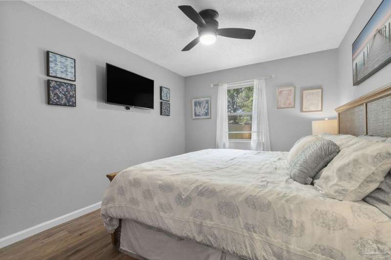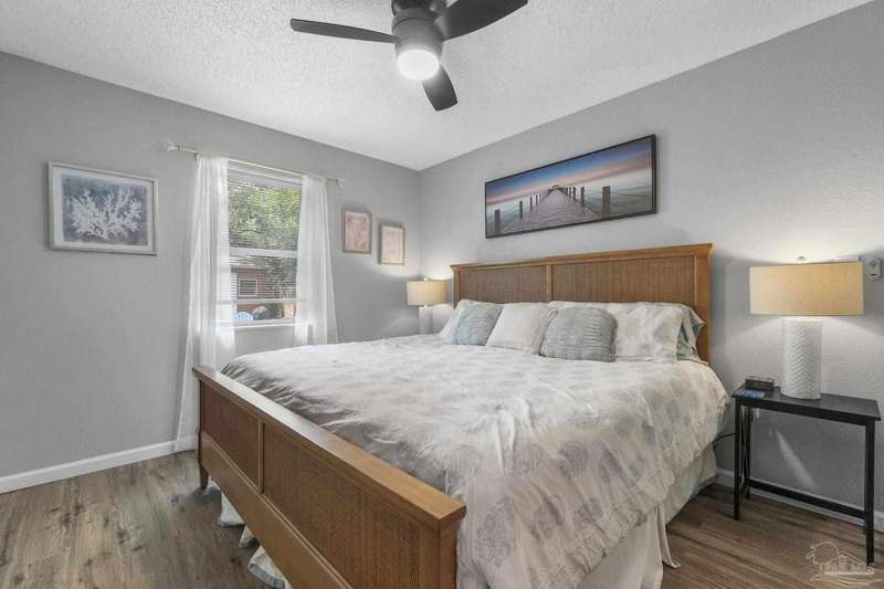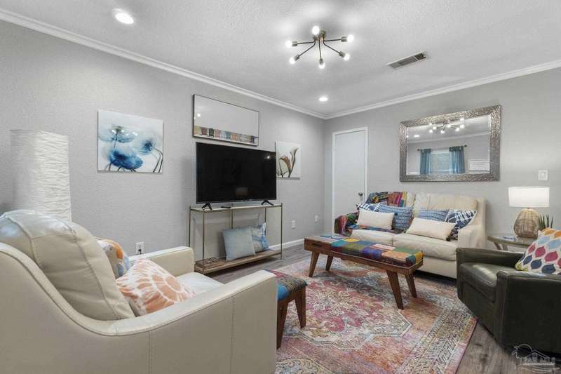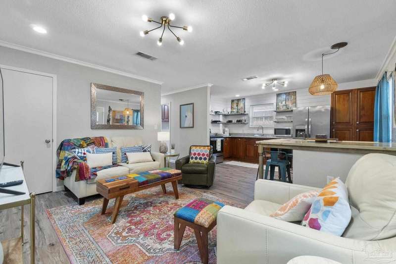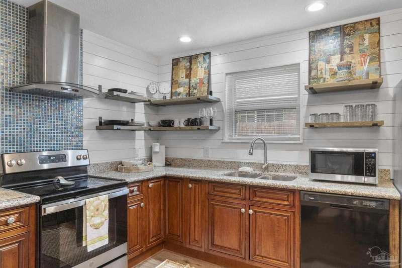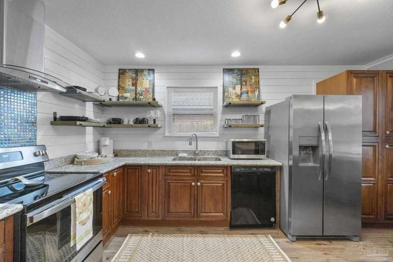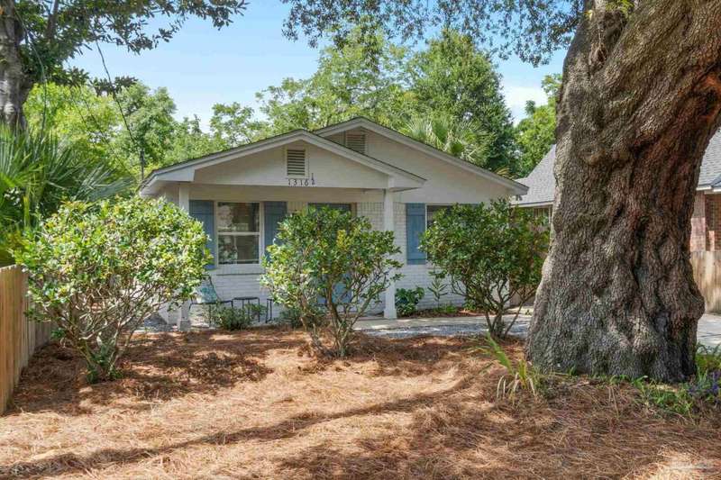 Located in one of Pensacola's most desirable neighborhoods, this updated 3-bedroom, 1-bath home is full of character and move-in ready. Step inside to an open-concept layout featuring fresh paint, LVP flooring, and stylish lighting throughout. The kitchen offers granite countertops, warm wood cabinetry, shiplap, stainless appliances, and modern floating shelves for a clean, functional look. A custom built-in dining table creates a cozy and practical dining space. All three bedrooms are generously sized with ample closet space and share a renovated bathroom with a tiled tub/shower combo and vanity with granite countertop. Out back, enjoy a private, fenced yard with an open patio and two storage sheds. A 2022 roof, 2022 A/C and 2022 water heater tops off this turnkey home-just minutes from parks, shops, and dining in the heart of East Hill!