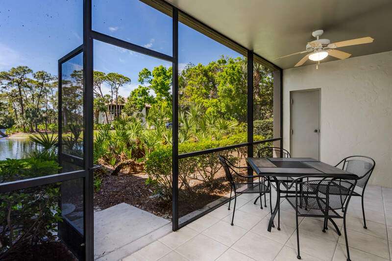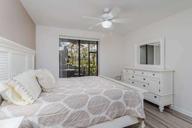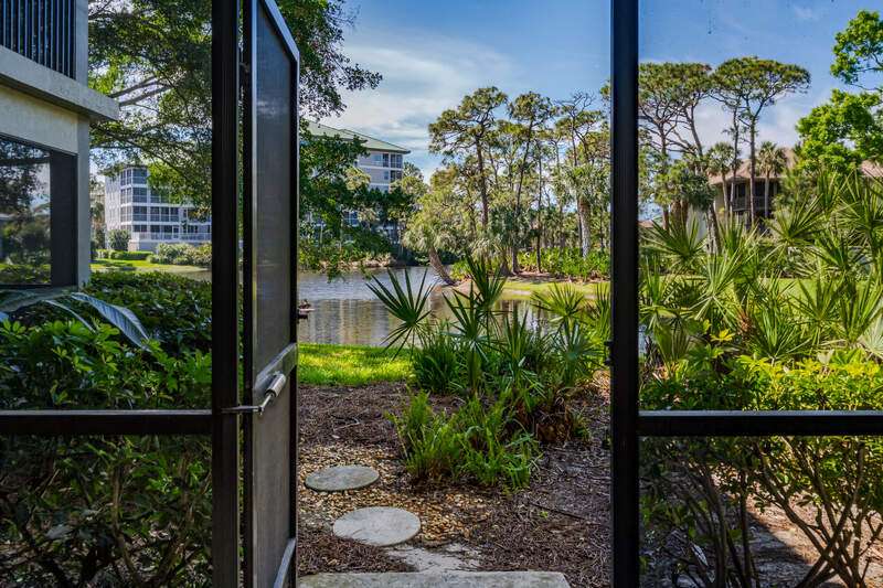 Peaceful setting with this first floor lakeside setting from Wild Pines E building. Two bedrooms, two baths, lovely patio overlooking the lake with access door, luxury vinyl flooring in living areas and tile in the bathrooms and kitchen. Updated kitchen open to the living room, soft close cabinets and drawers, in-home laundry. Offered furnished and available immediately. Enjoy Wild Pines pool and spa, tennis courts, Bonita Bay walking paths, parks and beach facilities. Experience all that Bonita Bay offers with access to a private marina, community beach facility, the finest club lifestyle available with the Bonita Bay Club's dining, golf, tennis, pickleball, fitness and spa facilities.