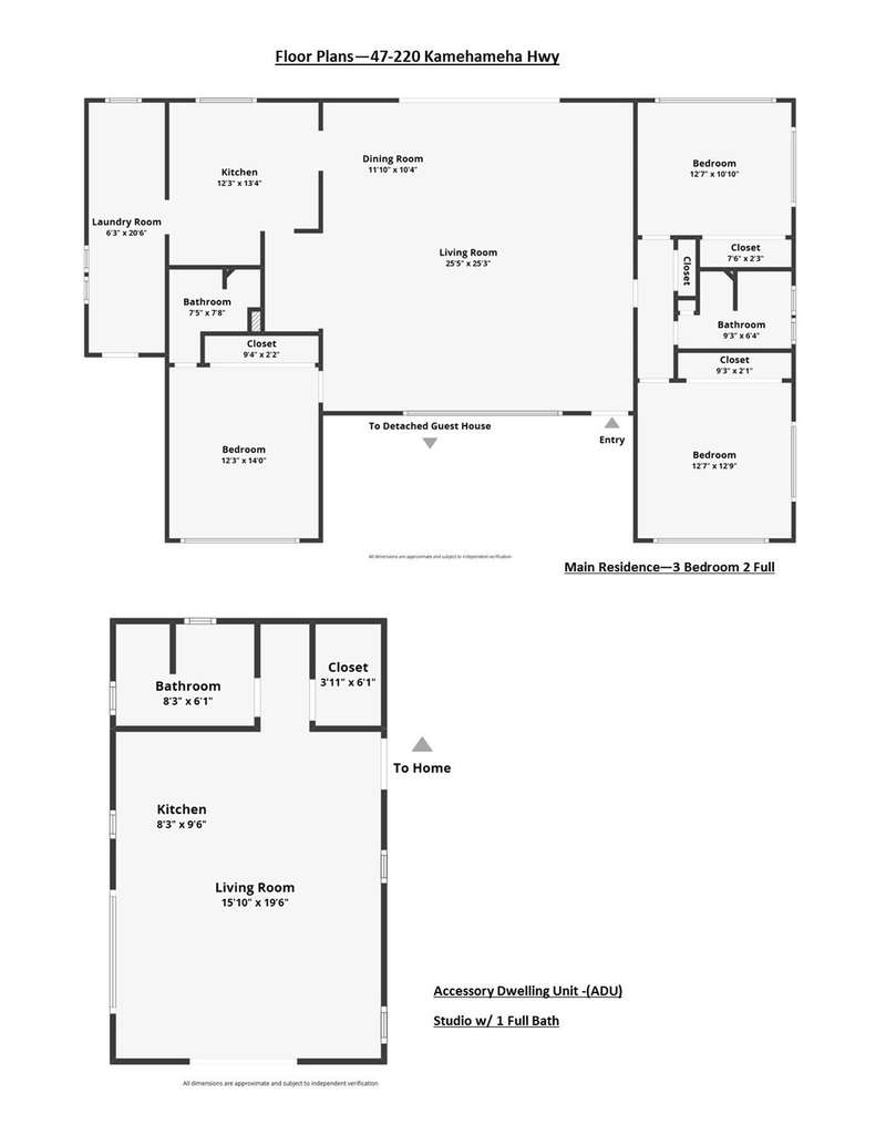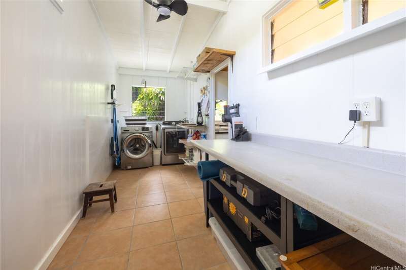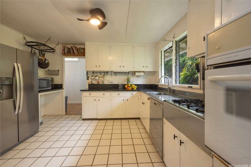 Welcome to Kaneohe Bay oceanside living on Oahu's Windward Coast! This charming single-family residence offers a flexible floor plan with a 3 bedrooms and 2 bath in the main home plus a legally permitted studio Accessory Dwelling Unit (ADU) with its own private & completely separate entrance from the main home with kitchenette, laundry, bath and carport-perfect for extended family, guests, or rental income. Set on a generous lot just down the street from the shoreline, this home captures the essence of island living with covered lanais, mature tropical landscaping, and ample parking. The main residence features an open-concept living area with natural light, original hardwood floors throughout, classic kitchen with original stainless steel counters, spacious bedrooms, 2 car garage with elevator/lift serving the upper primary home. Conveniently located near local shops, schools, and beaches, with easy access to He'eia Kea Boat Harbor, Kaneohe, Kailua, and Honolulu. Whether you're looking for a full-time residence, a coastal retreat, or a property with built-in rental potential, 47-220 Kamehameha Highway is a rare find on the Windward side.