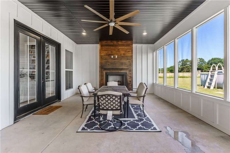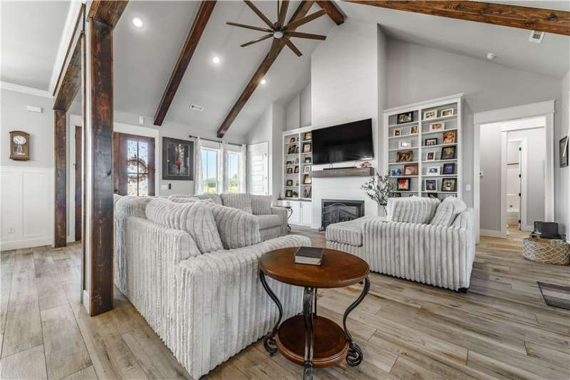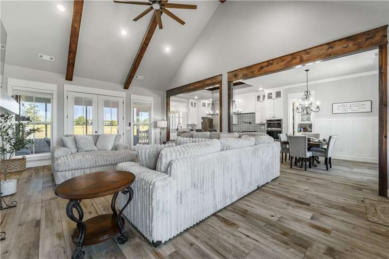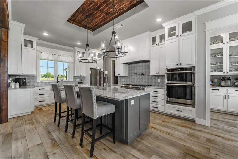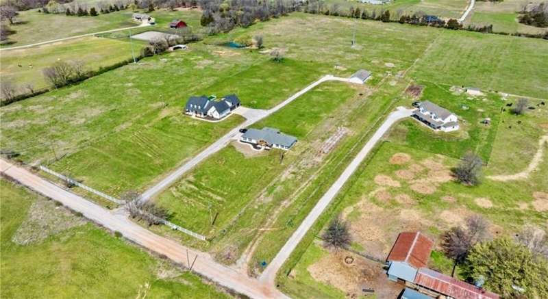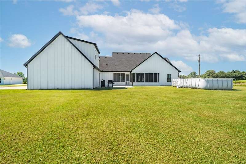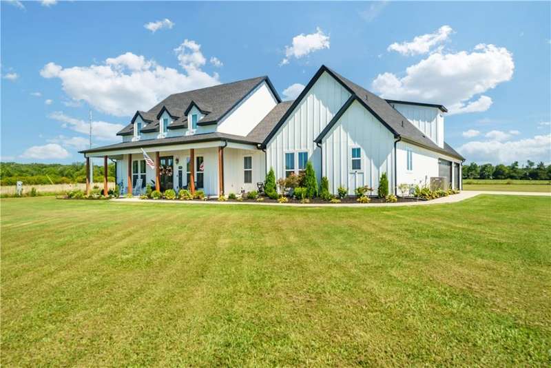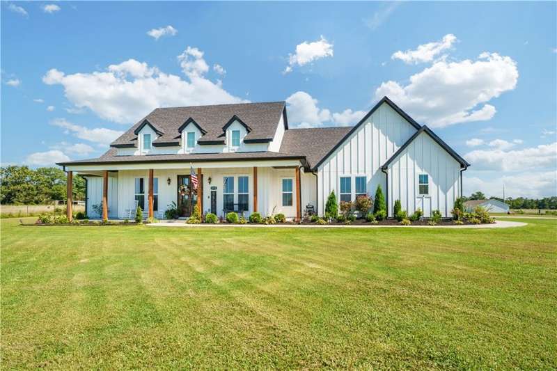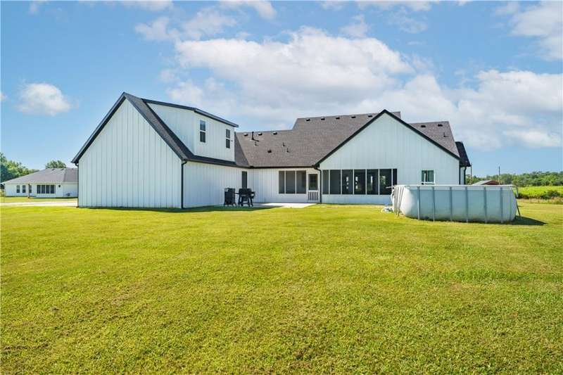 Welcome to this modern farmhouse perfectly positioned on 3 beautiful, flat acres! Impeccably maintained, this home was thoughtfully and intentionally designed for gathering. It offers predominantly main-level living with 3 bedrooms and 2 baths, and a spacious bonus/game room with a full bath upstairs that could be a 4th bedroom. An entertainers dream, the fully equipped gourmet kitchen offers practicality and style with a nice island bar and spacious dining area, a charming coffee bar and an oversized hidden pantry. The kitchen opens to the living room featuring a grand vaulted ceiling and built-ins flanking the TV/entertainment space. The living room extends to a fabulous screened in patio-a perfect setting for dining or kicking back to watch a game. Luxury with everyday comfort. The primary bedroom boasts a spacious walk-in closet connected to the laundry room, a spa-like en suite bath with freestanding tub and custom shower. Secluded, beautifully landscaped, 3-car garage. A few miles to XNA. A must see!