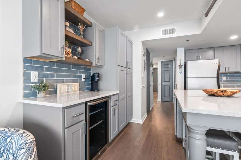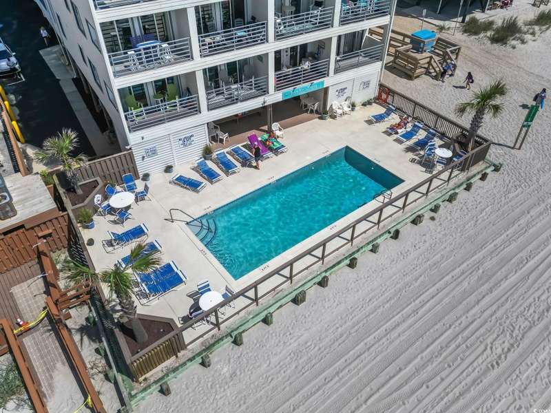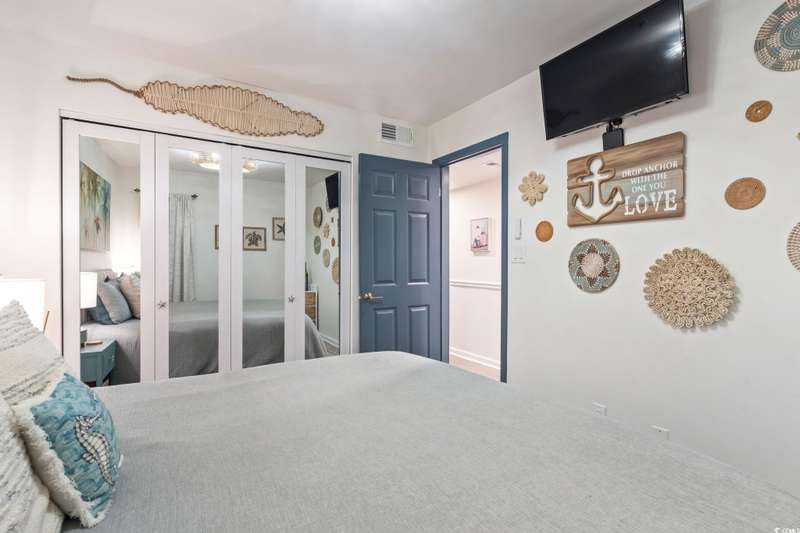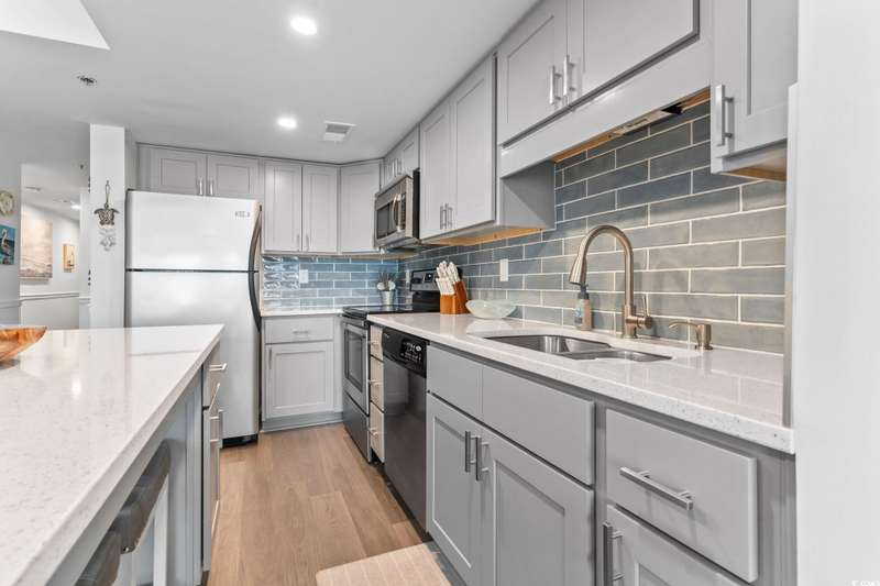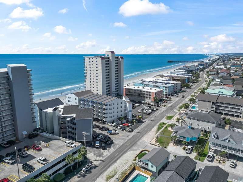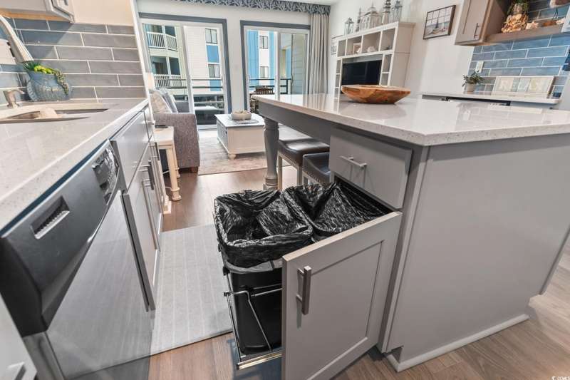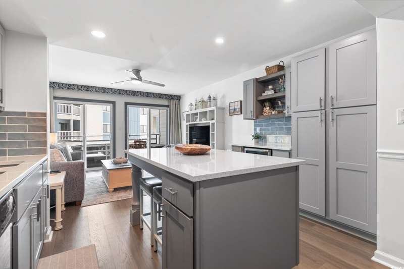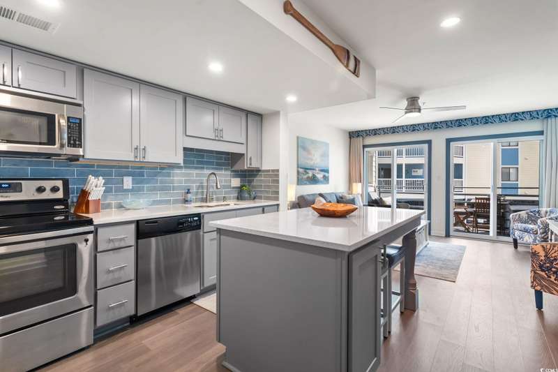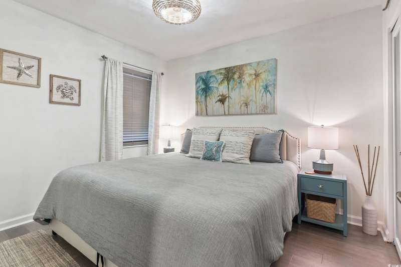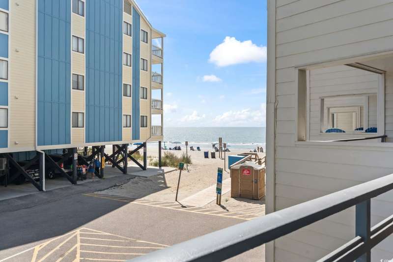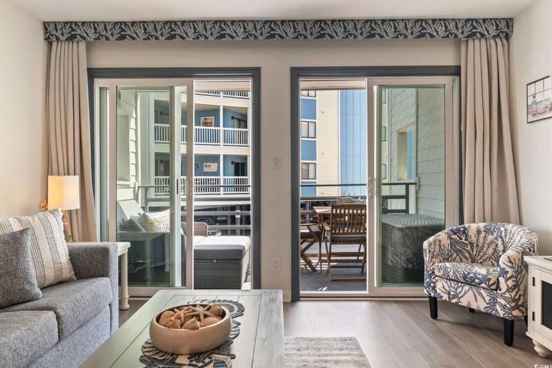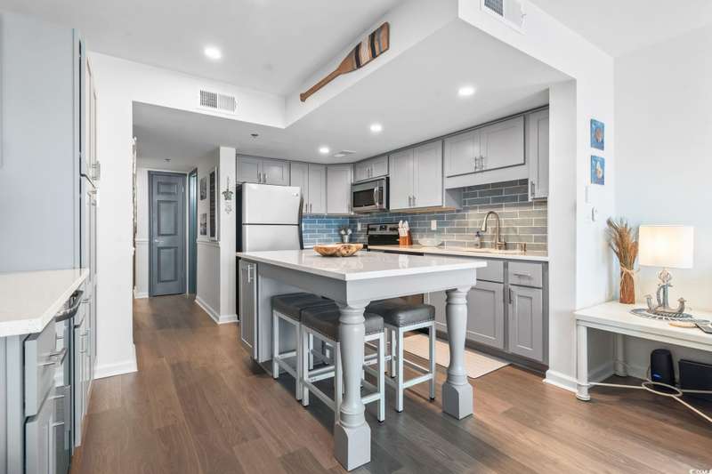 Fully Renovated Coastal Retreat in Carolina Shores – Garden City! This beautifully updated 1 bedroom, 1 bath unit was completely renovated in April 2024 and is located in an impeccably maintained oceanfront building. Freshly painted throughout, the unit features a customized kitchen with soft-close cabinets, quartz countertops, tiled backsplash, a custom island with bar seating and pull-out trash bins, a spacious pantry, built-in beverage station with mini fridge, and LED recessed lighting on dimmers. The inviting living room is thoughtfully designed for both comfort and functionality. Enjoy the natural light and ocean breeze through brand-new sliding glass doors that lead to your private balcony, where a cozy love seat lounger awaits with gorgeous views of the Atlantic Ocean. A custom cornice board adds a polished touch to the space. The living area also features a sleeper sofa with a memory foam mattress and a fold-out support board, perfect for accommodating overnight guests. For added versatility and privacy, a fold-out room divider easily separates the living area from the kitchen, making the space feel like a true guest retreat when needed. The primary bedroom offers a king-size bed with under-bed storage drawers and a custom closet. The bathroom includes a fully tiled walk-in shower and updated vanity. Additional upgrades include new Mohawk RevWood flooring over new subfloors, all-new electrical and panel, WiFi-enabled Nest thermostat, 2024 plumbing, new hot water heater, new ductwork and registers, and a recently serviced HVAC system. Enjoy resort-style amenities including an oceanfront pool, a beautifully landscaped sitting area underneath the building, and a scenic walkway and onsite laundry facility. HOA dues cover everything—including exterior insurance—with only electric as the owner's responsibility. Whether you're looking for a personal getaway or a turnkey rental, this coastal gem checks all the boxes!