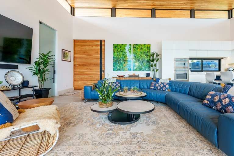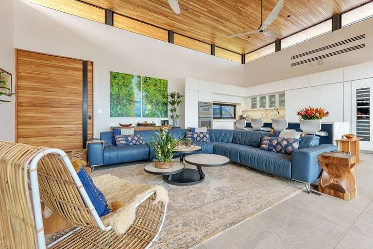 From the moment you enter, you are greeted by soaring 15-foot ceilings and expansive 25-foot sliding glass doors that disappear completely, creating a seamless flow between indoor and outdoor living. The open-concept living room and gourmet kitchen are flooded with natural light and appointed with high-end Thermador appliances, elegant finishes, and imported Roche Bobois furnishings from Paris, providing a refined and sophisticated atmosphere.