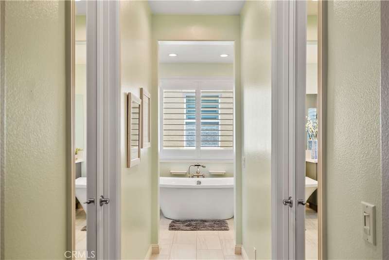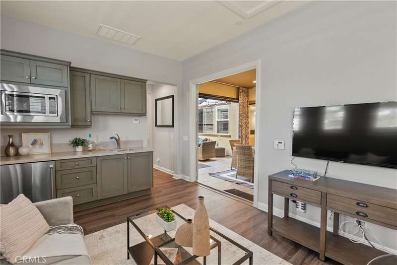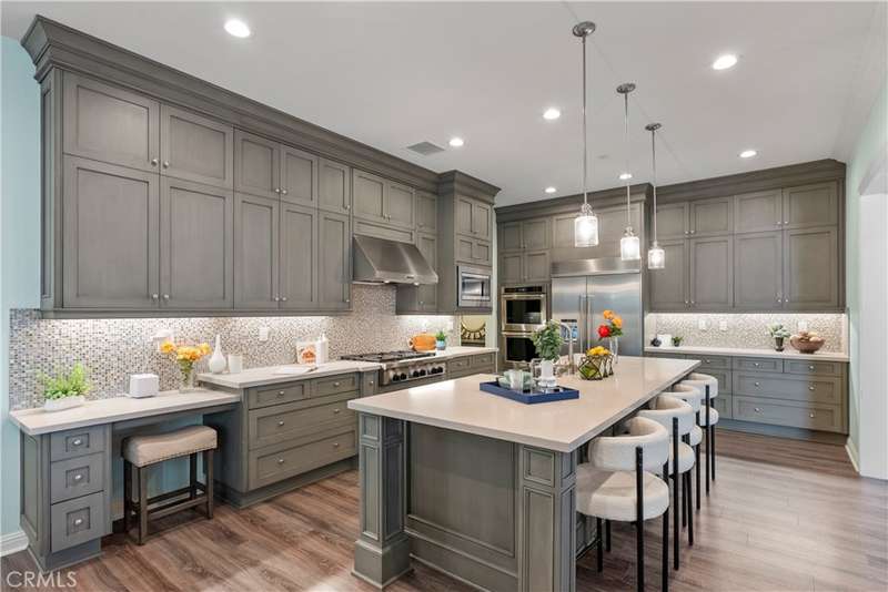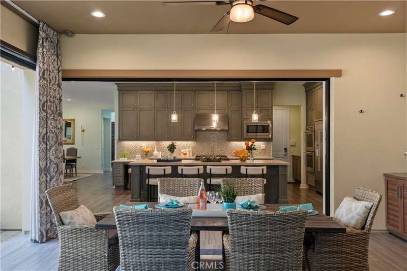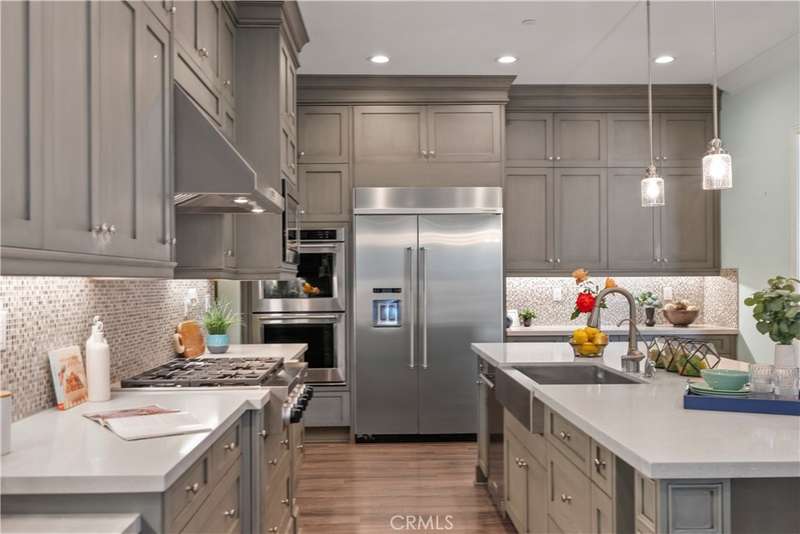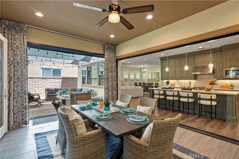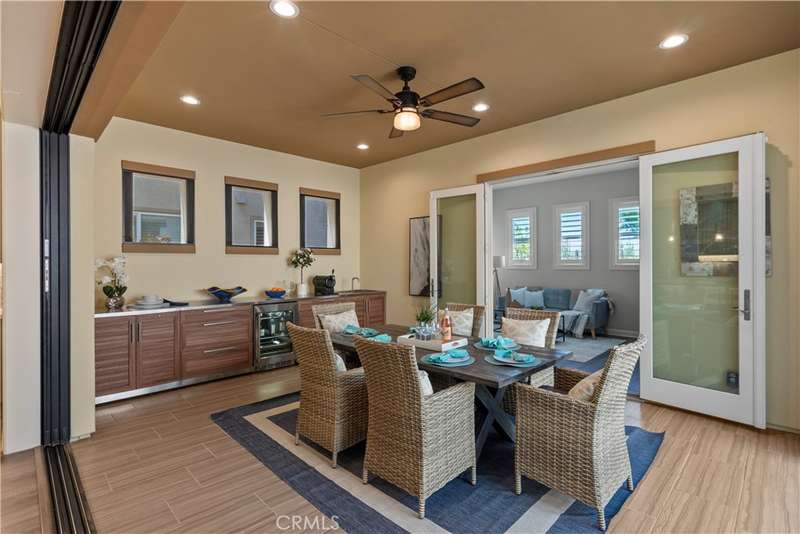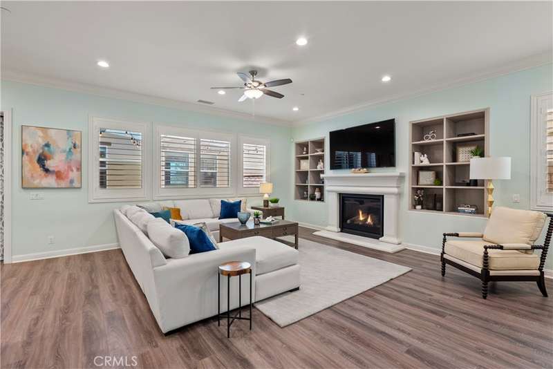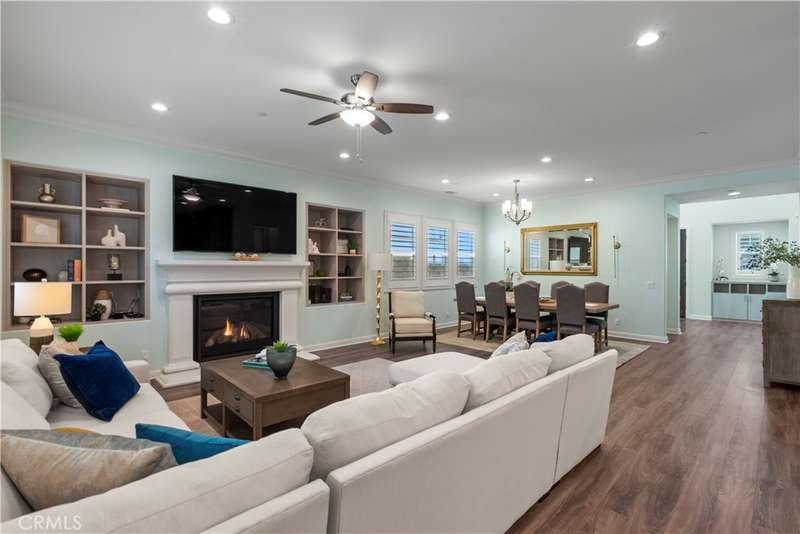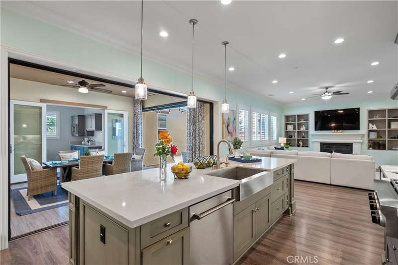 The open floor plan is flooded with natural light and features a cozy fireplace, generous living areas, and a chef-inspired kitchen with an oversized quartz island, wraparound breakfast bar, full-height soft-close cabinetry, built-in refrigerator, high-end stainless steel appliances, farmhouse sink, walk-in pantry, reverse osmosis system, built-in desk, drop zone, and designer lighting. Expansive pocketing glass doors open to a stunning California Room, outfitted with custom cabinetry, a wine and beverage refrigerator, and motorized screens and drapes for ideal indoor-outdoor entertaining.