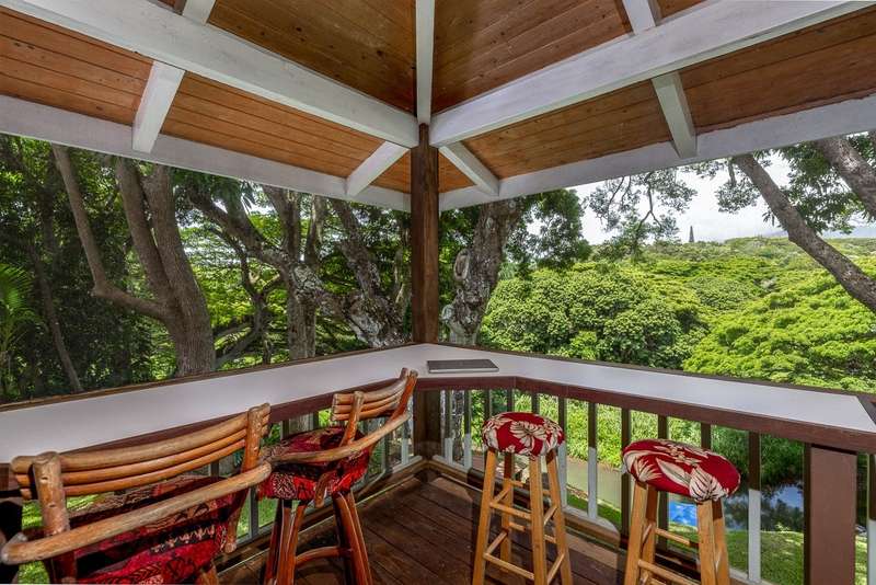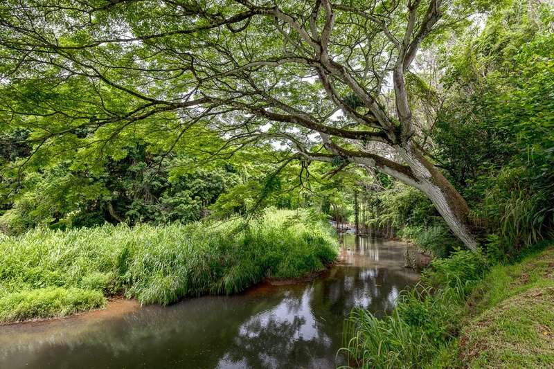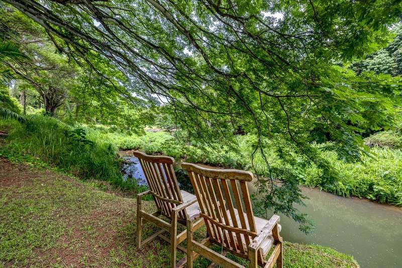 Being the last house up the valley, there is minimal vehicular traffic. From the property one can walk, hike, bike, or ride horses for miles along country roads or just stay at home and fish for bass in the backyard, then slip down one of the water slides for a dip in the stream! Yet, while it feels incredibly remote, the property is just minutes from public/private schools and within close proximity to the super fun restaurant/live music/bar hopping town of Kapaa.