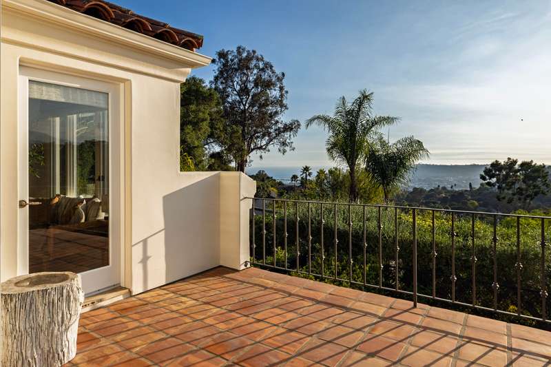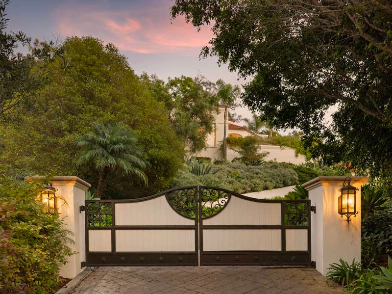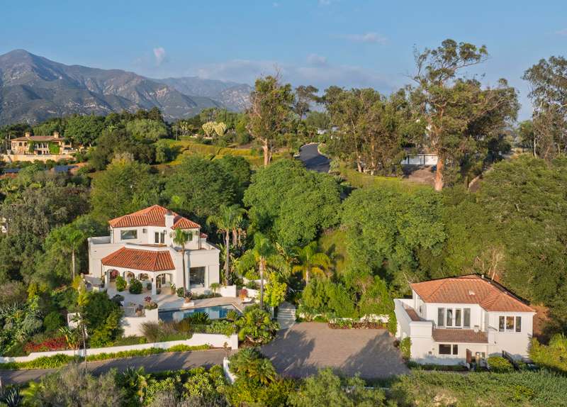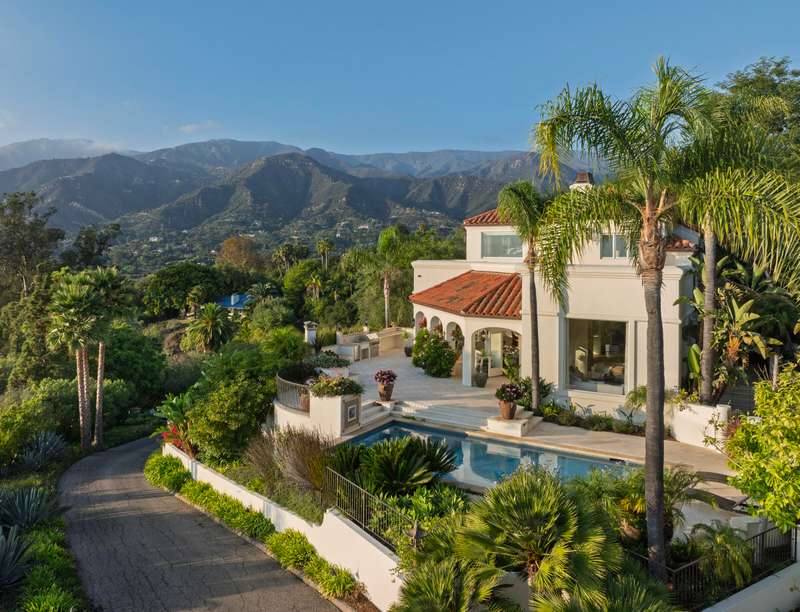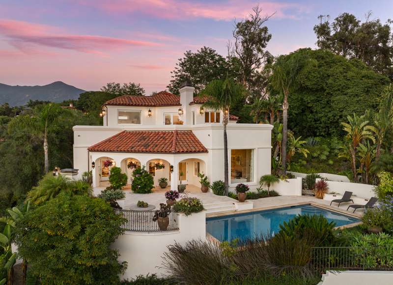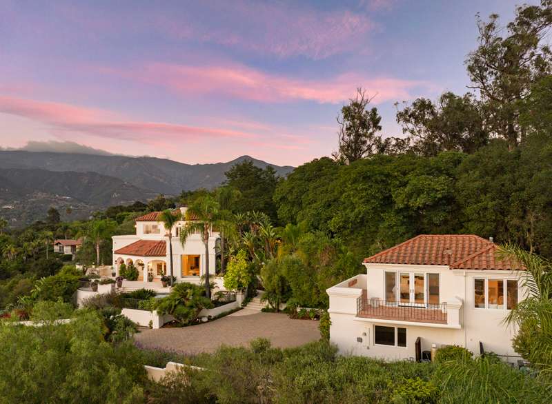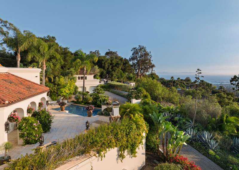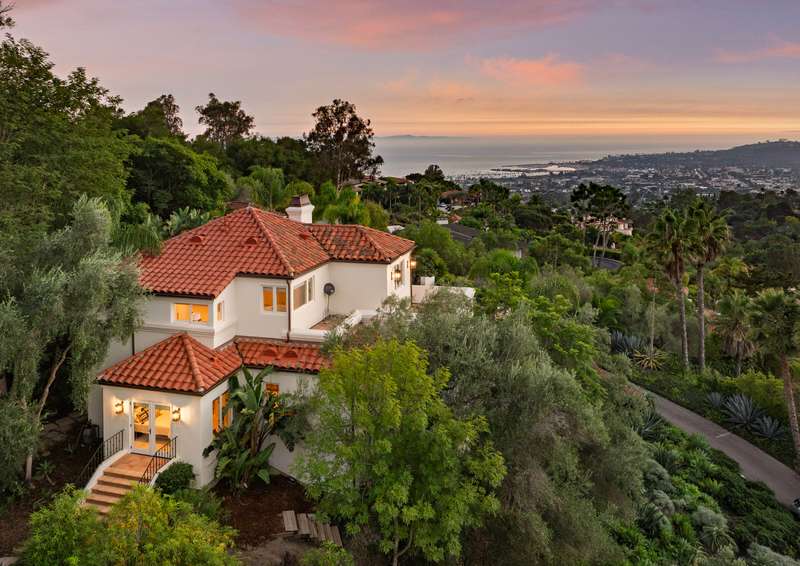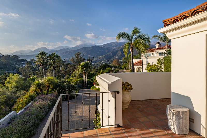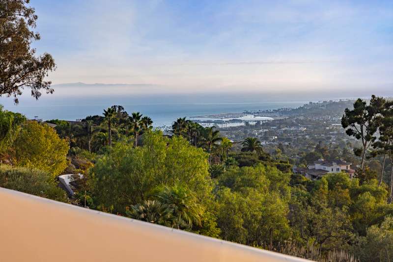 Behind private gates on Calle Elegante, a world of serenity and beauty unfolds on 1.7 lush acres. The moment you step inside, walls of glass reveal sweeping views of the ocean, islands, harbor, and mountains--reminders that this is no ordinary home, but a sanctuary elevated by nature itself. The story begins in the heart of the house, where soaring ceilings, stone floors, and a fireplace anchor the formal living room. Light pours in, filling the space with warmth, while the dining and family rooms blend seamlessly with the kitchen, creating an open, effortless flow for gatherings both large and small. Upstairs, the primary suite continues the story of retreat and renewal. With its own sitting room, private fireplace, and adjoining office, it's a place to wake slowly to the sunrise or wind down as the evening light paints the horizon. Two additional en-suite bedrooms carry the story further: one with doors that open directly to a secret garden hideaway, and the other framing the drama of the mountains. Step outside, and the home transforms into a private resort carved into the hillside. Inspired by the love of the Bacara Resort, the current owner designed the pool terrace to rival the luxury of a five-star retreat without ever leaving home. A sparkling pool shimmers in the sunlight, anchored by a covered patio with outdoor fireplace, a fully equipped outdoor kitchen, and multiple lounge areas. Here, mornings begin with quiet coffee overlooking the coastline, and evenings end with golden sunsets shared among friends. For visitors, a private guest suite above the garage offers decks, views, and independence a retreat within a retreat. Surrounding it all are lovely gardens, a koi pond, and mature trees that have grown into characters of their own, wrapping the home in shade, color, and year-round beauty.