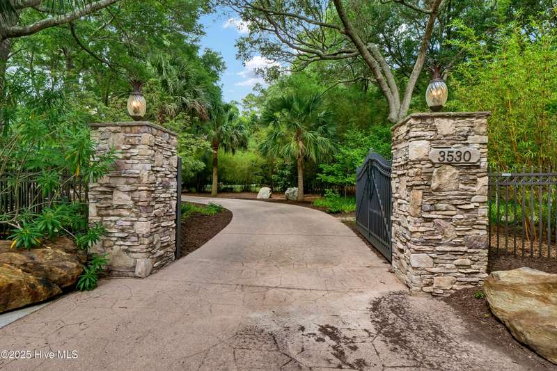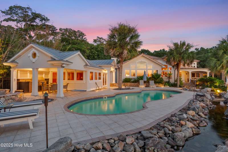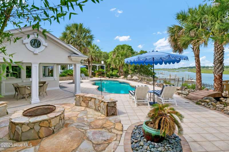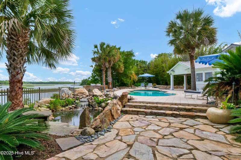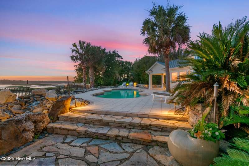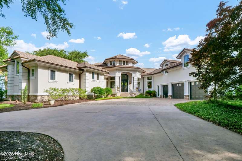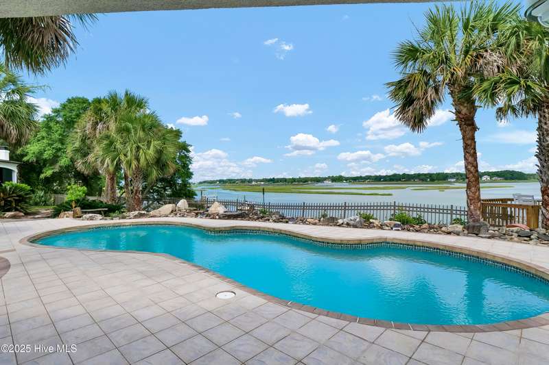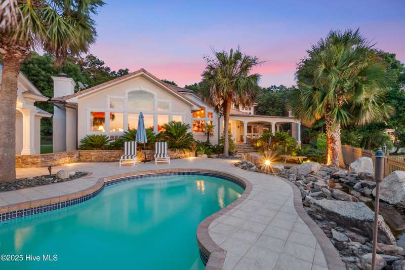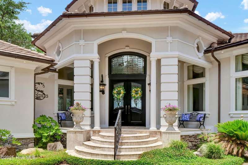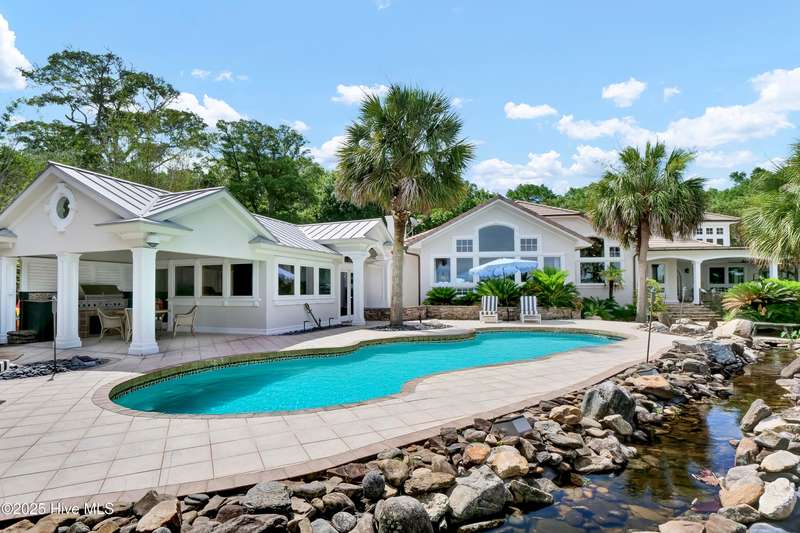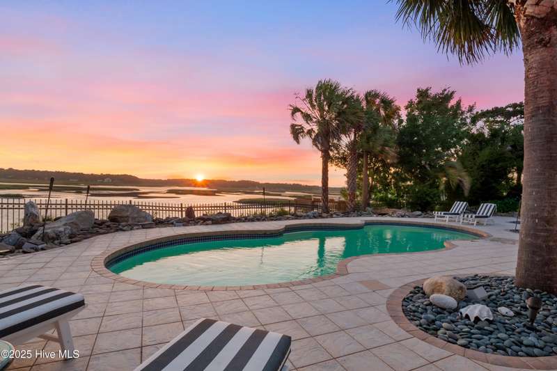 Poised on a high bluff above the Shallotte River with sweeping views to the Intracoastal Waterway and vibrant sunset skies, this exceptional 2.67-acre estate offers privacy, resort-style living, and direct water access. With over 320 feet of water frontage, a private dock, and access to a neighborhood boat ramp, it's the ideal retreat for those who value space, serenity, and a true boating lifestyle.Tucked behind three gated entrances with a fully fenced perimeter, the property features mature & manicured grounds, a koi pond, putting green, and a circular drive leading to an oversized three-car garage. A 65kW whole-house generator ensures comfort year-round.Inside, the home is finished with Brazilian cherry hardwoods, marble tile, and impact-rated Andersen doors and windows. The grand foyer boasts a domed cathedral ceiling hand-painted with cherubs and a crystal chandelier. Nearly every room captures river or pool views.The formal dining room showcases Italian-inspired details, while the chef's kitchen features handcrafted cabinetry, premium appliances, and a bright breakfast nook. The living room includes a fireplace, built-ins, and wet barperfect for entertaining. The split floor plan includes a private primary suite, two guest ensuites, and a large upstairs bonus room with full bath.Outdoor amenities include a resort-style pool, pool house with kitchenette and full bath, covered dining, grill area, fire pit, and a footbridge leading to an elevated sunset deck overlooking the water.