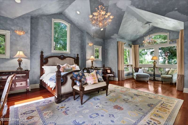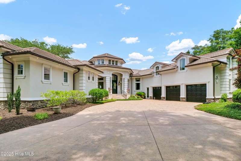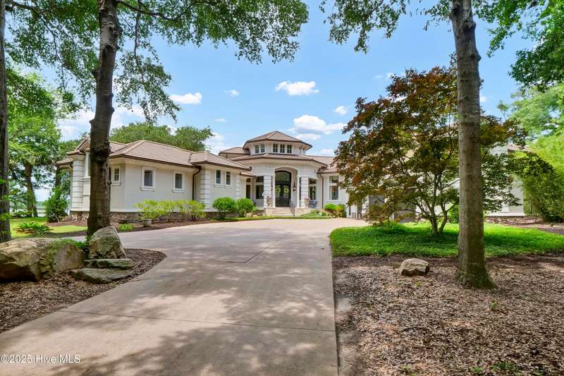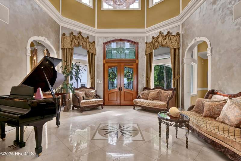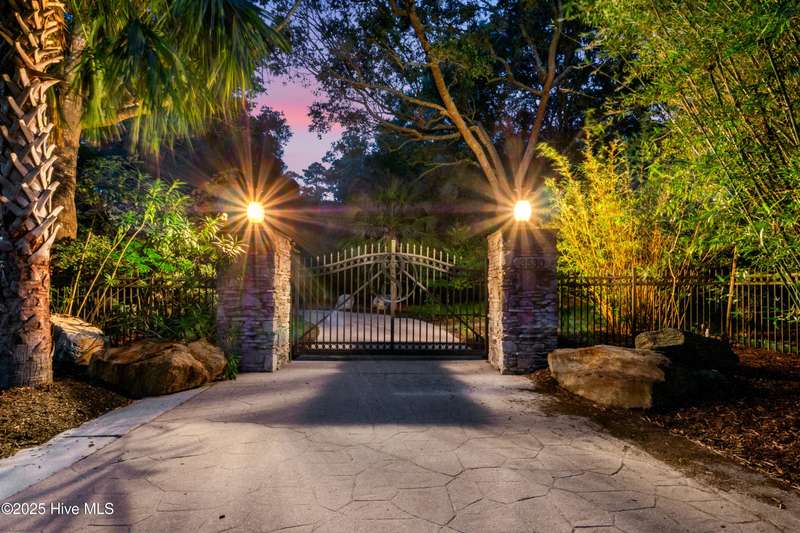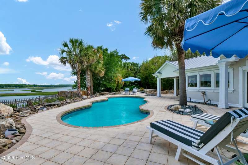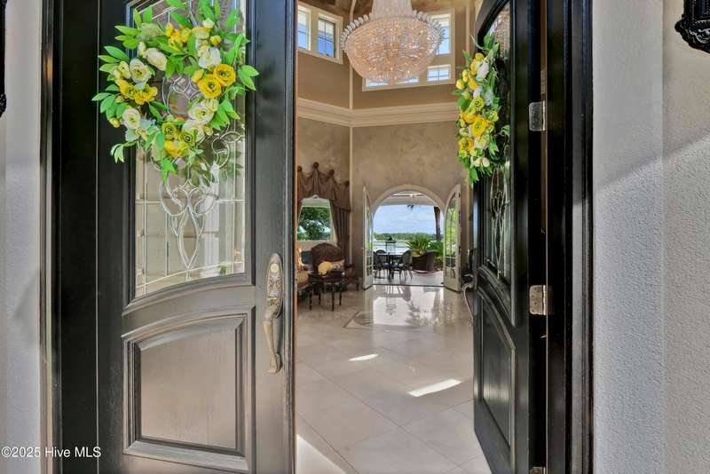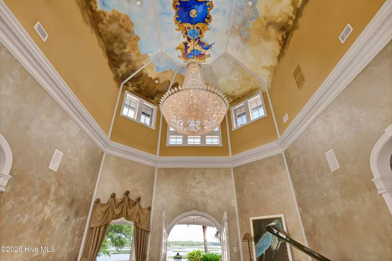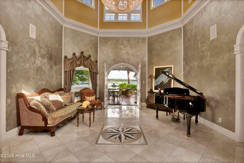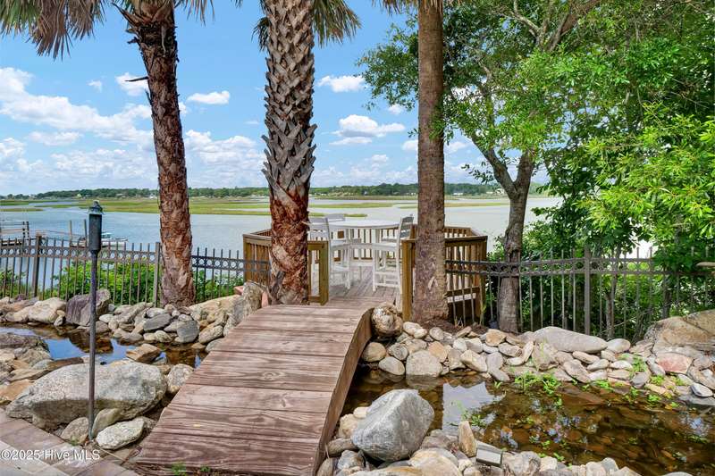 Poised on a high bluff above the Shallotte River with sweeping views to the Intracoastal Waterway and vibrant sunset skies, this exceptional 2.67-acre estate offers privacy, resort-style living, and direct water access. With over 320 feet of water frontage, a private dock, and access to a neighborhood boat ramp, it's the ideal retreat for those who value space, serenity, and a true boating lifestyle.Tucked behind three gated entrances with a fully fenced perimeter, the property features mature & manicured grounds, a koi pond, putting green, and a circular drive leading to an oversized three-car garage. A 65kW whole-house generator ensures comfort year-round.Inside, the home is finished with Brazilian cherry hardwoods, marble tile, and impact-rated Andersen doors and windows. The grand foyer boasts a domed cathedral ceiling hand-painted with cherubs and a crystal chandelier. Nearly every room captures river or pool views.The formal dining room showcases Italian-inspired details, while the chef's kitchen features handcrafted cabinetry, premium appliances, and a bright breakfast nook. The living room includes a fireplace, built-ins, and wet barperfect for entertaining. The split floor plan includes a private primary suite, two guest ensuites, and a large upstairs bonus room with full bath.Outdoor amenities include a resort-style pool, pool house with kitchenette and full bath, covered dining, grill area, fire pit, and a footbridge leading to an elevated sunset deck overlooking the water.