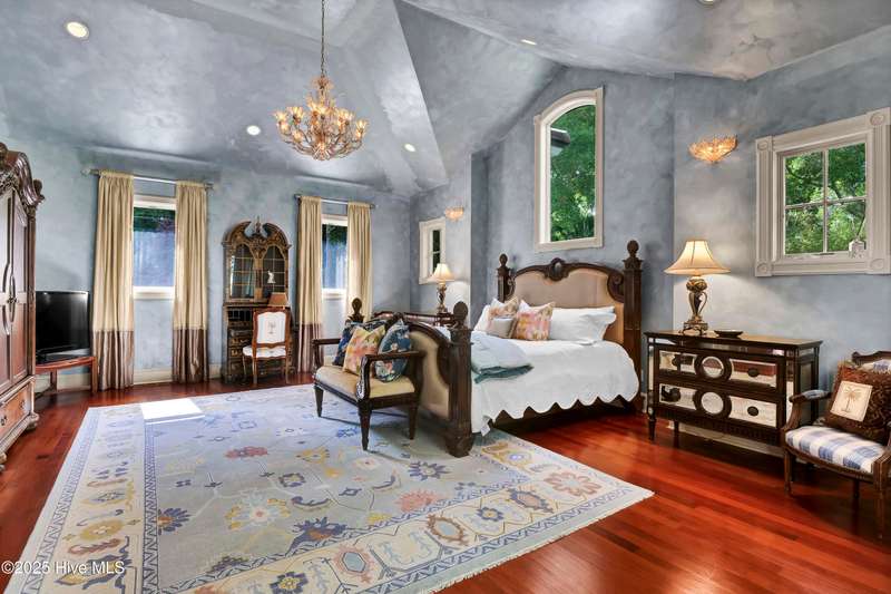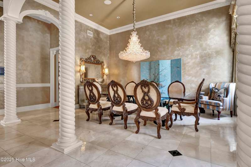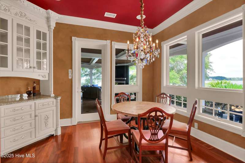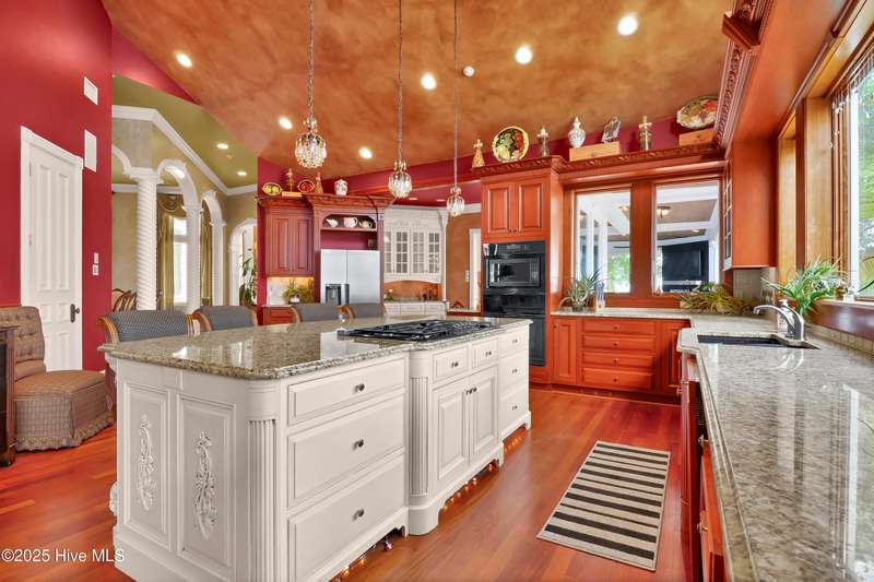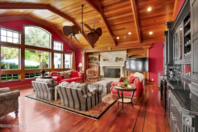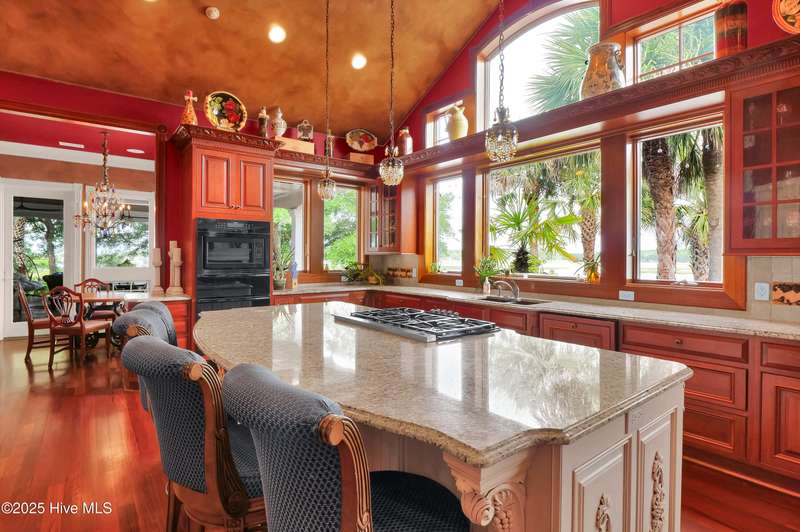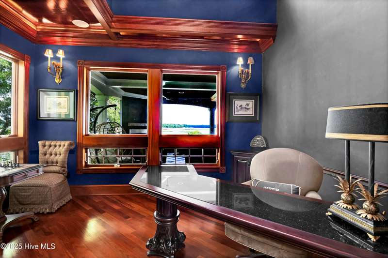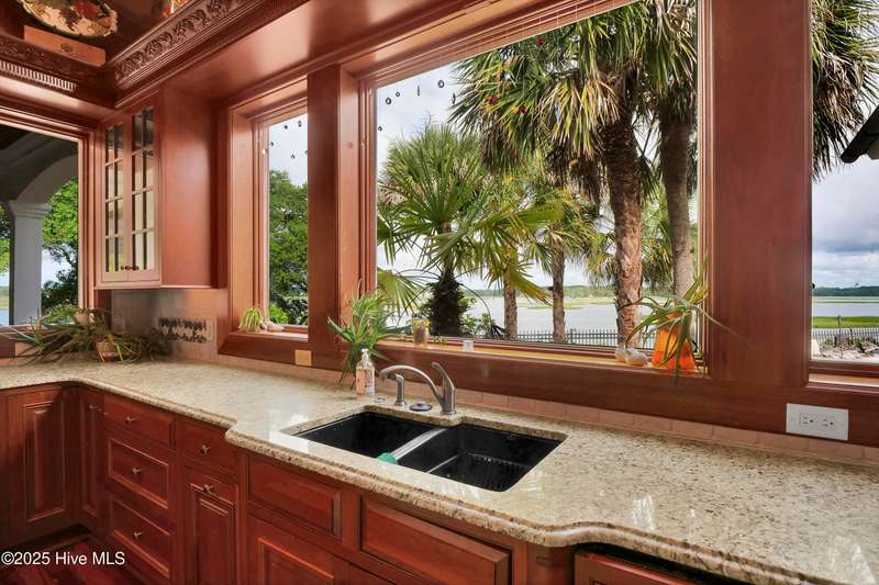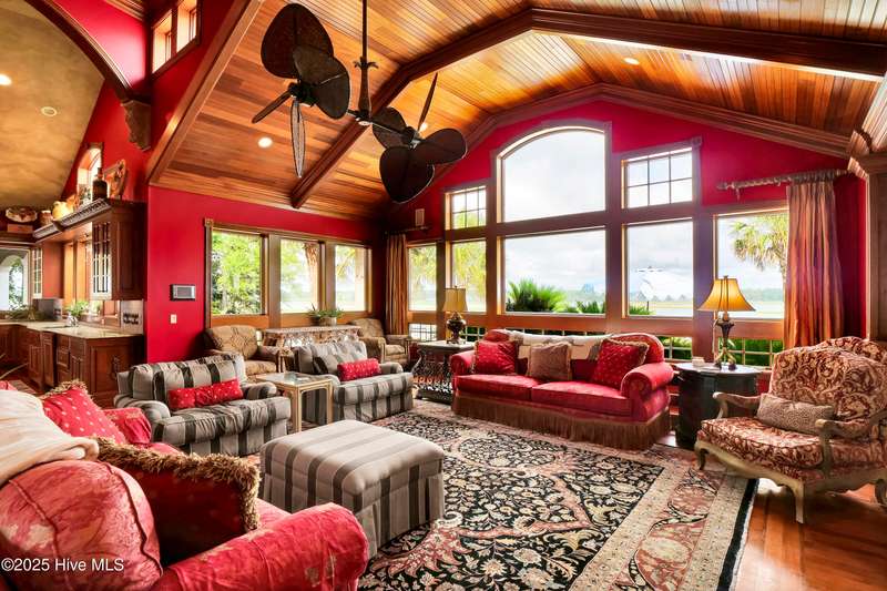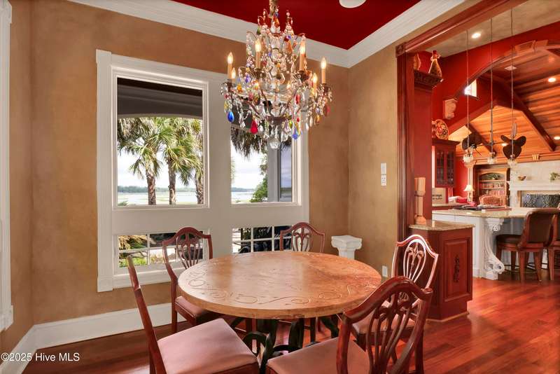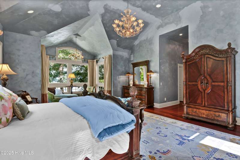 Poised on a high bluff above the Shallotte River with sweeping views to the Intracoastal Waterway and vibrant sunset skies, this exceptional 2.67-acre estate offers privacy, resort-style living, and direct water access. With over 320 feet of water frontage, a private dock, and access to a neighborhood boat ramp, it's the ideal retreat for those who value space, serenity, and a true boating lifestyle.Tucked behind three gated entrances with a fully fenced perimeter, the property features mature & manicured grounds, a koi pond, putting green, and a circular drive leading to an oversized three-car garage. A 65kW whole-house generator ensures comfort year-round.Inside, the home is finished with Brazilian cherry hardwoods, marble tile, and impact-rated Andersen doors and windows. The grand foyer boasts a domed cathedral ceiling hand-painted with cherubs and a crystal chandelier. Nearly every room captures river or pool views.The formal dining room showcases Italian-inspired details, while the chef's kitchen features handcrafted cabinetry, premium appliances, and a bright breakfast nook. The living room includes a fireplace, built-ins, and wet barperfect for entertaining. The split floor plan includes a private primary suite, two guest ensuites, and a large upstairs bonus room with full bath.Outdoor amenities include a resort-style pool, pool house with kitchenette and full bath, covered dining, grill area, fire pit, and a footbridge leading to an elevated sunset deck overlooking the water.