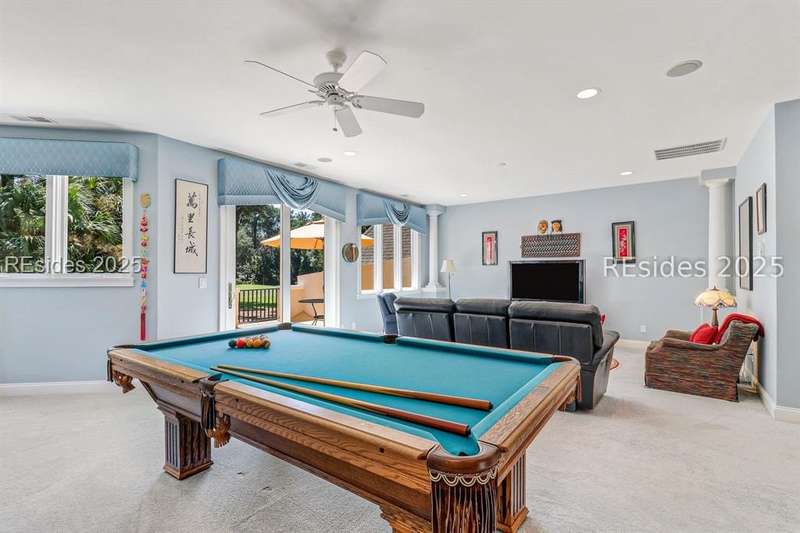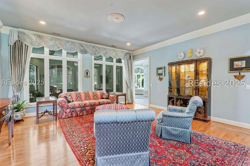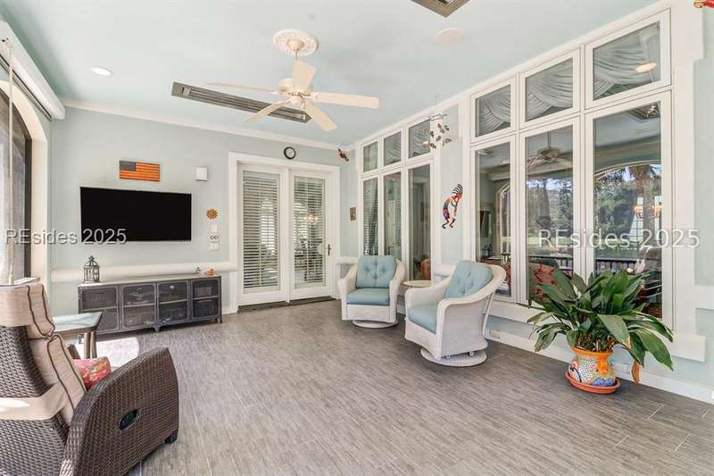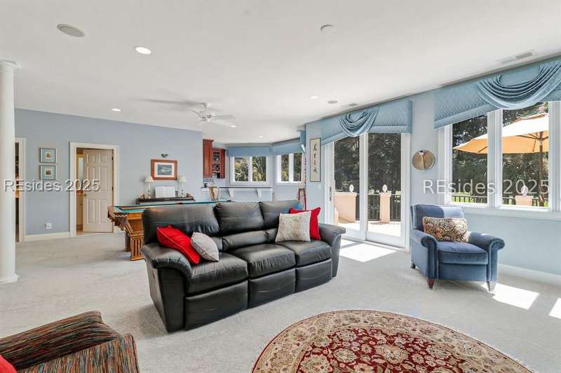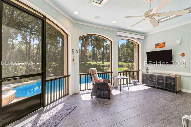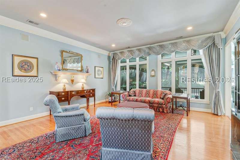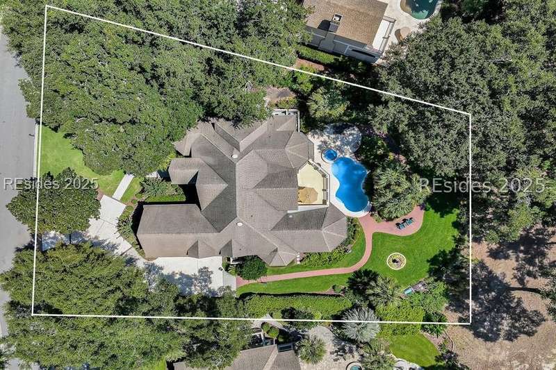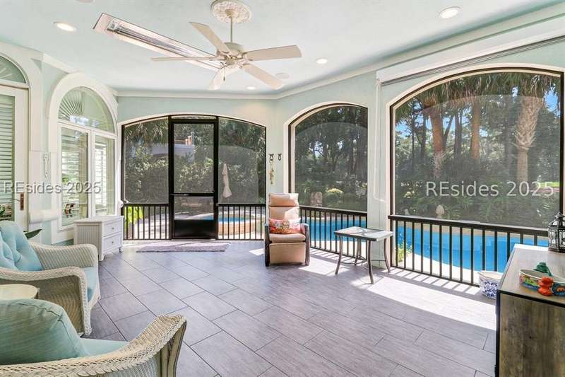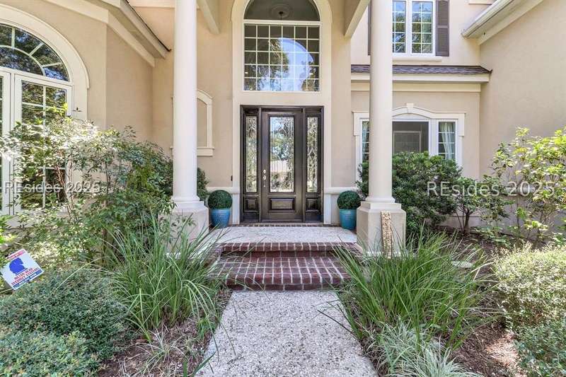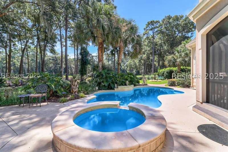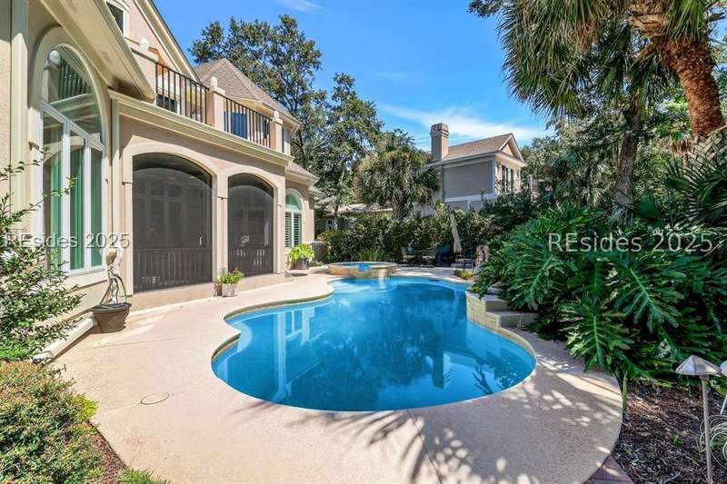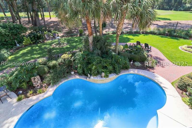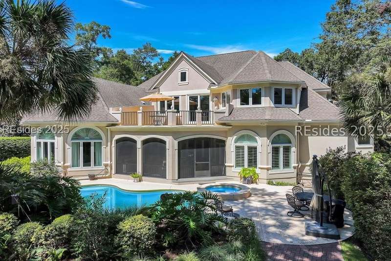 The combination of one of the most private locations and a custom design gives this home an estate-style feel in The Golf Club at Indigo Run. Few details were spared in the impressive updates to the kitchen and primary bath. The heart of the home features a stunning chef's kitchen with high-end Sub-Zero and Wolf appliances, quartz waterfall countertops, large walk-in pantry, abundant cabinets and counter space with a prep sink in the island, and an open flow into the expansive family room--flooded with natural light from its southern exposure. Adjoining the family room is a screened-in porch with built-in heaters for year-round enjoyment, which overlooks the heated freeform pool and spa. Formal living and dining rooms add elegance, while the spacious primary suite on the left wing of the home offers privacy and comfort and includes two large walk-in closets and a spectacular, recently renovated primary bath features separate vanities, a free-standing tub and walk-in shower. The handsome study/office at the front of the home provides the perfect work-from-home space with its built-in cabinets and shelves. A dramatic staircase leads from the marble foyer to three additional bedrooms and a large bonus room with pool table, plus an additional room adjoining one of the bedrooms, offering multiple use options. An oversized balcony is accessed from the bonus room and offers vistas of one of the most secluded and serene settings within Indigo Run. This home is for an owner who wants the luxury of space and flexibility of a gracious home complemented by a spectacular private location. Really must see to appreciate the expansive panoramic gardens, views of the 12th Hole of the Golf Club, and the private setting that photos can't convey.
