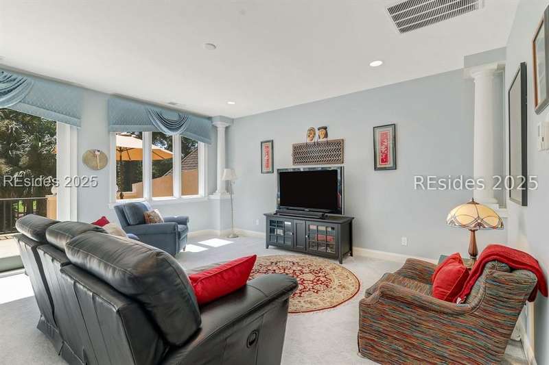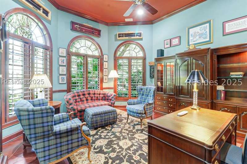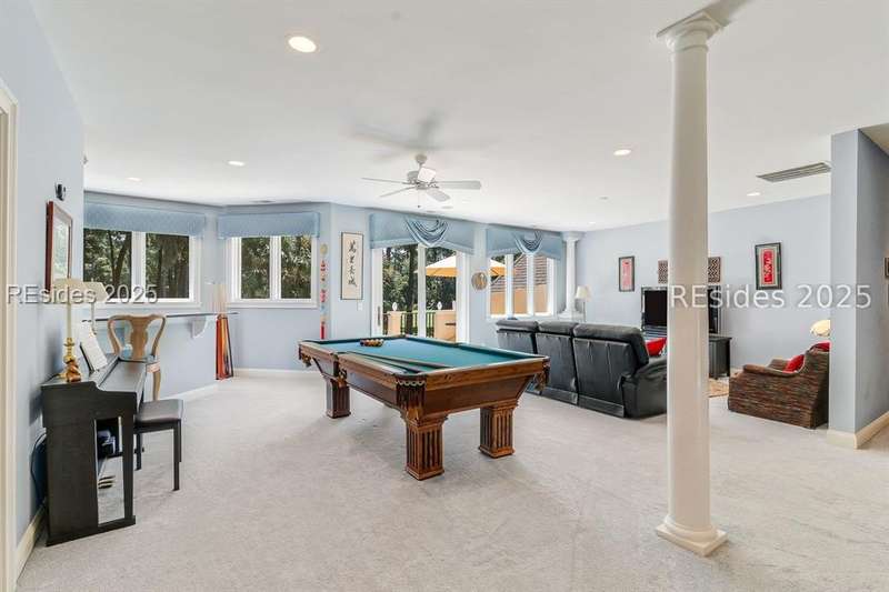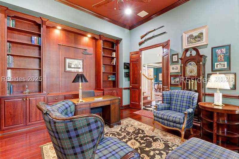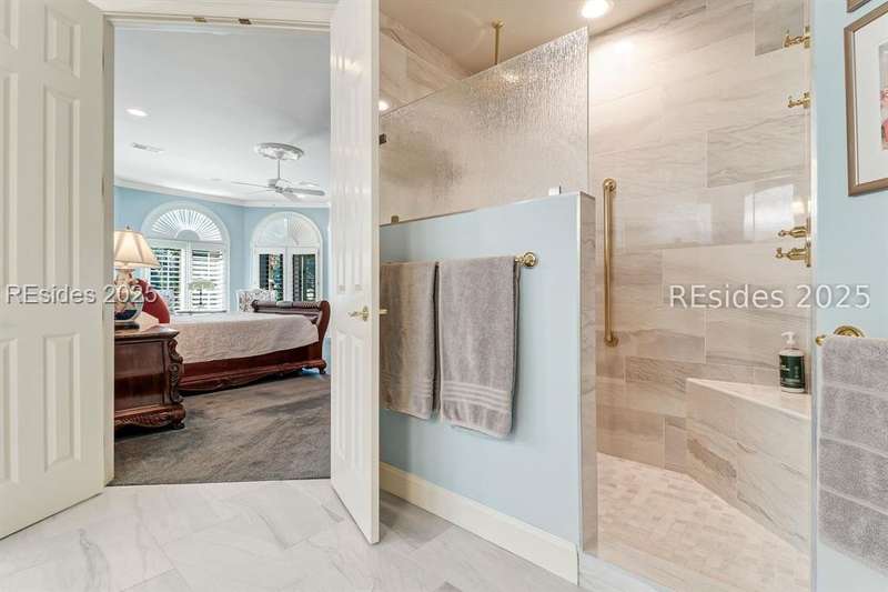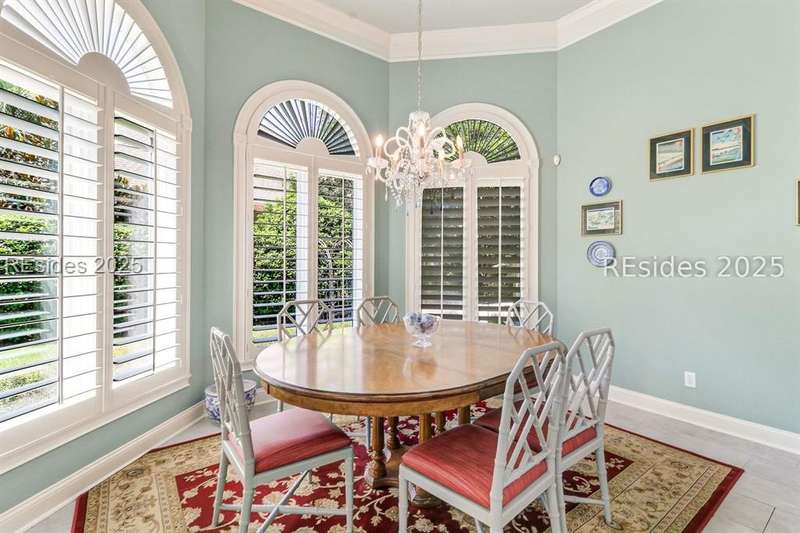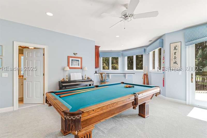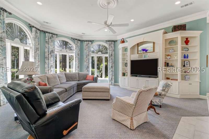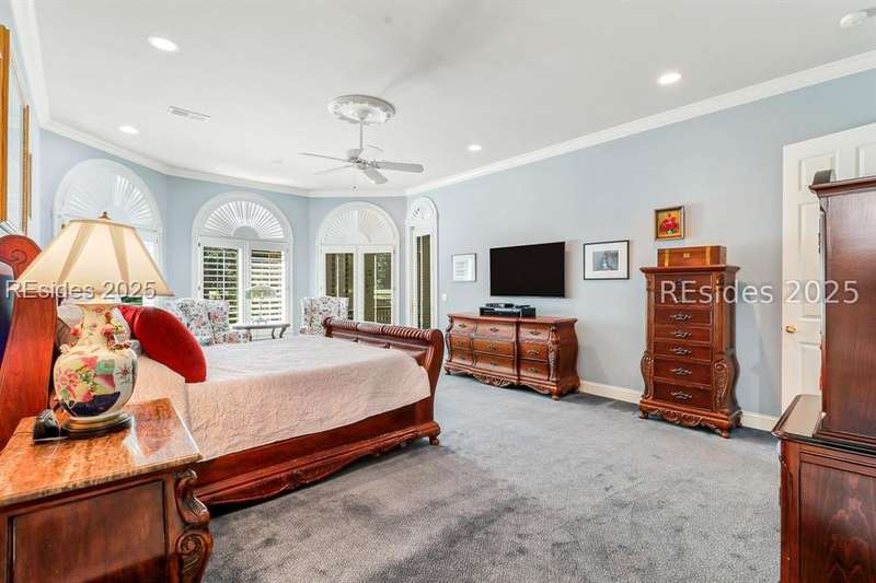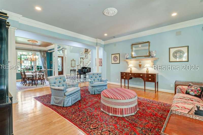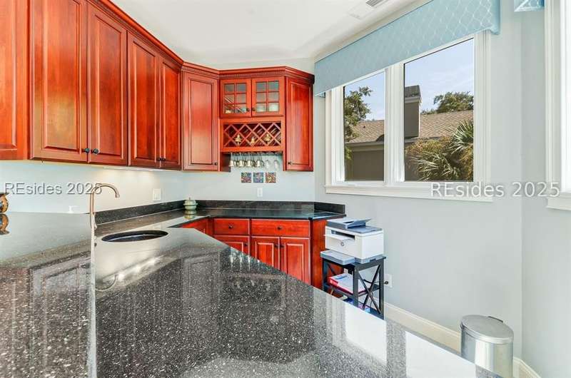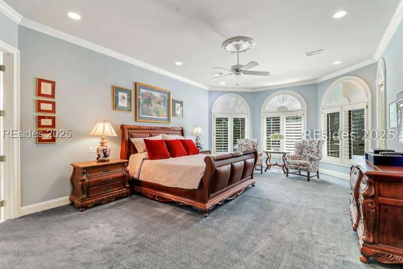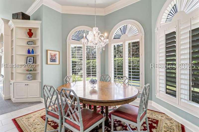 The combination of one of the most private locations and a custom design gives this home an estate-style feel in The Golf Club at Indigo Run. Few details were spared in the impressive updates to the kitchen and primary bath. The heart of the home features a stunning chef's kitchen with high-end Sub-Zero and Wolf appliances, quartz waterfall countertops, large walk-in pantry, abundant cabinets and counter space with a prep sink in the island, and an open flow into the expansive family room--flooded with natural light from its southern exposure. Adjoining the family room is a screened-in porch with built-in heaters for year-round enjoyment, which overlooks the heated freeform pool and spa. Formal living and dining rooms add elegance, while the spacious primary suite on the left wing of the home offers privacy and comfort and includes two large walk-in closets and a spectacular, recently renovated primary bath features separate vanities, a free-standing tub and walk-in shower. The handsome study/office at the front of the home provides the perfect work-from-home space with its built-in cabinets and shelves. A dramatic staircase leads from the marble foyer to three additional bedrooms and a large bonus room with pool table, plus an additional room adjoining one of the bedrooms, offering multiple use options. An oversized balcony is accessed from the bonus room and offers vistas of one of the most secluded and serene settings within Indigo Run. This home is for an owner who wants the luxury of space and flexibility of a gracious home complemented by a spectacular private location. Really must see to appreciate the expansive panoramic gardens, views of the 12th Hole of the Golf Club, and the private setting that photos can't convey.