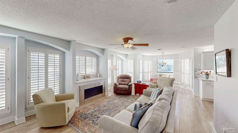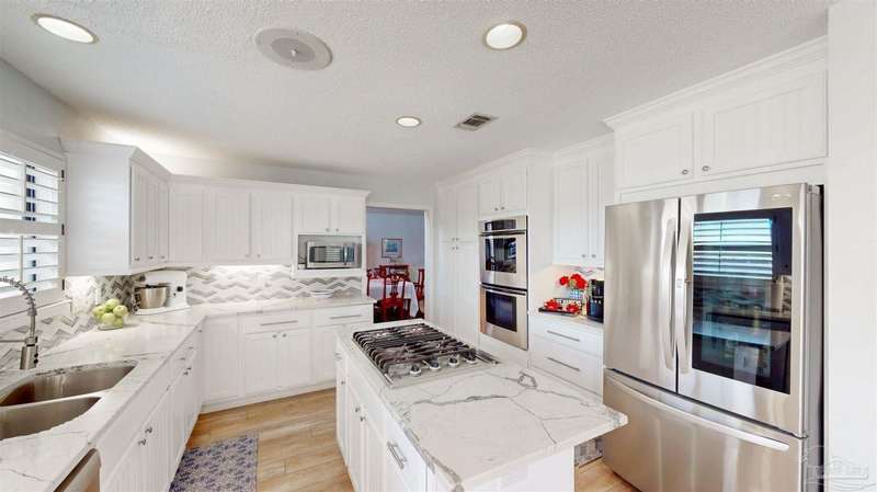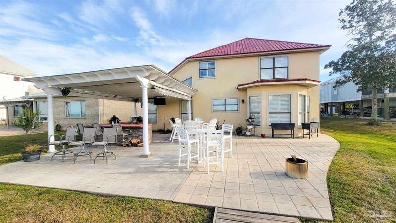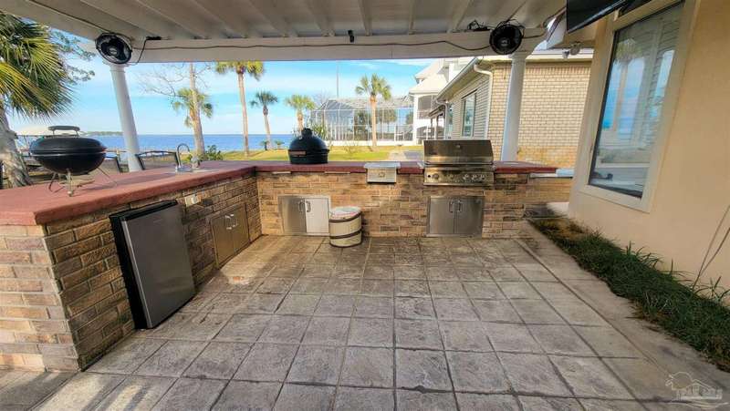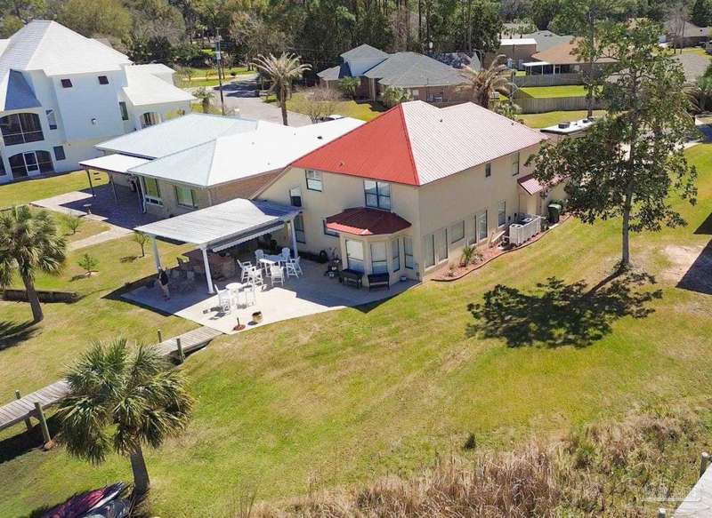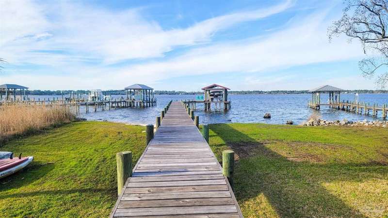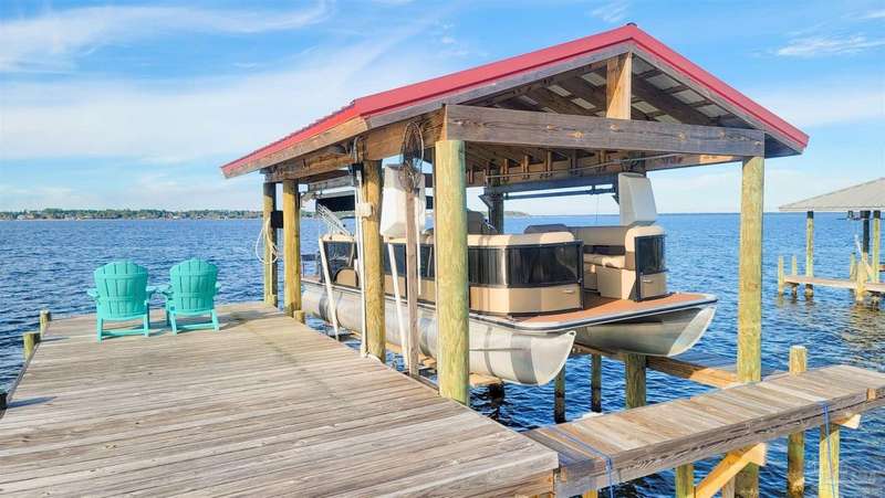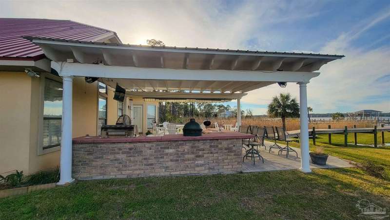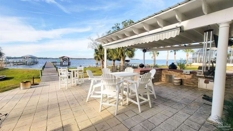 OPEN HOUSE Sunday October 12th 1-4pm.... Experience the ultimate in coastal living and entertaining at this stunning waterfront retreat on Perdido Bay! This beautifully updated 4-bedroom, 3-bathroom home is designed for seamless indoor and outdoor living, offering breathtaking views, modern updates, and an entertainer's dream backyard. Inside, enjoy 2,432 sq ft of thoughtfully designed space with luxury vinyl plank flooring (2021) and elegant plantation shutters throughout. The spacious living room features a ventless gas fireplace with remote, creating a cozy yet sophisticated ambiance. The gourmet kitchen is a chef's delight, boasting quartz countertops, a glass backsplash, pullout drawers in shaker cabinets, and high-end appliances including Thermador double ovens, a Viking gas cooktop, and an LG refrigerator. Step outside to your private waterfront paradise, where indoor comfort flows effortlessly into outdoor luxury. The covered outdoor kitchen is fully equipped with a Big Green Egg, Jenn-Air grill, refrigerator, poured concrete bar, sink, and a powered sunshade with remote-perfect for hosting gatherings year-round. Enjoy stunning sunsets from your private boat dock, complete with a covered boathouse, lift, power, and water access, making it ideal for boaters and water enthusiasts. Sitting on a 0.38-acre lot, this home offers both tranquility and convenience, with a metal roof (2021), refreshed stucco (2020), and an irrigation system to keep the lush landscaping vibrant. Whether you're relaxing by the bay, hosting lively get-togethers, or enjoying a quiet evening by the fire, this home offers the perfect blend of luxury, comfort, and coastal charm. Don't miss your chance to own a true indoor-outdoor entertainer's paradise on Perdido Bay!