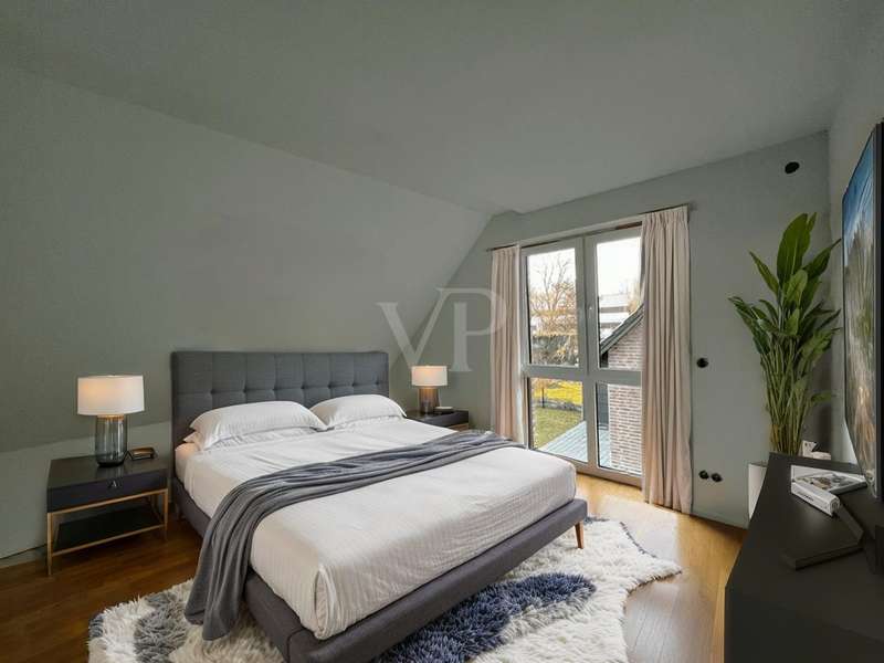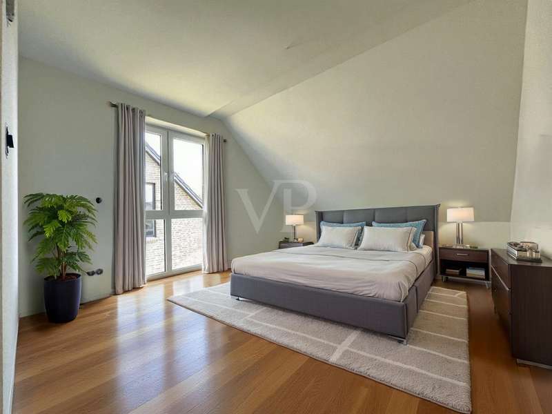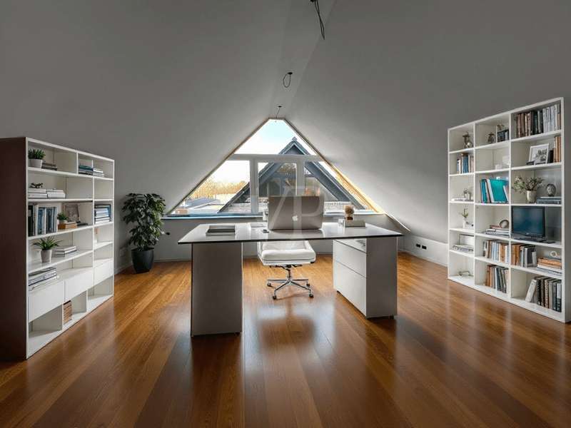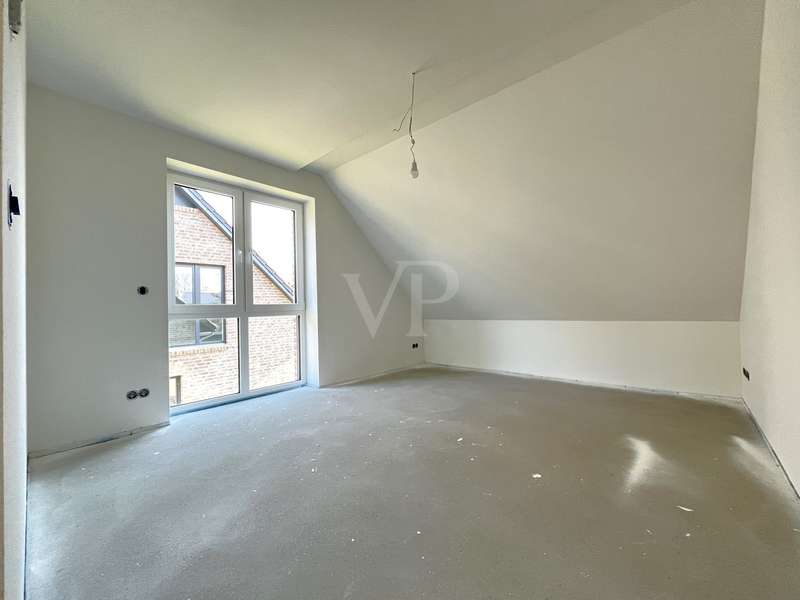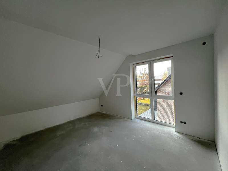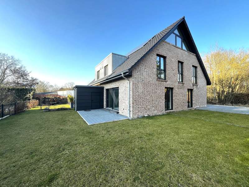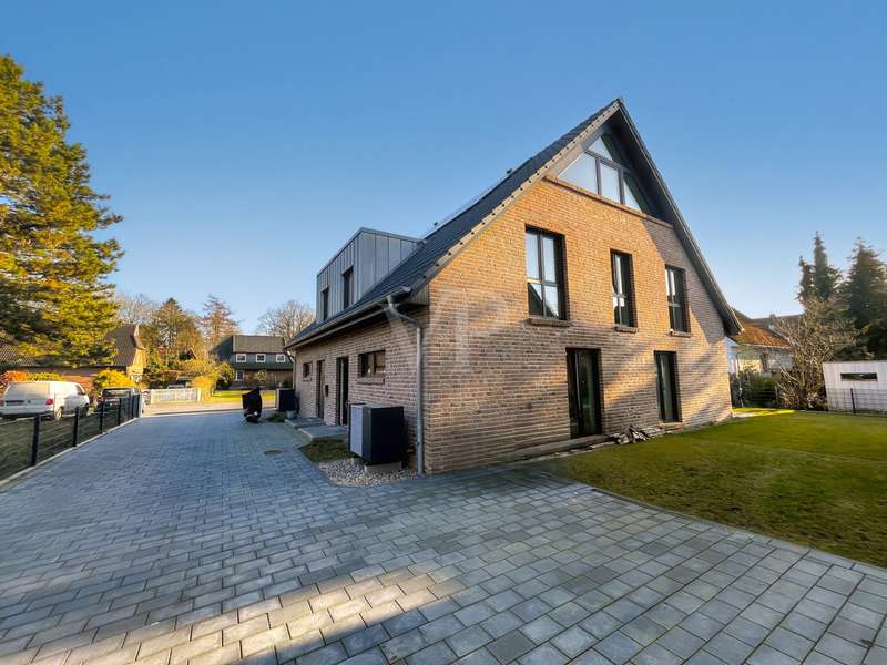 A beautifully designed KfW55 semi-detached house is for sale. Built to the highest technical standards and with outstanding craftsmanship and quality, this semi-detached house is situated on a plot of approx. 1,241 m² directly adjacent to Ahrensburg Castle Park. Three of the four semi-detached houses have already been sold and occupied - secure the last available unit now! Buyers can still specify the final features of the half on offer according to their own taste. With approx. 171 m² of living space, this solidly built 5-room wonder offers generous space for families, couples or even working from home. The interior fittings will be finalized according to your wishes and in consultation with the client. Floor coverings, sanitary fittings and paintwork including painting tiles are already included in the purchase price in the specified qualities. The only thing you would have to do yourself is the fitted kitchen, as tastes differ greatly here. Would you like a second bathroom? No problem! The house will be tailored to your complete satisfaction. The furnishings can be customized in many details - help design your new home! The particularly attractive floor plan offers plenty of living potential. Openness, brightness and sensible use of space are at the forefront here alongside the sustainable and energy-efficient design. The large attic studio with its huge window front in the gable is a particular highlight. The terrace is perfectly oriented to the south/west and promises evening sunshine at the end of the day. The plot is very easy to maintain due to its small area and has a continuous lawn. There is also a small storage room on the terrace. A maximum of two cars can be parked on the outside area. Please refer to the following page for the technical details and fittings. If you want to live generously and energetically with your family in central, yet very quiet Ahrensburg - without getting lost in gardening - this is the right place for you! See this beautiful offer for yourself at an appointment with us on site. We look forward to your inquiry.