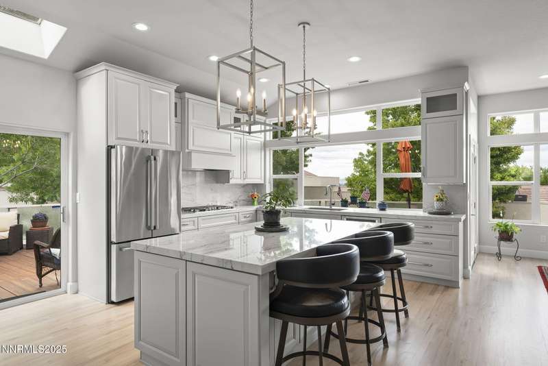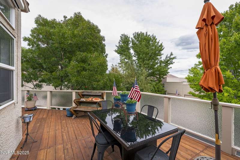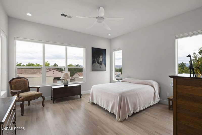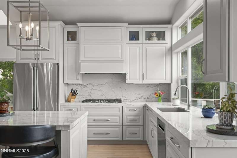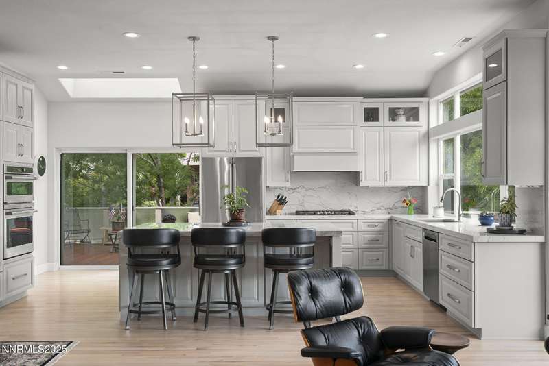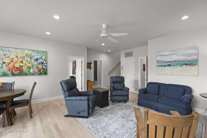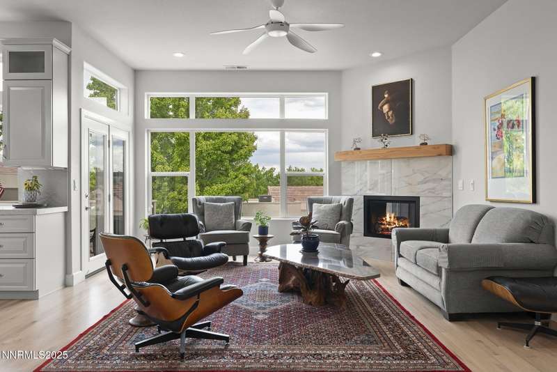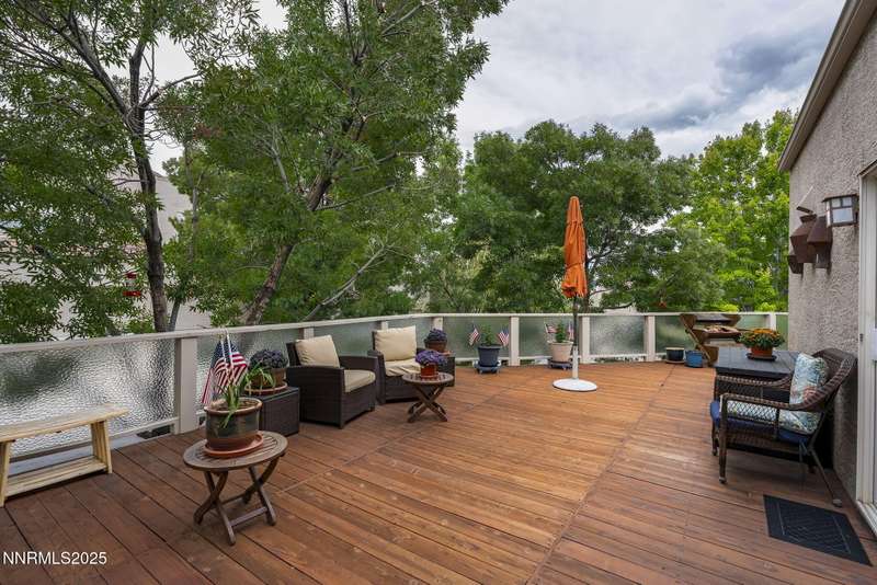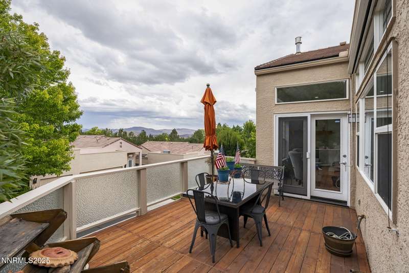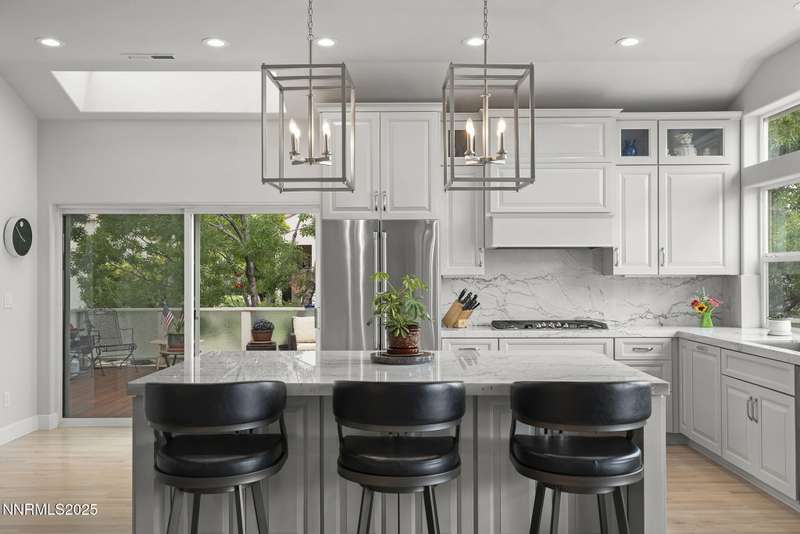 This beautifully updated three-bedroom, two-and-a-half-bathroom home underwent a major remodel in 2022 and is packed with thoughtful details and modern comforts. It is located in the private gated community of Lakeridge Shores, one of Reno's hidden gems. Perfectly situated on a desirable corner lot, it offers both privacy and style, with no true shared walls—only the deck walls adjoin the neighbor's. Abundant storage is found throughout, including a rare twelve-by-twelve-foot storage unit. Inside, you'll find red oak hardwood floors, designer lighting, and custom cabinetry. The kitchen is a true showpiece with quartzite countertops, hidden electrical outlets for a seamless look, under-cabinet lighting, and nearly all appliances replaced in 2022. A custom built-in dining room cabinet adds both elegance and functionality. The living room and primary suite are enhanced with electric UV shades for comfort and energy efficiency, while the primary bedroom is located on the main floor and the primary bathroom features a luxurious dual-head shower. The home is designed for entertaining with a massive deck upstairs and a downstairs patio complete with gas, water, and electrical hookups, creating the perfect space for an outdoor kitchen or spa. Additional highlights include dual-zone heating and air conditioning with new downstairs units installed in 2022, a circulating hot water pump replaced the same year, and a fireplace with a new mantel and stone work. The garage is equally impressive with epoxy floors, cabinets, and wiring ready for EV charging. The HOA provides front yard mowing and is scheduled to repaint the exterior around 2029, making maintenance a breeze. With high-end finishes, abundant storage, and carefully planned upgrades throughout, this home is move-in ready and truly one of a kind. There is even space for an elevator, offering the potential for an additional luxury feature in the future.
