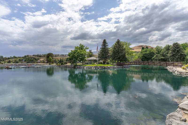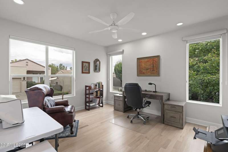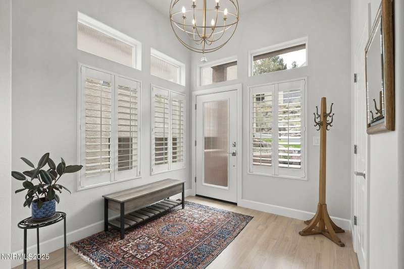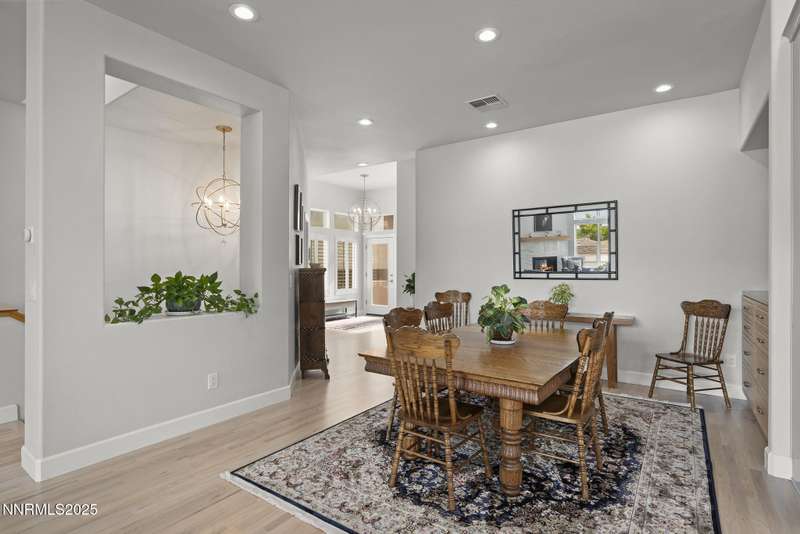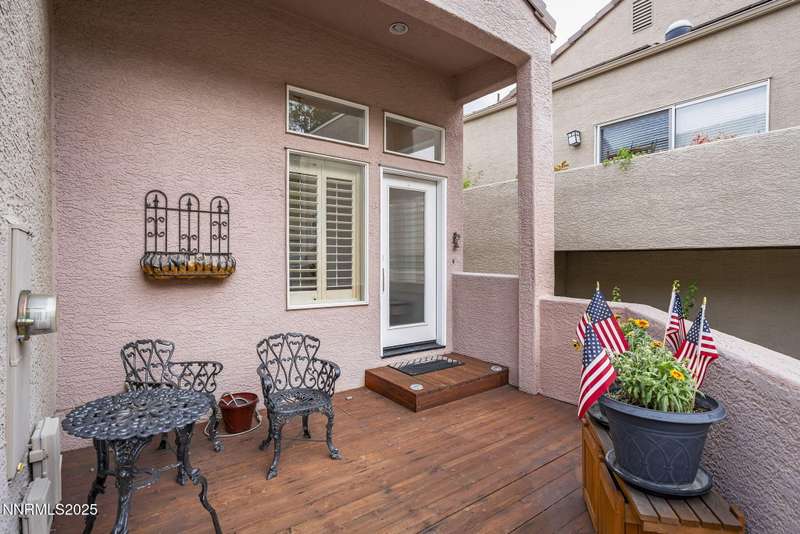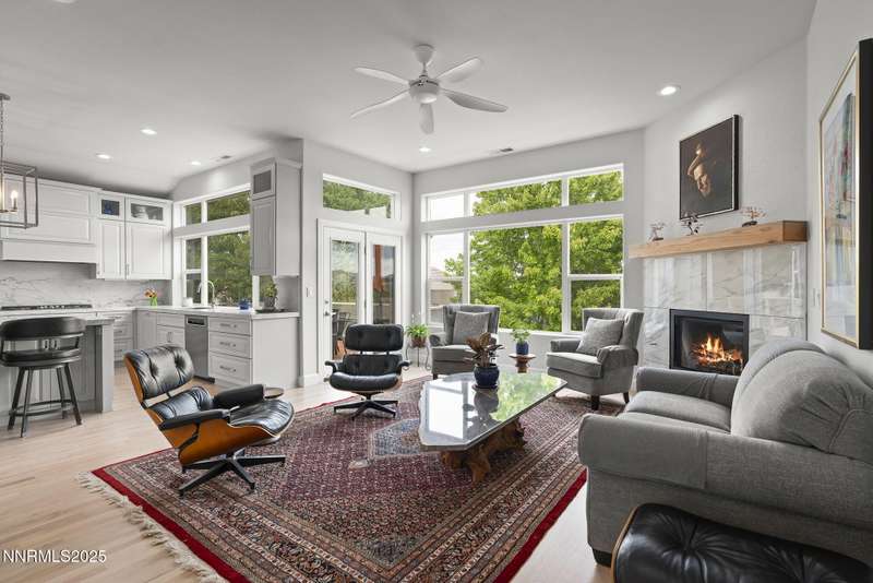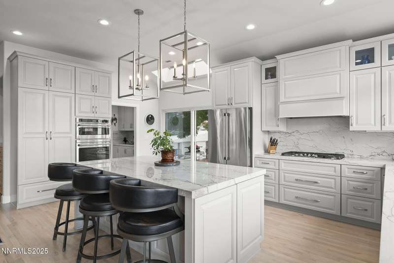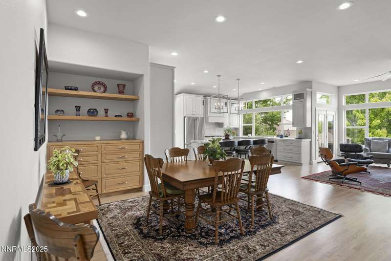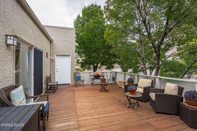 This beautifully updated three-bedroom, two-and-a-half-bathroom home underwent a major remodel in 2022 and is packed with thoughtful details and modern comforts. It is located in the private gated community of Lakeridge Shores, one of Reno's hidden gems. Perfectly situated on a desirable corner lot, it offers both privacy and style, with no true shared walls—only the deck walls adjoin the neighbor's. Abundant storage is found throughout, including a rare twelve-by-twelve-foot storage unit. Inside, you'll find red oak hardwood floors, designer lighting, and custom cabinetry. The kitchen is a true showpiece with quartzite countertops, hidden electrical outlets for a seamless look, under-cabinet lighting, and nearly all appliances replaced in 2022. A custom built-in dining room cabinet adds both elegance and functionality. The living room and primary suite are enhanced with electric UV shades for comfort and energy efficiency, while the primary bedroom is located on the main floor and the primary bathroom features a luxurious dual-head shower. The home is designed for entertaining with a massive deck upstairs and a downstairs patio complete with gas, water, and electrical hookups, creating the perfect space for an outdoor kitchen or spa. Additional highlights include dual-zone heating and air conditioning with new downstairs units installed in 2022, a circulating hot water pump replaced the same year, and a fireplace with a new mantel and stone work. The garage is equally impressive with epoxy floors, cabinets, and wiring ready for EV charging. The HOA provides front yard mowing and is scheduled to repaint the exterior around 2029, making maintenance a breeze. With high-end finishes, abundant storage, and carefully planned upgrades throughout, this home is move-in ready and truly one of a kind. There is even space for an elevator, offering the potential for an additional luxury feature in the future.