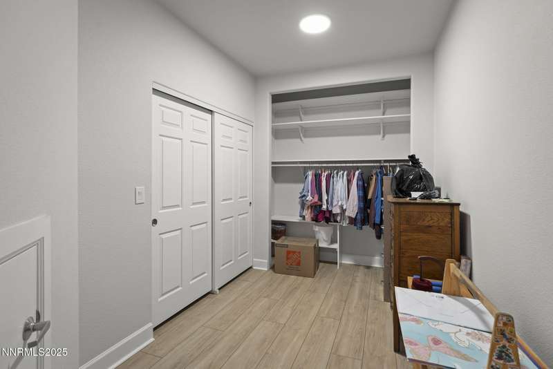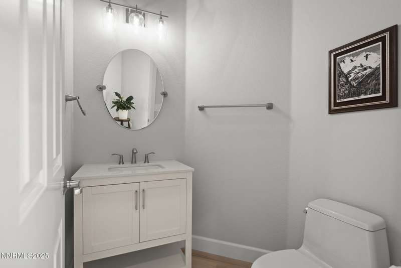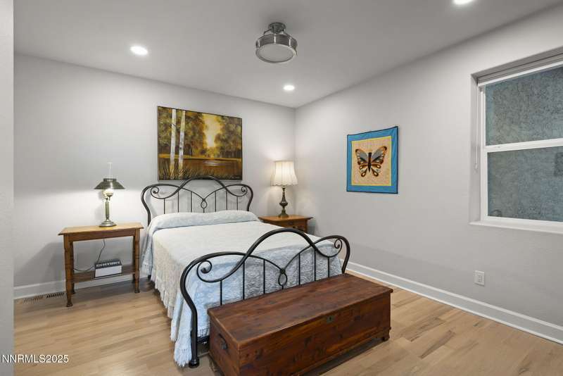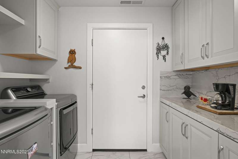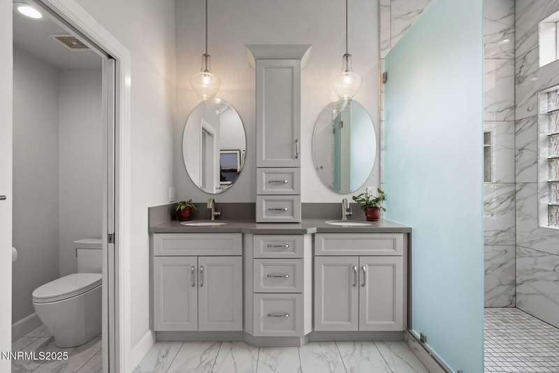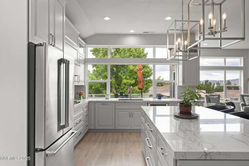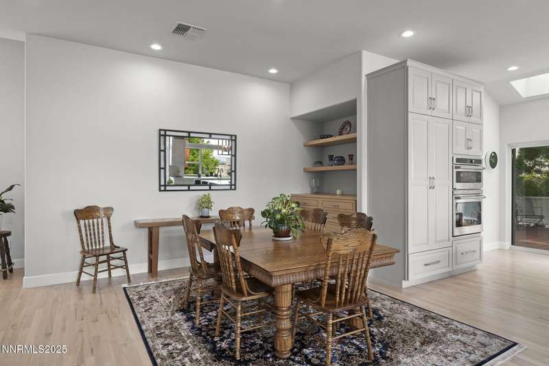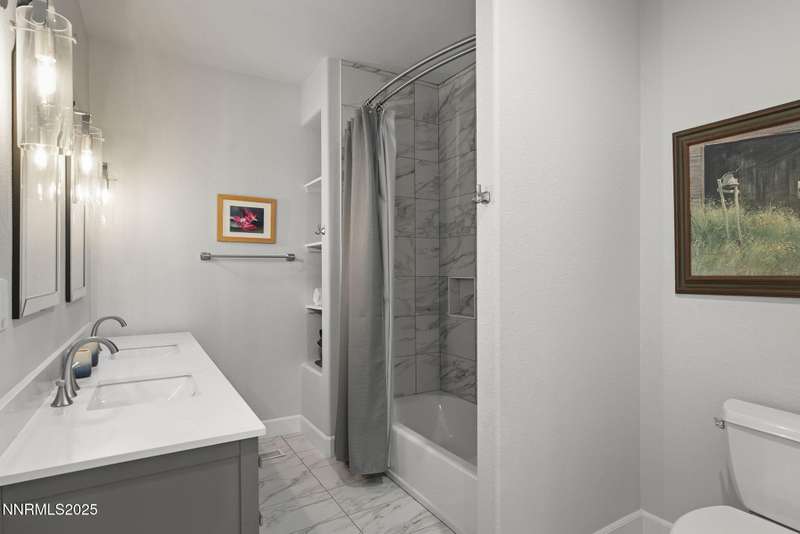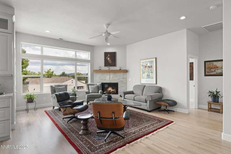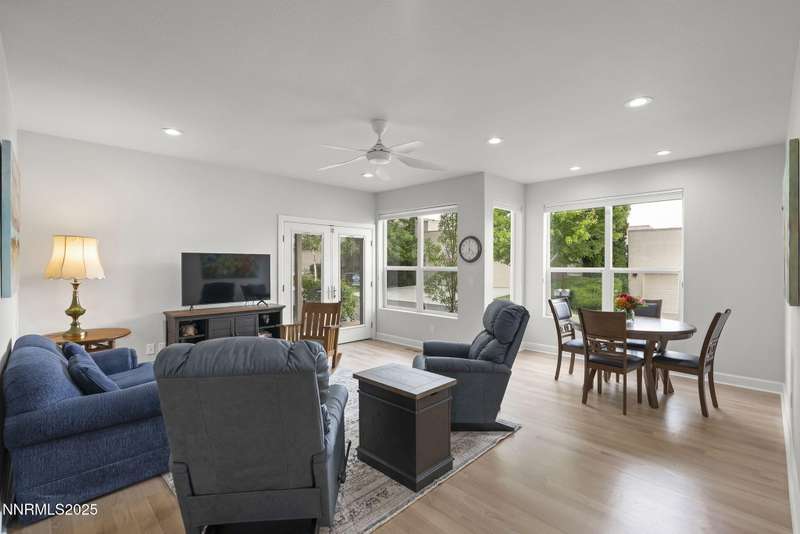 This beautifully updated three-bedroom, two-and-a-half-bathroom home underwent a major remodel in 2022 and is packed with thoughtful details and modern comforts. It is located in the private gated community of Lakeridge Shores, one of Reno's hidden gems. Perfectly situated on a desirable corner lot, it offers both privacy and style, with no true shared walls—only the deck walls adjoin the neighbor's. Abundant storage is found throughout, including a rare twelve-by-twelve-foot storage unit. Inside, you'll find red oak hardwood floors, designer lighting, and custom cabinetry. The kitchen is a true showpiece with quartzite countertops, hidden electrical outlets for a seamless look, under-cabinet lighting, and nearly all appliances replaced in 2022. A custom built-in dining room cabinet adds both elegance and functionality. The living room and primary suite are enhanced with electric UV shades for comfort and energy efficiency, while the primary bedroom is located on the main floor and the primary bathroom features a luxurious dual-head shower. The home is designed for entertaining with a massive deck upstairs and a downstairs patio complete with gas, water, and electrical hookups, creating the perfect space for an outdoor kitchen or spa. Additional highlights include dual-zone heating and air conditioning with new downstairs units installed in 2022, a circulating hot water pump replaced the same year, and a fireplace with a new mantel and stone work. The garage is equally impressive with epoxy floors, cabinets, and wiring ready for EV charging. The HOA provides front yard mowing and is scheduled to repaint the exterior around 2029, making maintenance a breeze. With high-end finishes, abundant storage, and carefully planned upgrades throughout, this home is move-in ready and truly one of a kind. There is even space for an elevator, offering the potential for an additional luxury feature in the future.